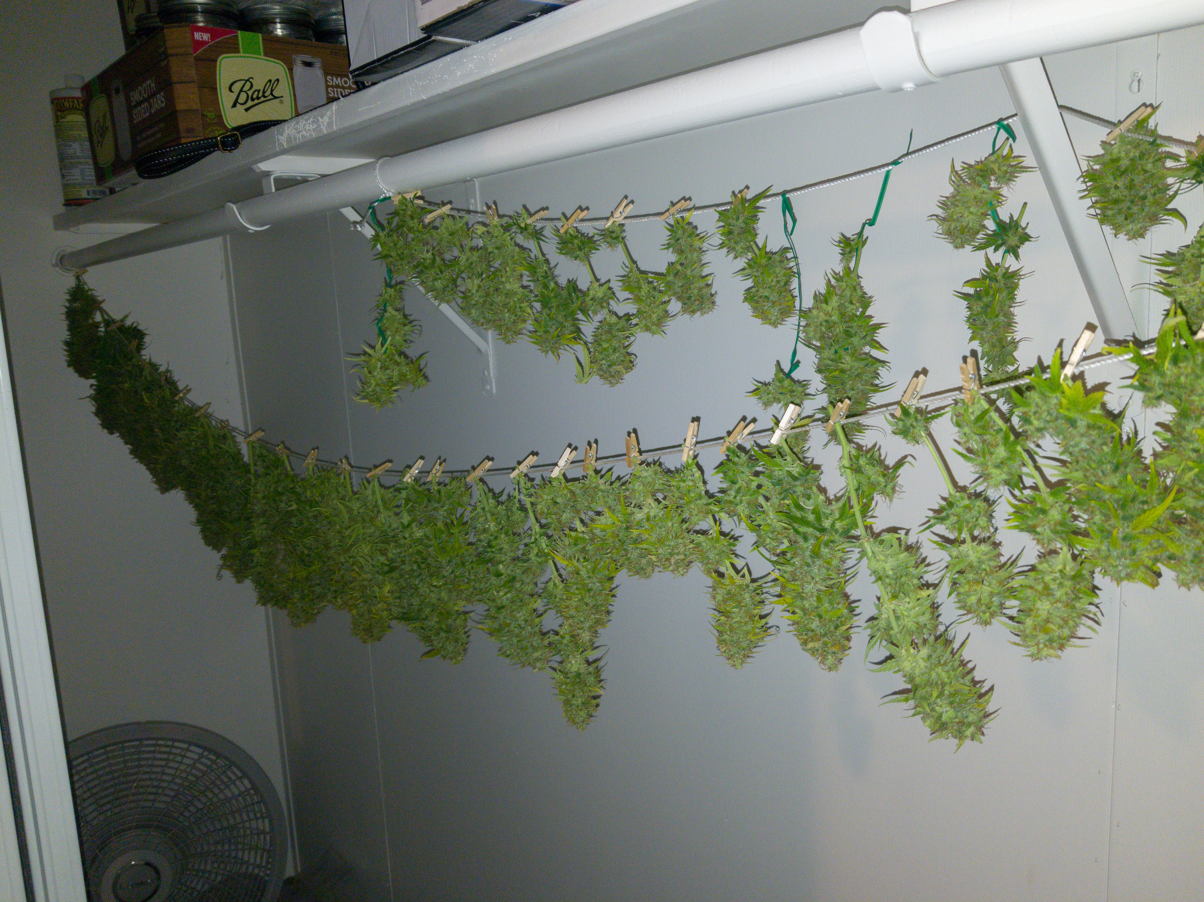 Today was chop day! Day 84 from sprout. Pics are the biggest bug and he all the big nugs. Didnt take to many pics lol. All are hung in a closet with a big ol fan underneath em, swaying in the breeze. That one nug was 40g, wet of course. Was he only one I weighed.