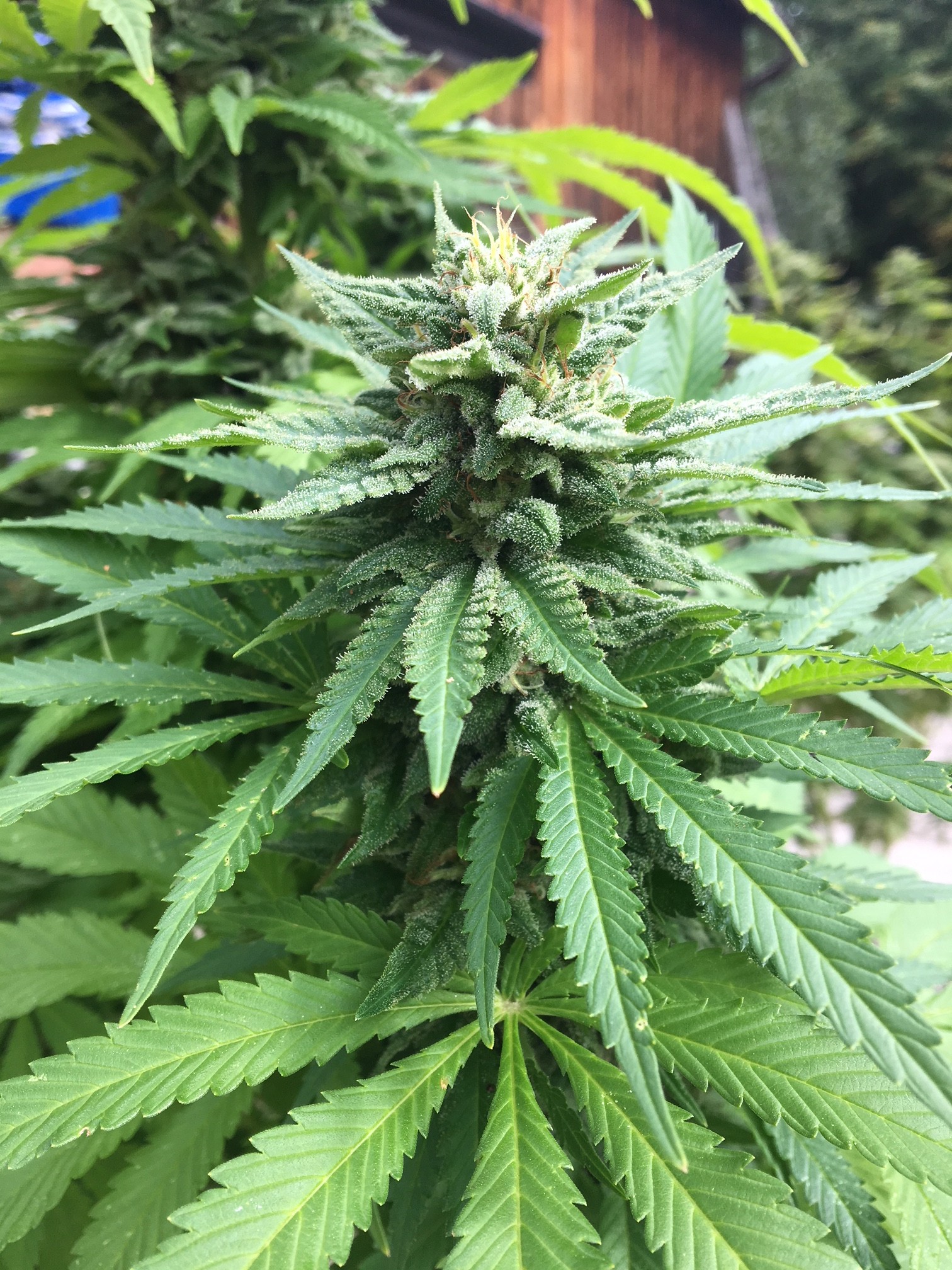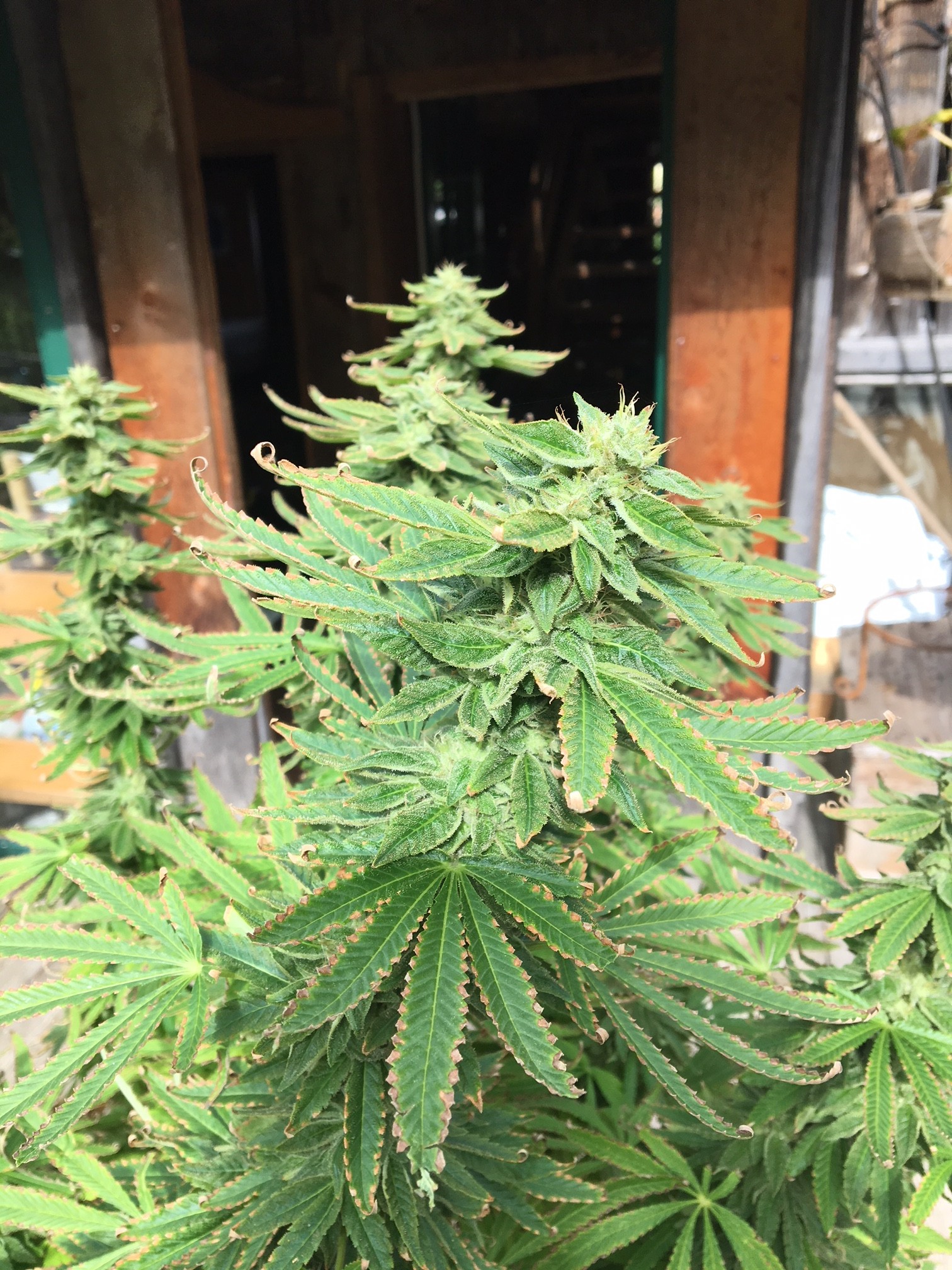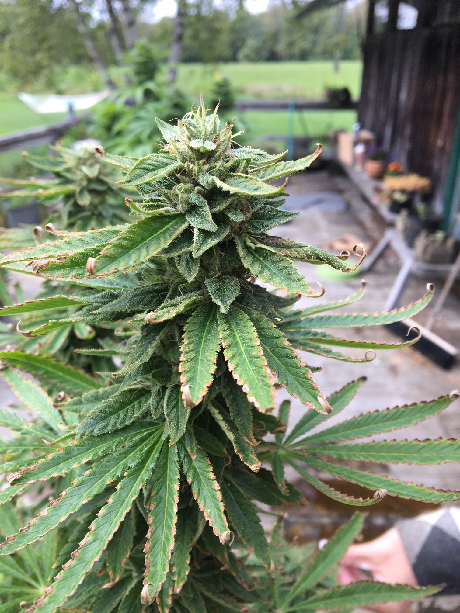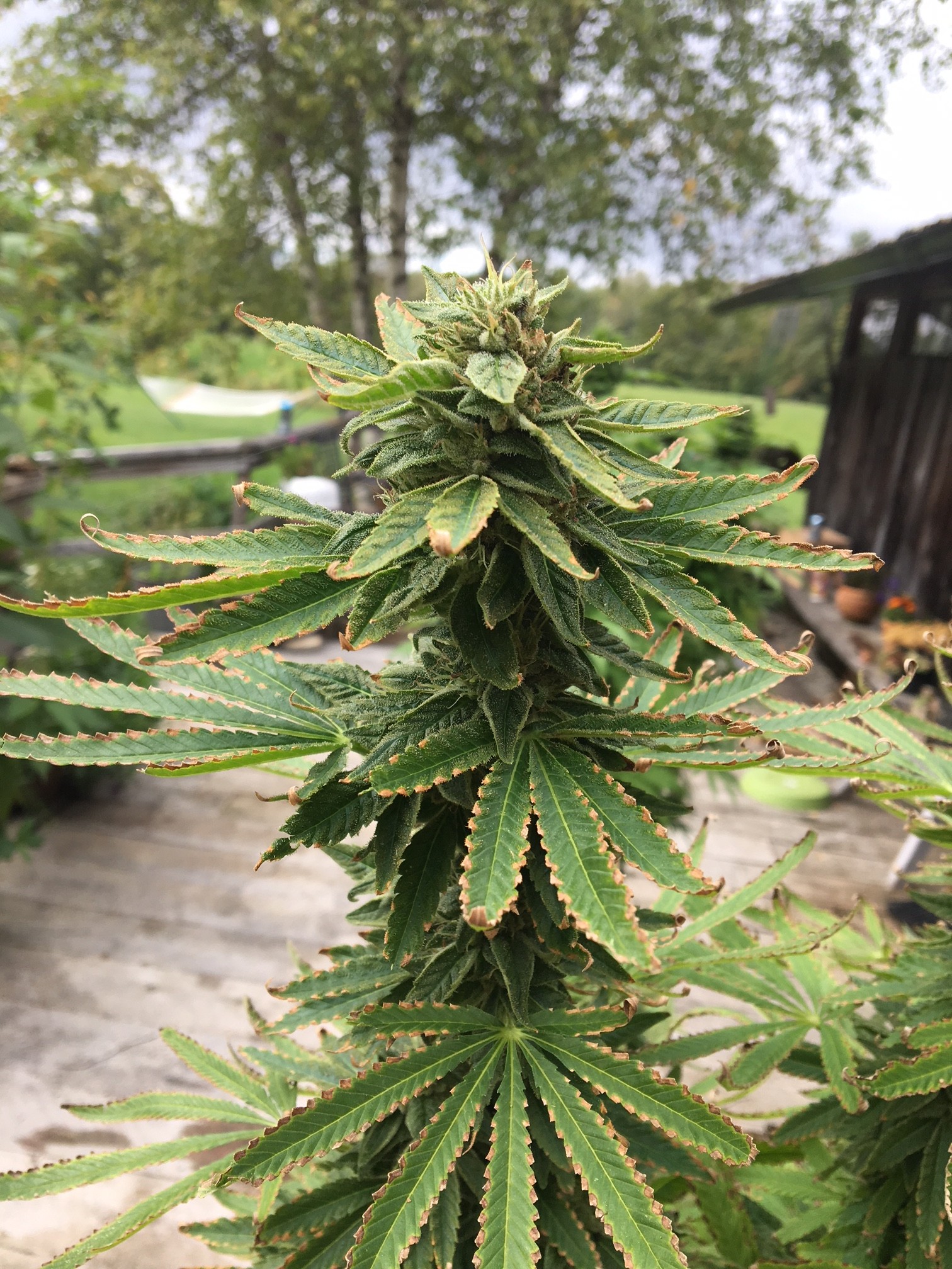 Growing a couple outdoor 1:1 CBD/THC plants (Frosted Cookies). About 4 weeks into flowering a big mistake was made. One of the plants (the runt of the two) was given about a pint of water from the wrong water pail. Sadly the water in this pail had borax in it, but not in a dilution like would be beneficial for plants, but in a dilution that is used to treat timbers to get rid of pests. No bueno. Anyway the plant within a day or two showed heavy nute/chem burn signs (browned leaf edges, turning curled up tips). Once this was realized (a day or so later) the plant was heavily flushed with water. Things have mostly stabilized over the past 2 weeks or so, with the plant surviving (or at least not dying as fast). But it can be seen the trichomes that were on some leaves by the buds have gone brown themselves. In a natural cycle my guess is we'd have about 2 weeks left until harvest.