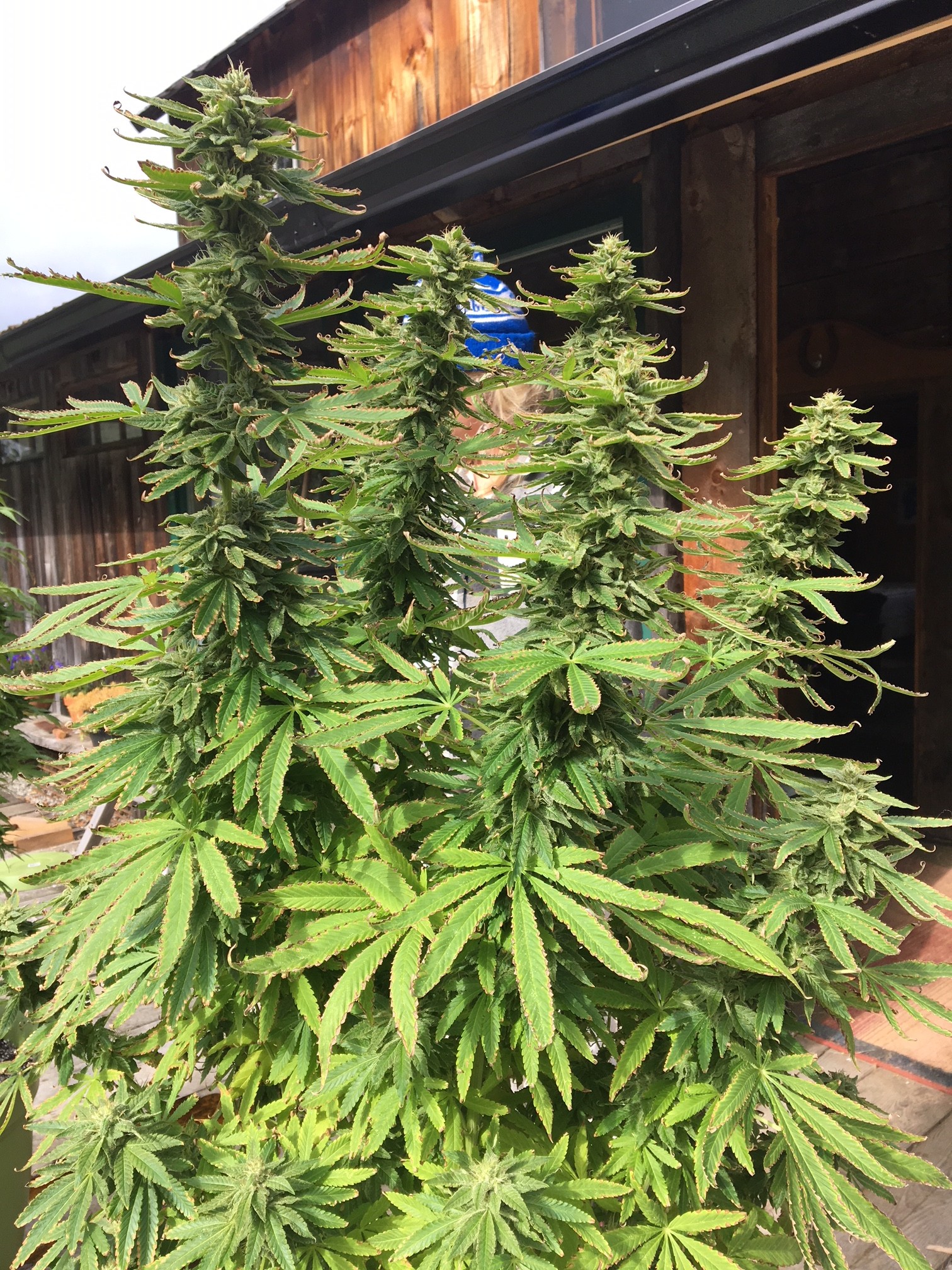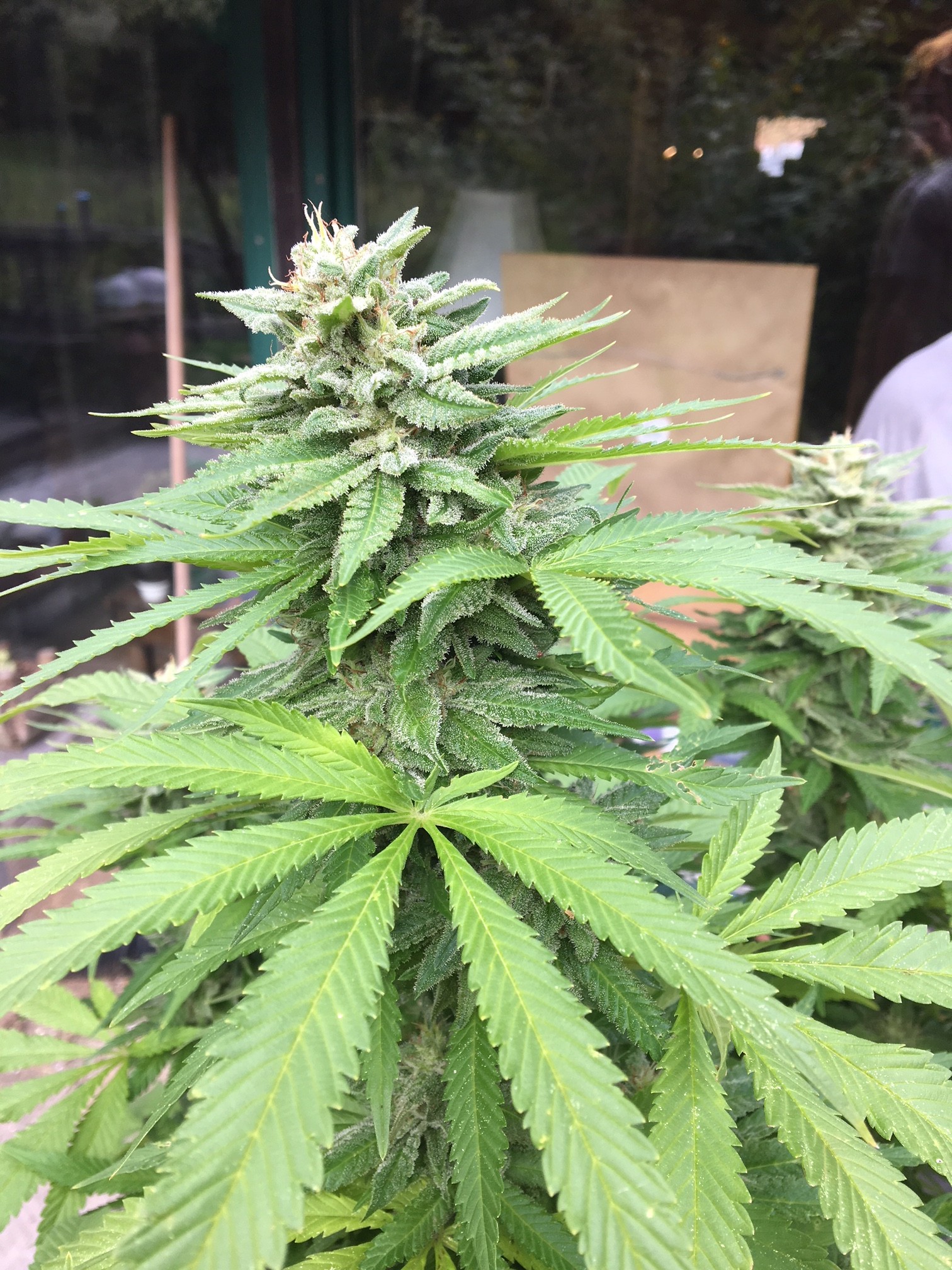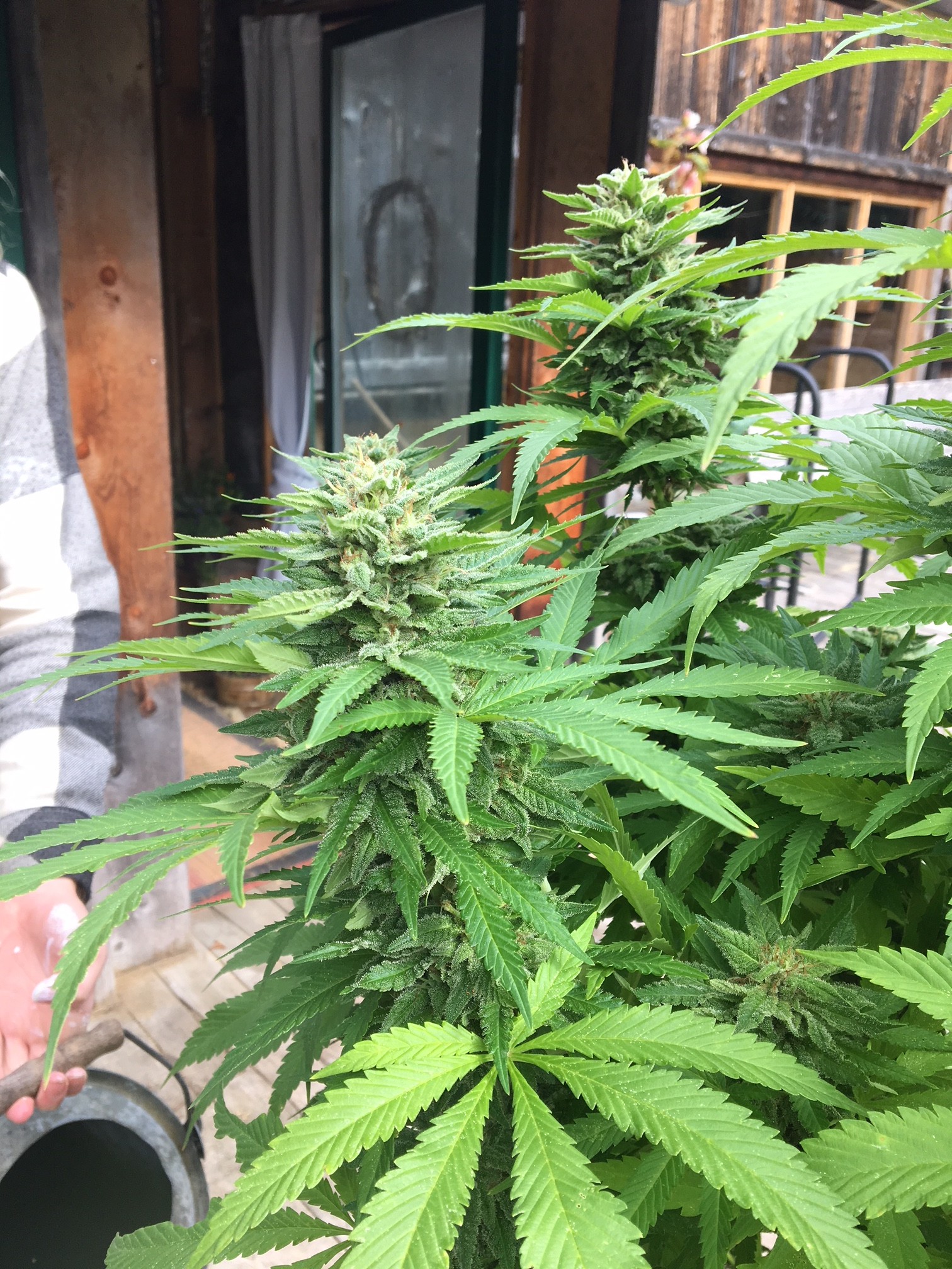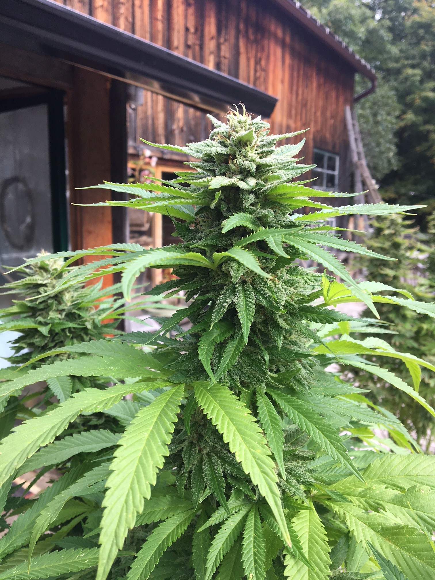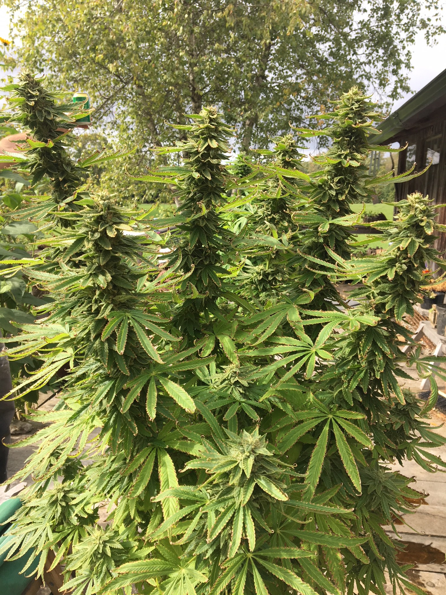 Growing a couple outdoor 1:1 CBD/THC plants (Frosted Cookies). About 4 weeks into flowering a big mistake was made. One of the plants (the runt of the two) was given about a pint of water from the wrong water pail. Sadly the water in this pail had borax in it, but not in a dilution like would be beneficial for plants, but in a dilution that is used to treat timbers to get rid of pests. No bueno. Anyway the plant within a day or two showed heavy nute/chem burn signs (browned leaf edges, turning curled up tips). Once this was realized (a day or so later) the plant was heavily flushed with water. Things have mostly stabilized over the past 2 weeks or so, with the plant surviving (or at least not dying as fast). But it can be seen the trichomes that were on some leaves by the buds have gone brown themselves. In a natural cycle my guess is we'd have about 2 weeks left until harvest.
