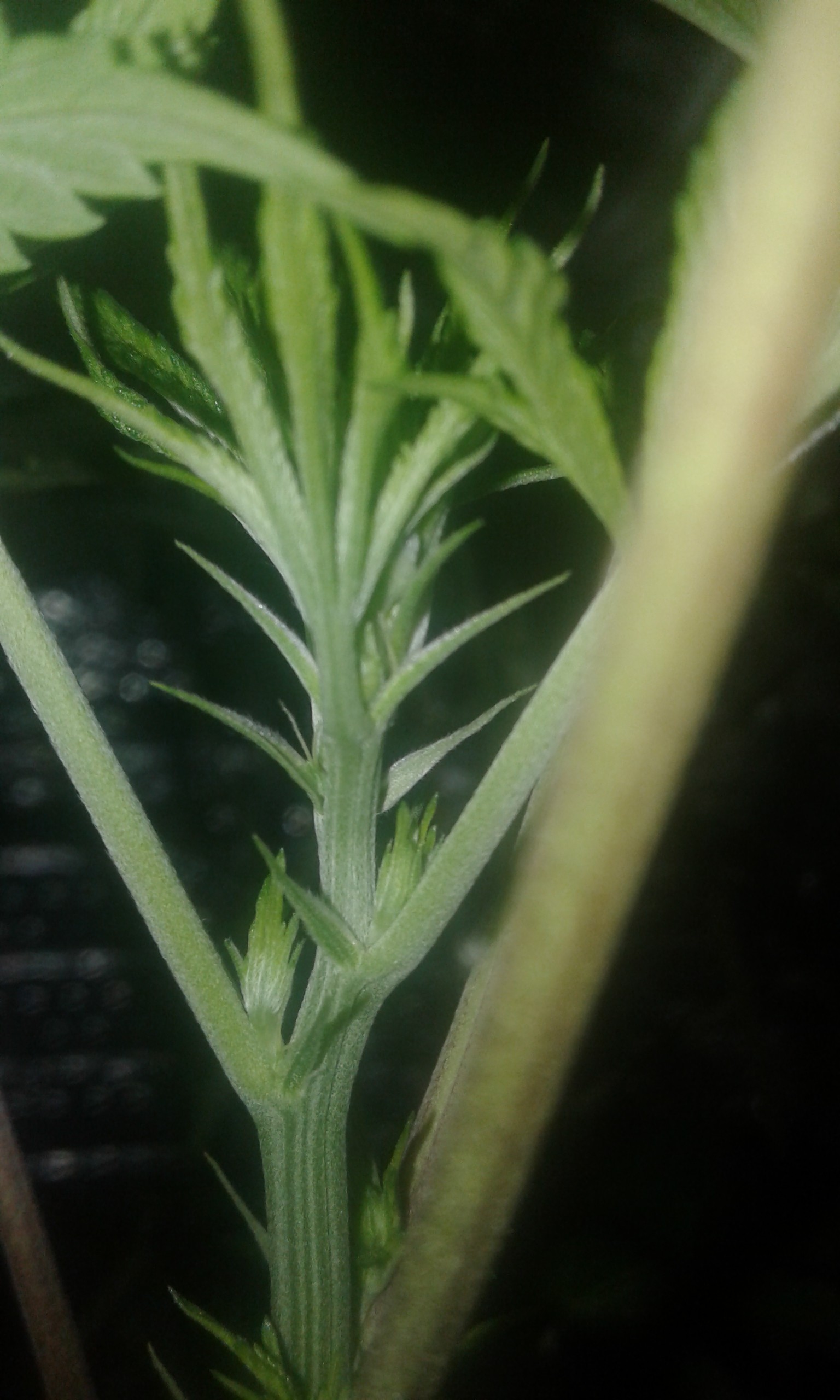 So she, yes SHE, finally showed her sex. I had a feeling it was going to happen today and sure enough i opened my box and there they were...pistols!! So stoked. Hard to see in the pic but you can see the one on the left side of the main. I need to get a loop so i can get close. But its confirmed! I need to invest in some bloom nutes asap!!!