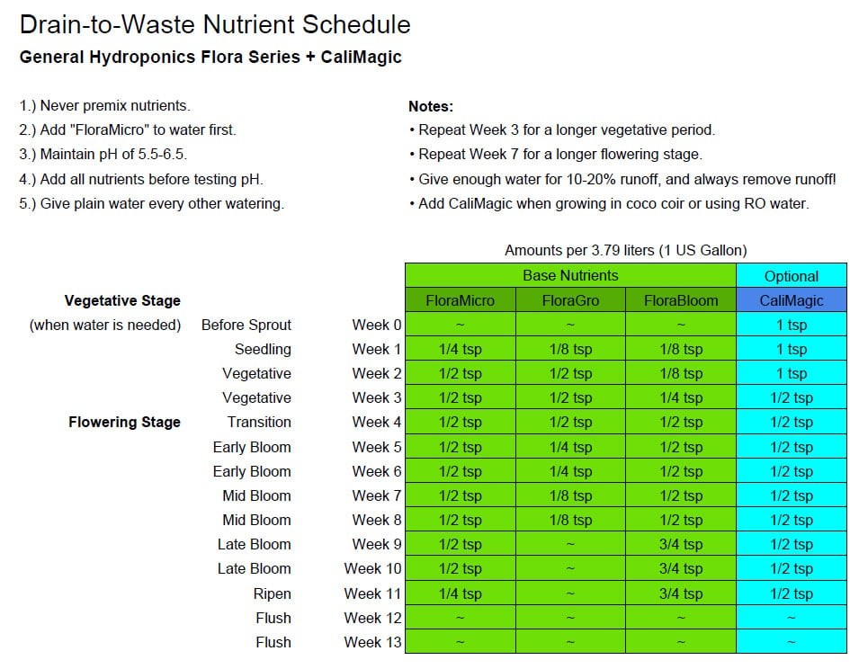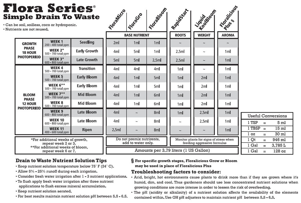 Found 4 different Feeding charts like: original GHE for drain-to-waste mediums, Growweedeasy chart (GWE), Lucas formula and Tableau K.