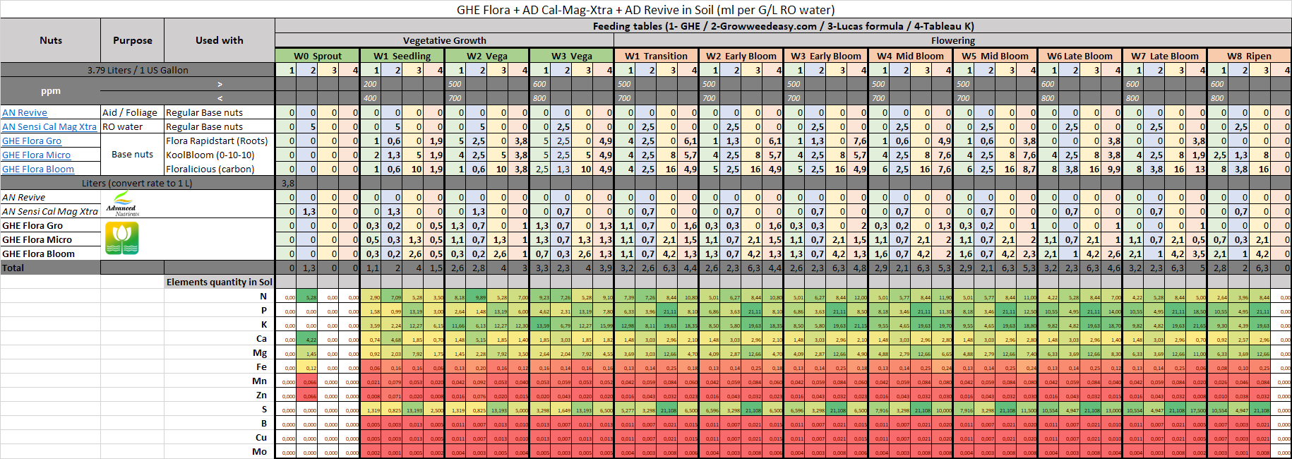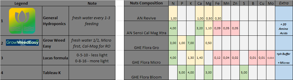 I've made a kind of comparison of these feeding tables to make my mind on what to choose and for better understanding - found Tableau K schedule as interesting, but looks like GHE & GWE recommend lower dosages and the thing I liked - GWE combines it with Cal-Mag.