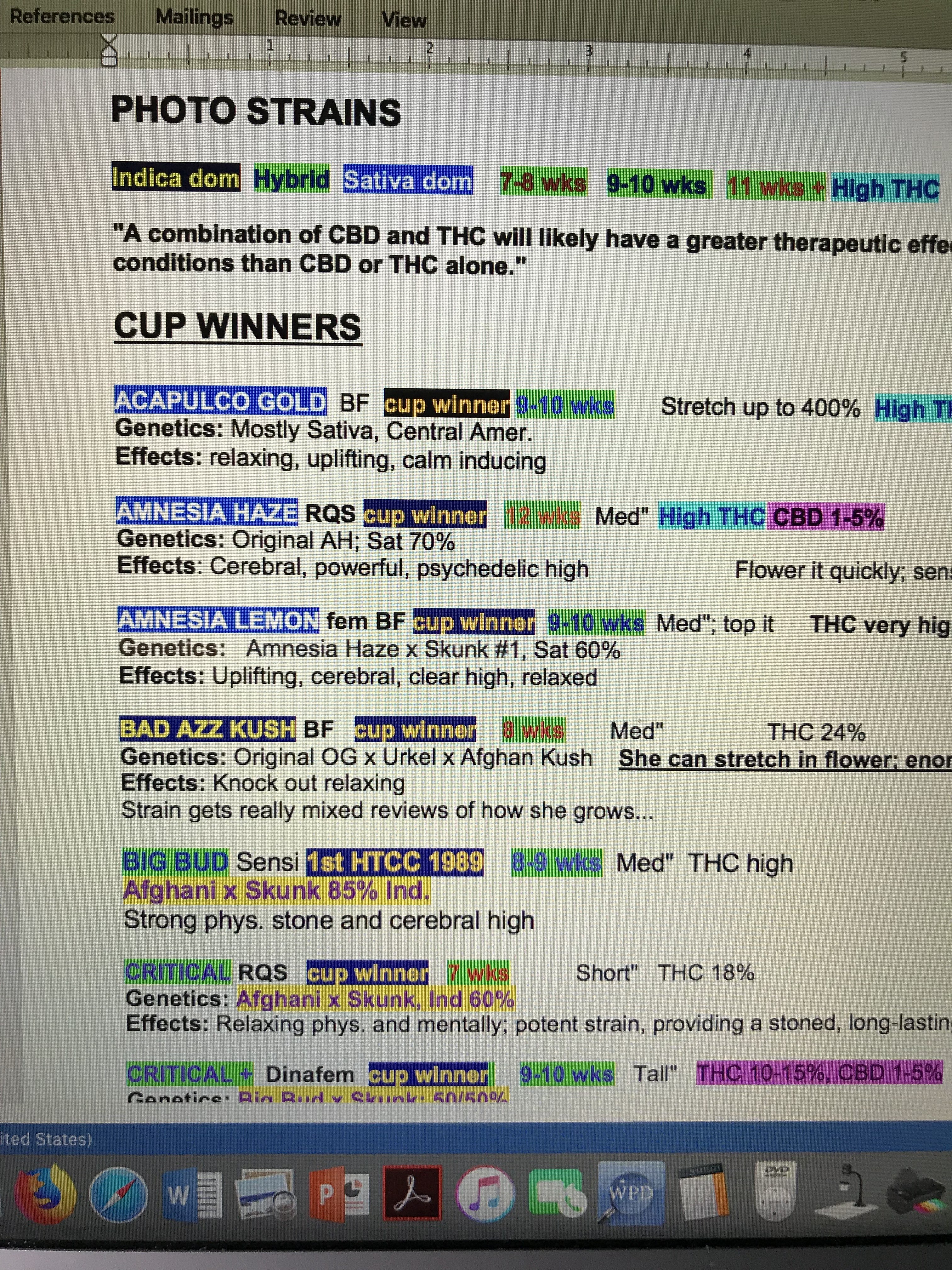 the four strains, genetics, weeks in flower, any caveats like "low nutes," %THC and CBD;