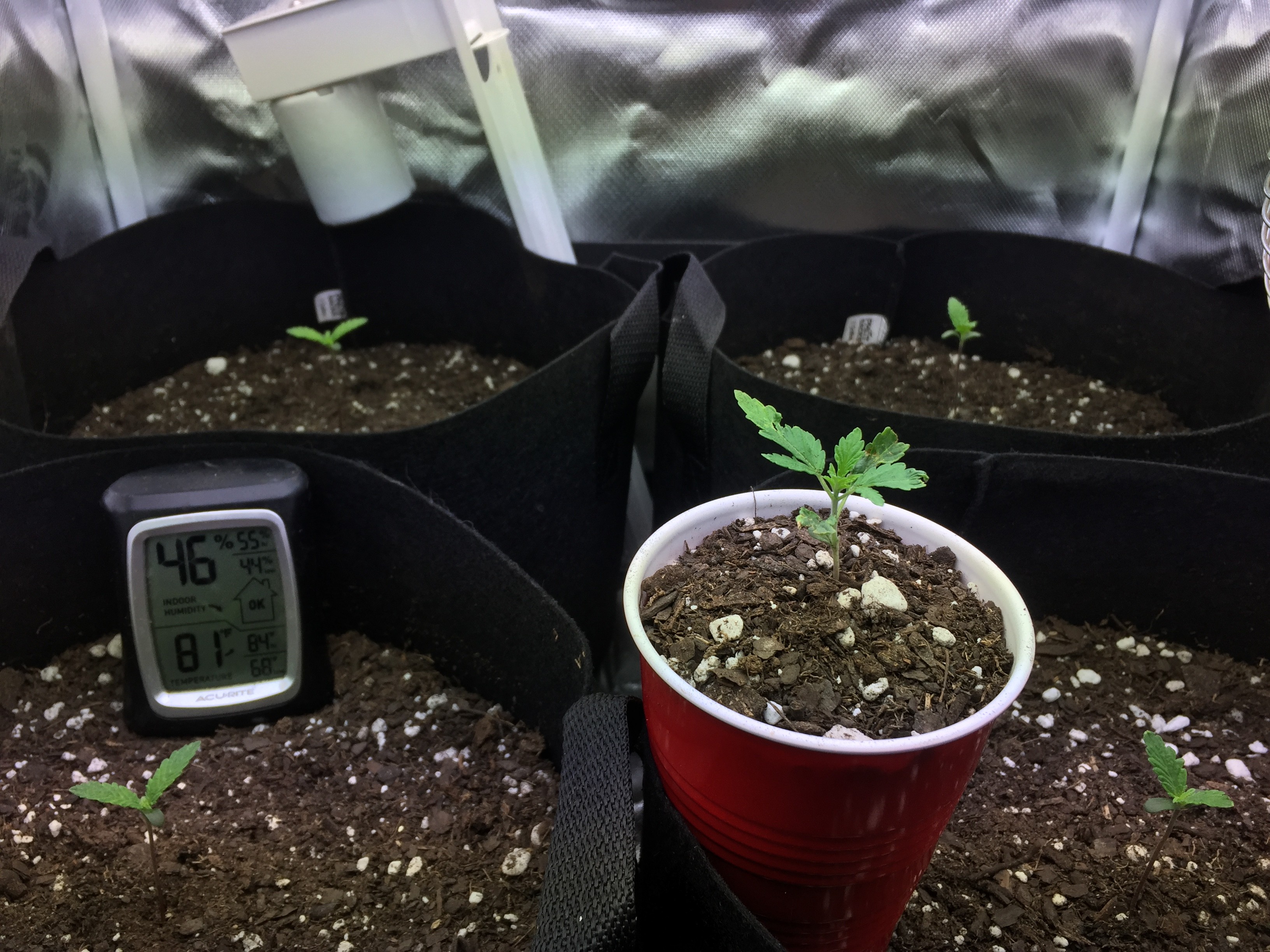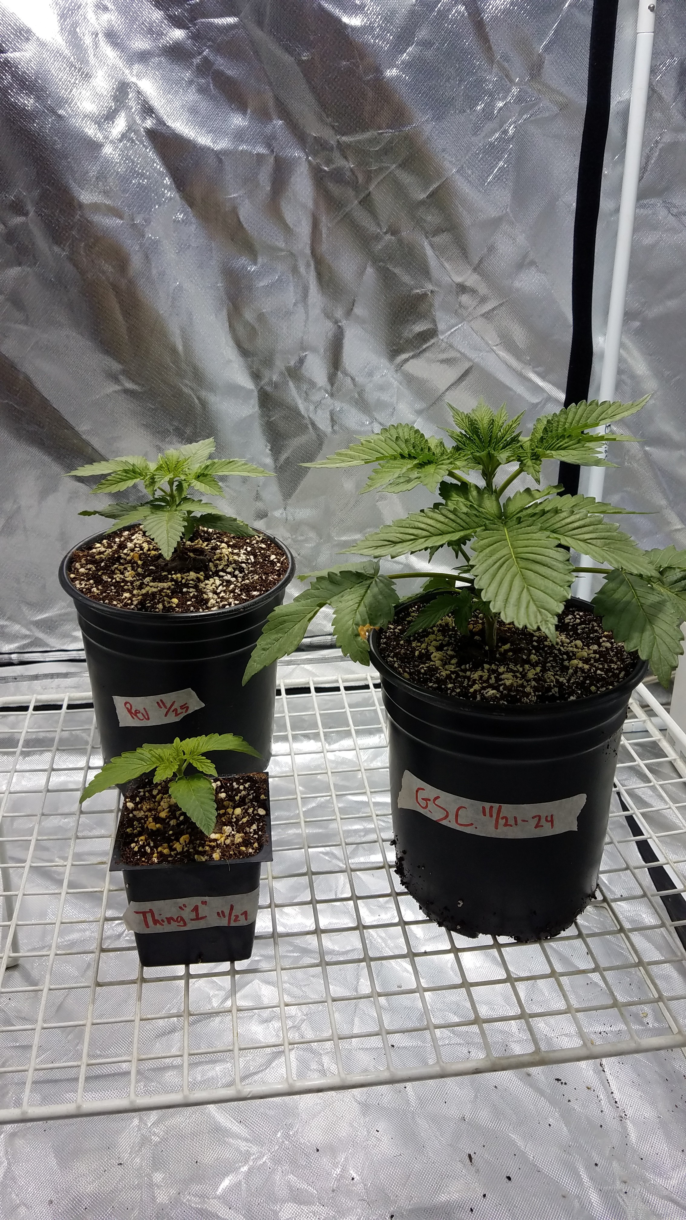 Day 7 and we’re chugging along. Seem a little stretchy. But no worries. Started feeding 1/2 strength Big Bloom on 12/12/18. Temps and humidity moderate but had a slight fluctuation while I was away over night (didn’t have heater on). Under 20/4 t5s. I still can’t decide if I’m going to use my MH. Not sure that it will be worth it. Maybe someone can chime in that would know (auto specific). Also, you’ll see my photoperiod GSC. I kept her in there just to see what would happen after my cat tried to eat it and it has started to grow new nodes and everything. Haha. So I really don’t know what to do with it. May just gift it. Anyways, here’s the girls.