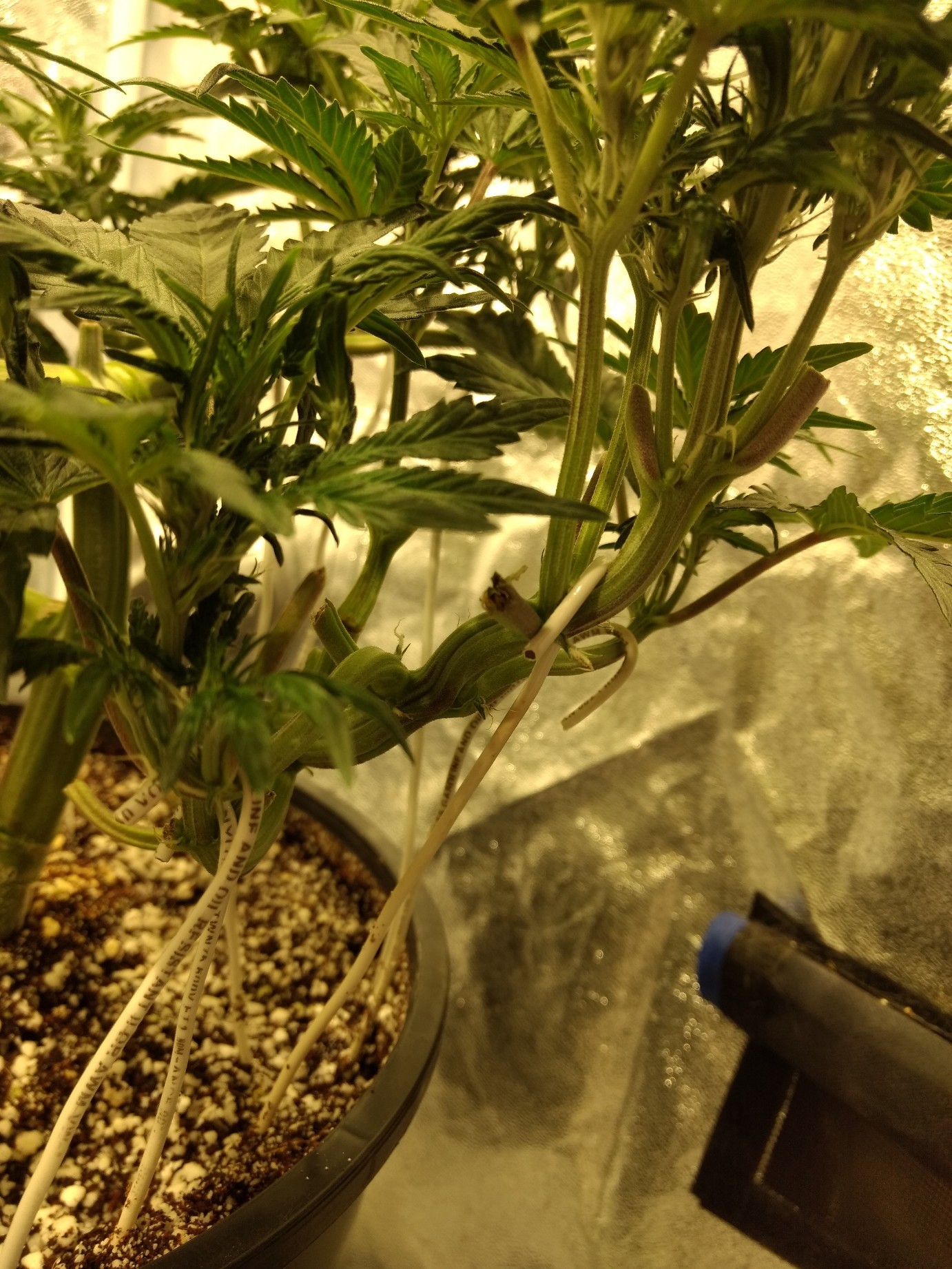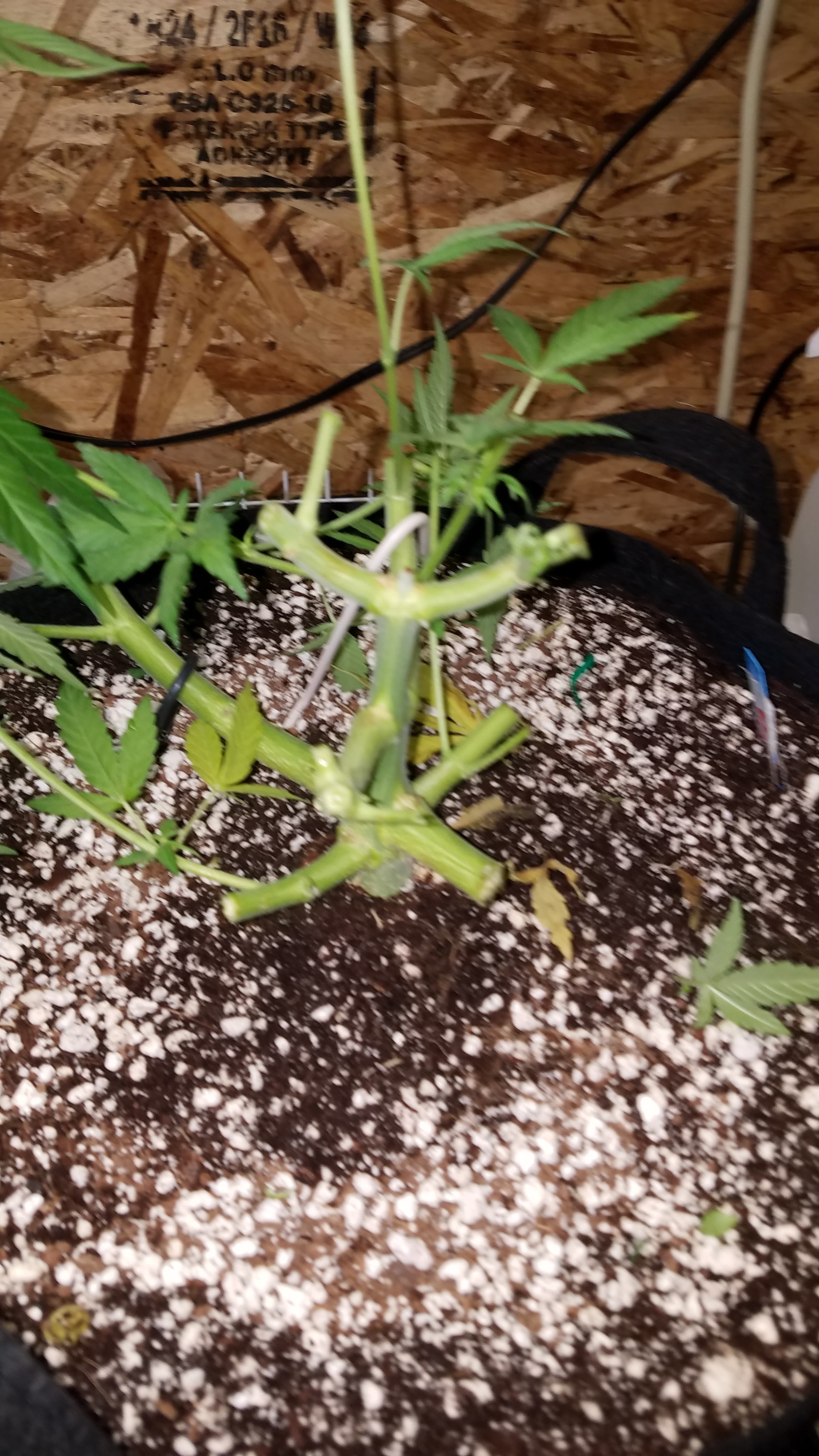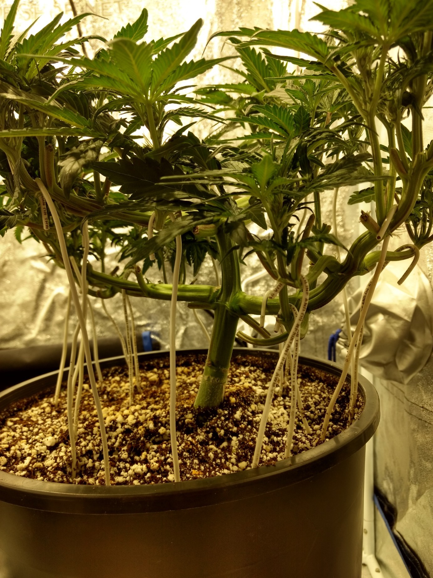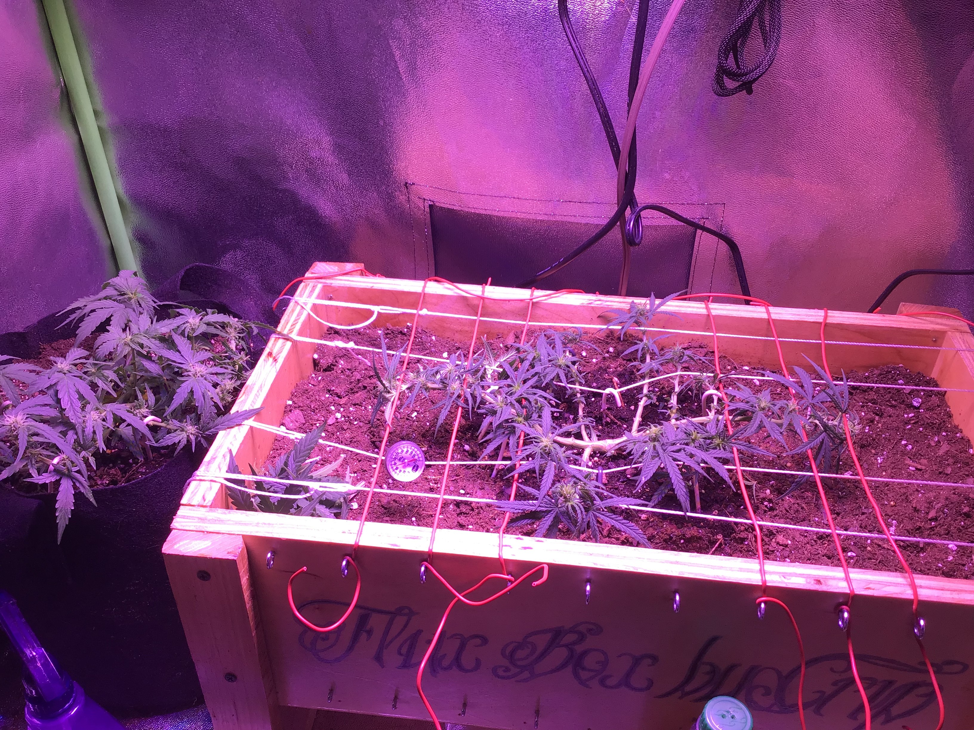 Yeah, so I did a update yesterday, but figured I’d do one today too. I had to add the other training ropes to my flux box and do some trimming and more training to both. Just like I had told OJH and Doug, if you go this route you have to stay on them all the time! After trimming JR I tried to get some good shots of how she’s done. I’ve referred to her as a spider crab. All the main stalks on her are about 1” or less off the soil and training her branches low too. If I had more soil in my flux box when I started she’d be the same way. Main stalk on JR is about 1/2” and branches are 3/8” or so. She was topped after second node and should produce some monsters.