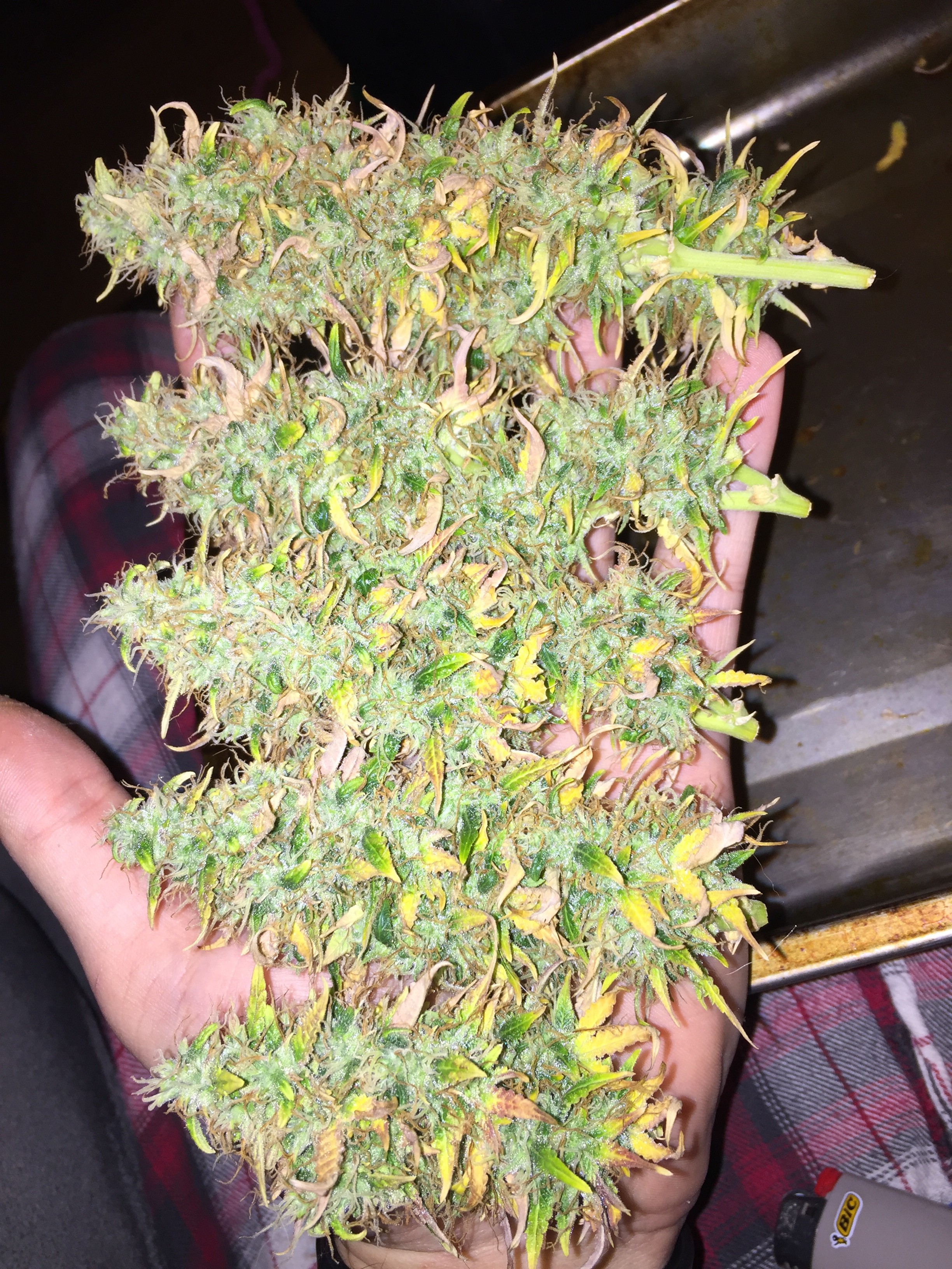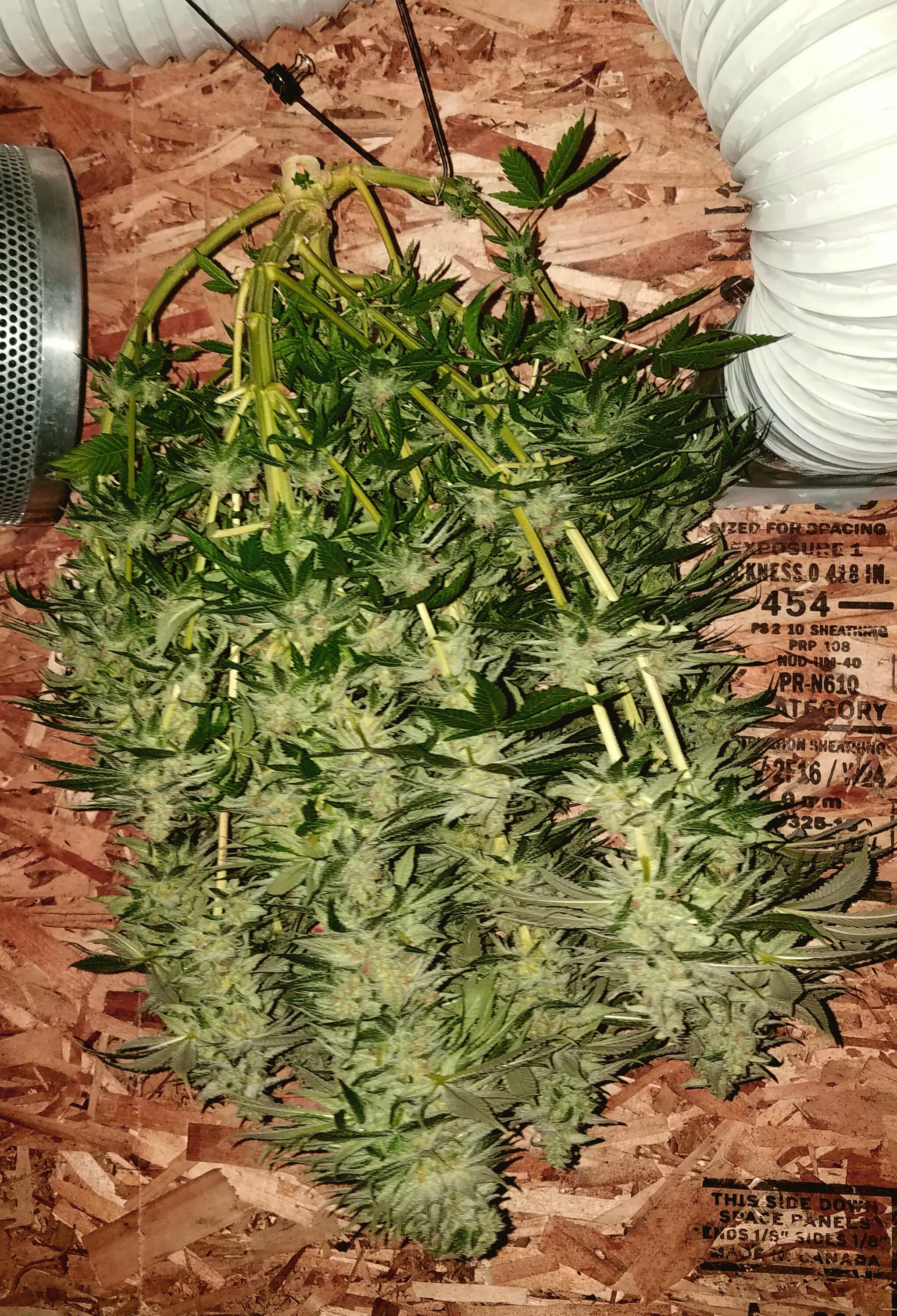 So the potential harvester was right on. I busted out the scope and checked all the mains and they were all showing about 5-10% amber trichs. Or I guess that’s a close percentage. Lol hell I saw more than one amber on more than one calyx so I took 5 big mains off the top. Left the rest in the tent to see if it’ll finish. But the ones I took were super ready. Fixing to hang to dry and should be ready go jar when I get back Monday! At least I have a little to try first. Oh and it came out to 56 grams exactly lol. So I should expect 1/3 dried right? Just trying to calculate I might have all together. Happy growing. Juicy.