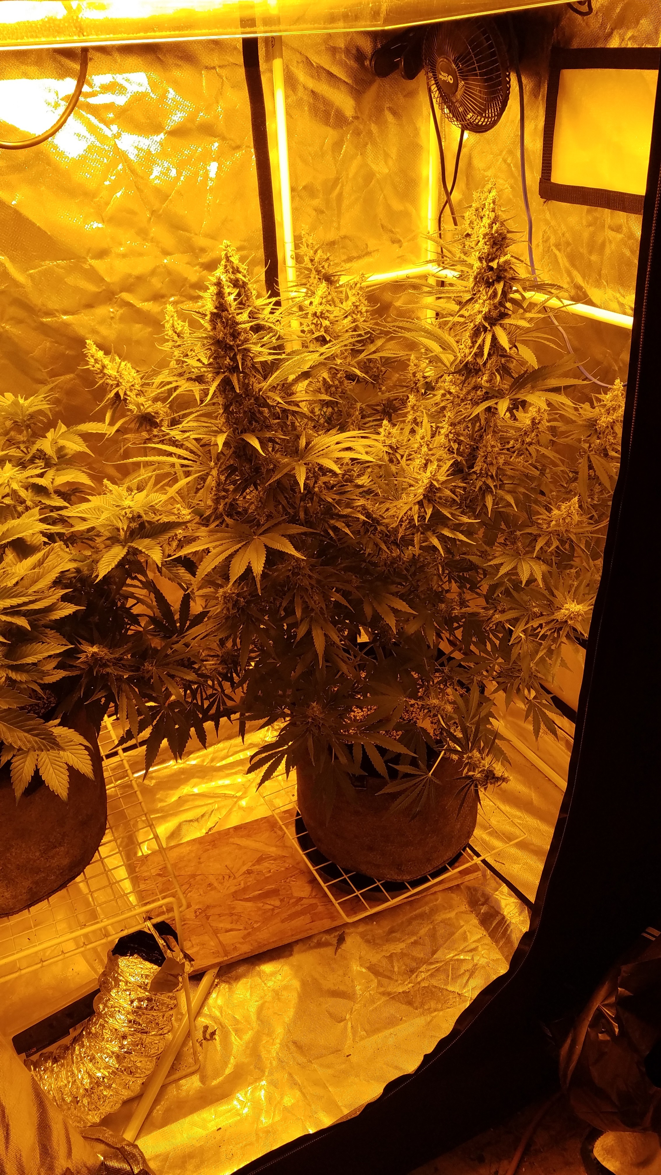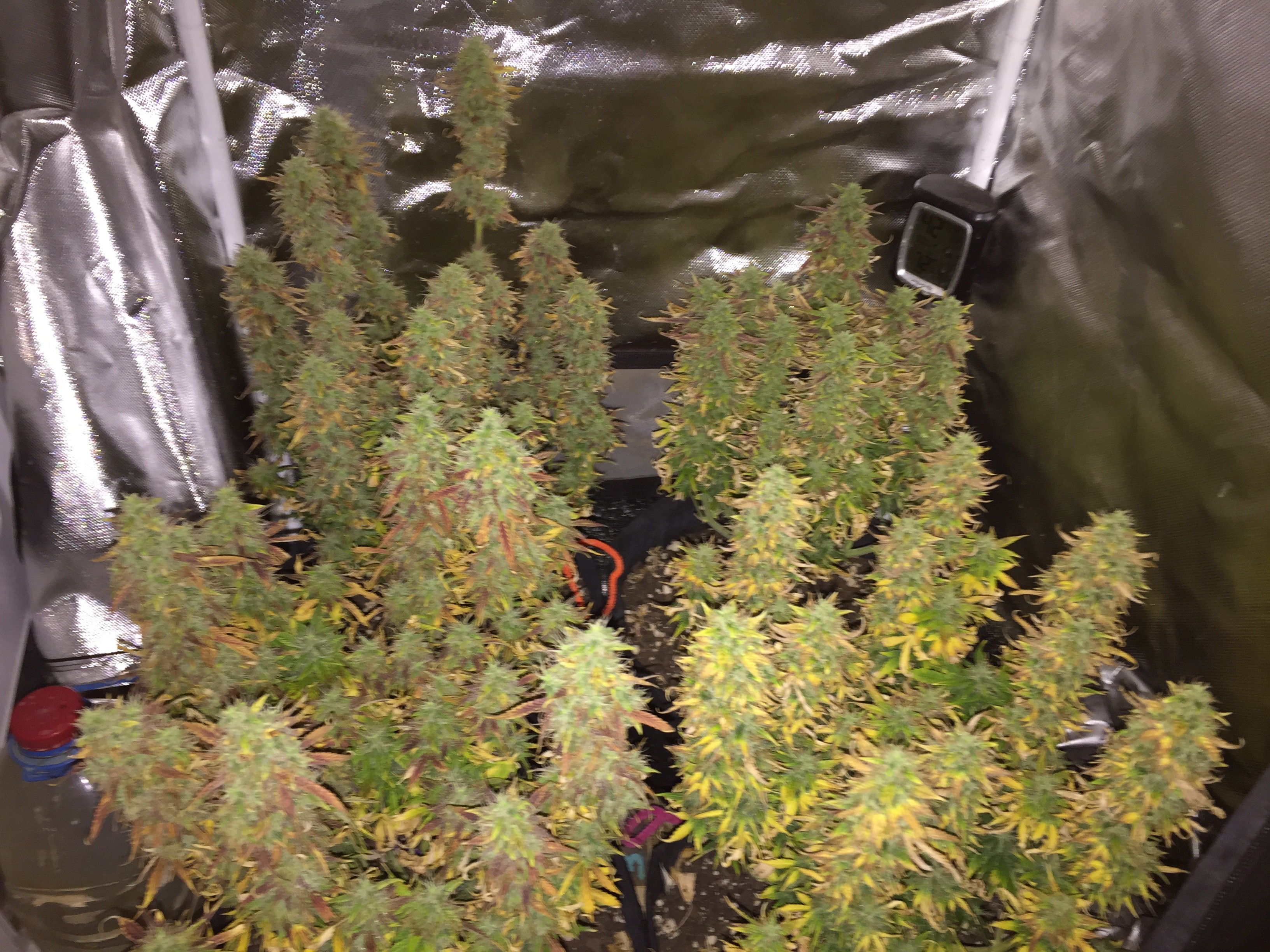 IS STILL A BIT OUT, SHE WAS PLANTED A WEEK LATER (11/27) trying to be as close to the start date of 12/1 with my official entry plant, Durban Poison is confined to the tent NOW due to floppy colas that are starting to bend and break when I move her. She is 50% red hairs curled but still putting on weigh, tonight started water only.