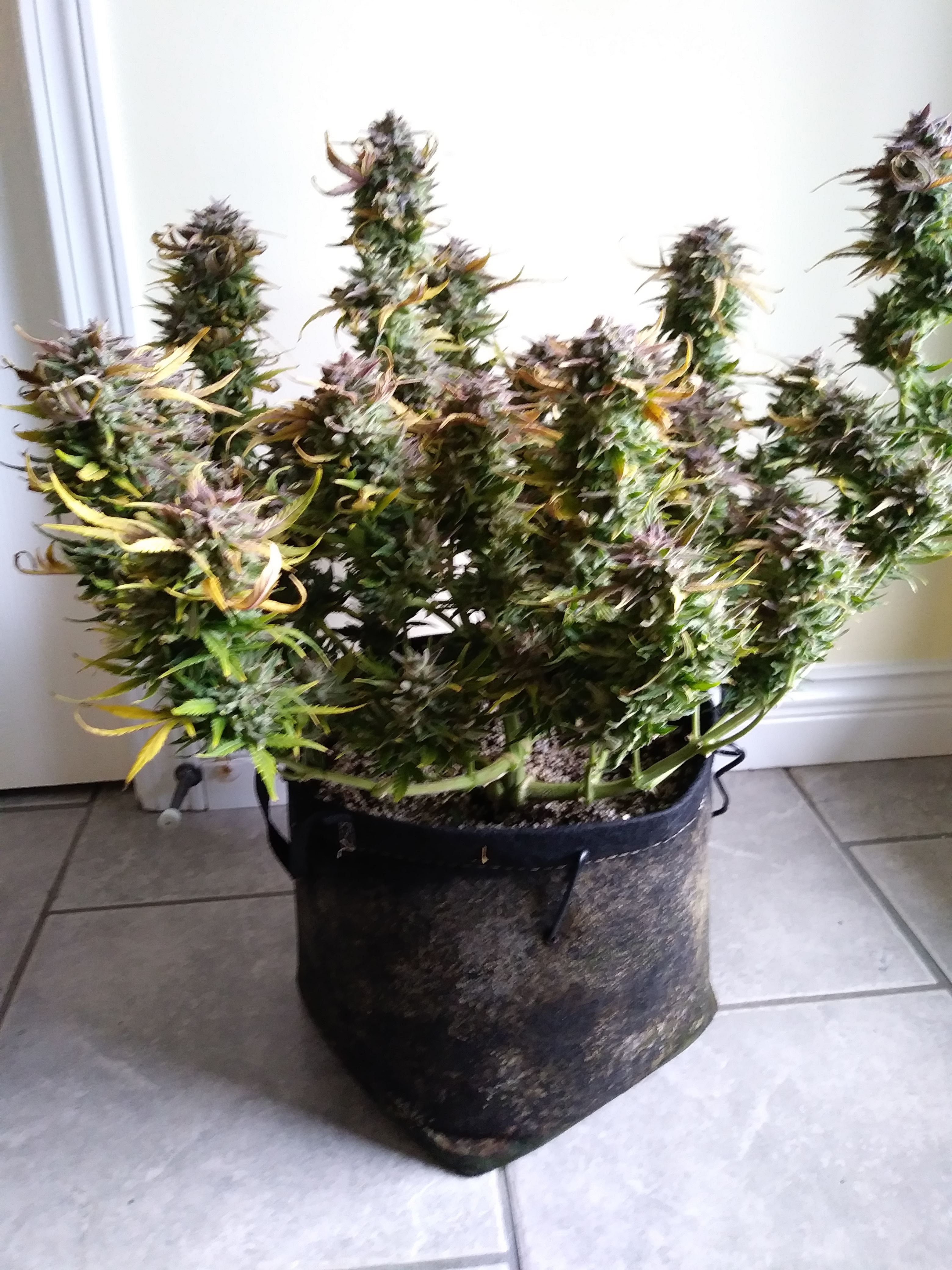 Juicyj89 are you sure it's only 59g wet? It looks much bigger than that to me. I would have guessed 59g dry. But I am going blind and senile. Very nice grow and keep it up looking very good. Also the g the growers advertise are dry weight. On the grams per meter square they count running a sea of green on those weights. So in a 4x4tent probably have 10 to 12 plants maybe topped but not trained per se. Yes defoliate etc. Most cant run a sea of green due to laws on number of plants.