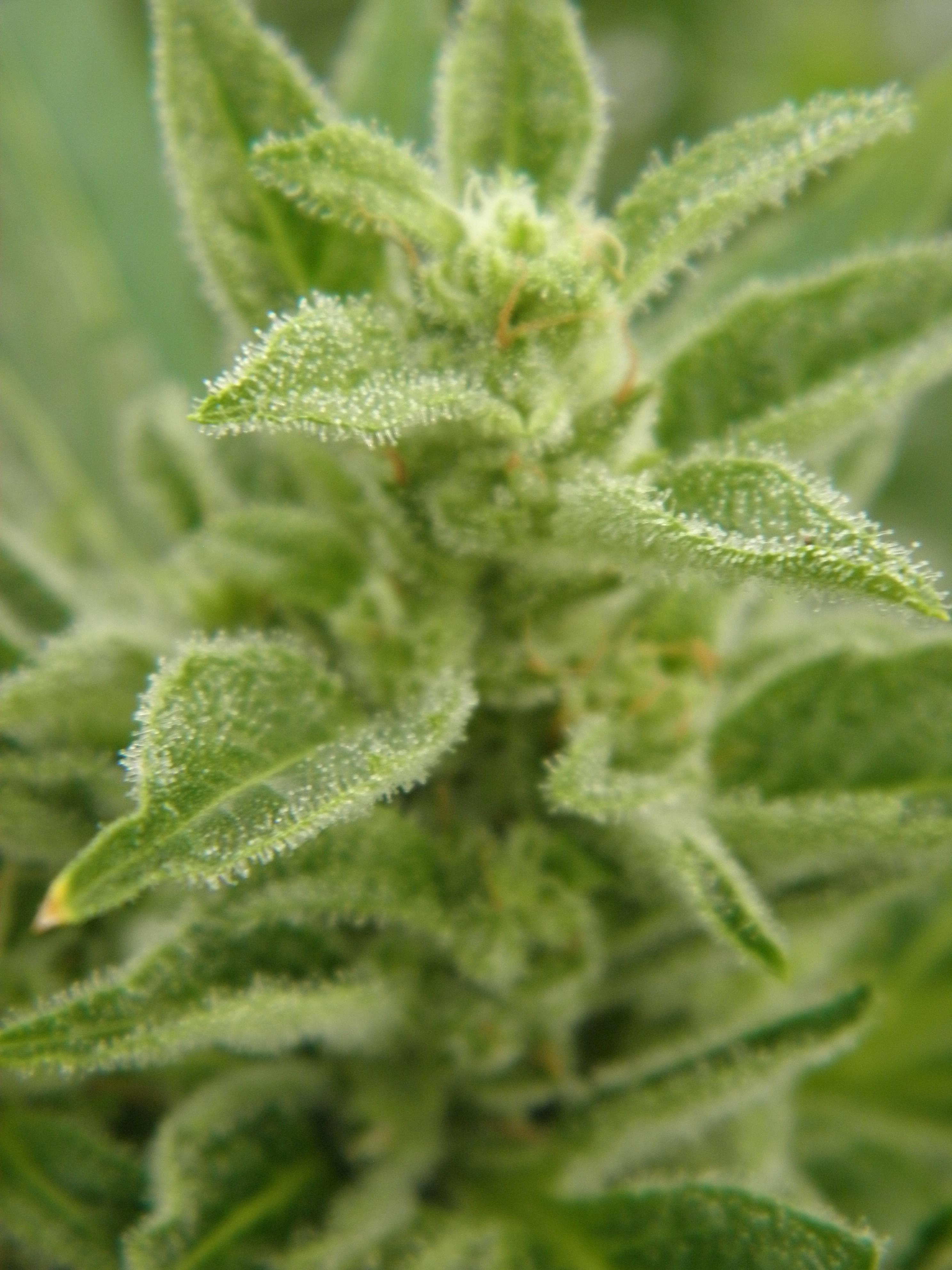She's now getting week 8 mid bloom nutes @ 75% strength. Just the slightest tip burn, just where I want to be so I'll back off now to about 65% strength for the rest of the grow.
