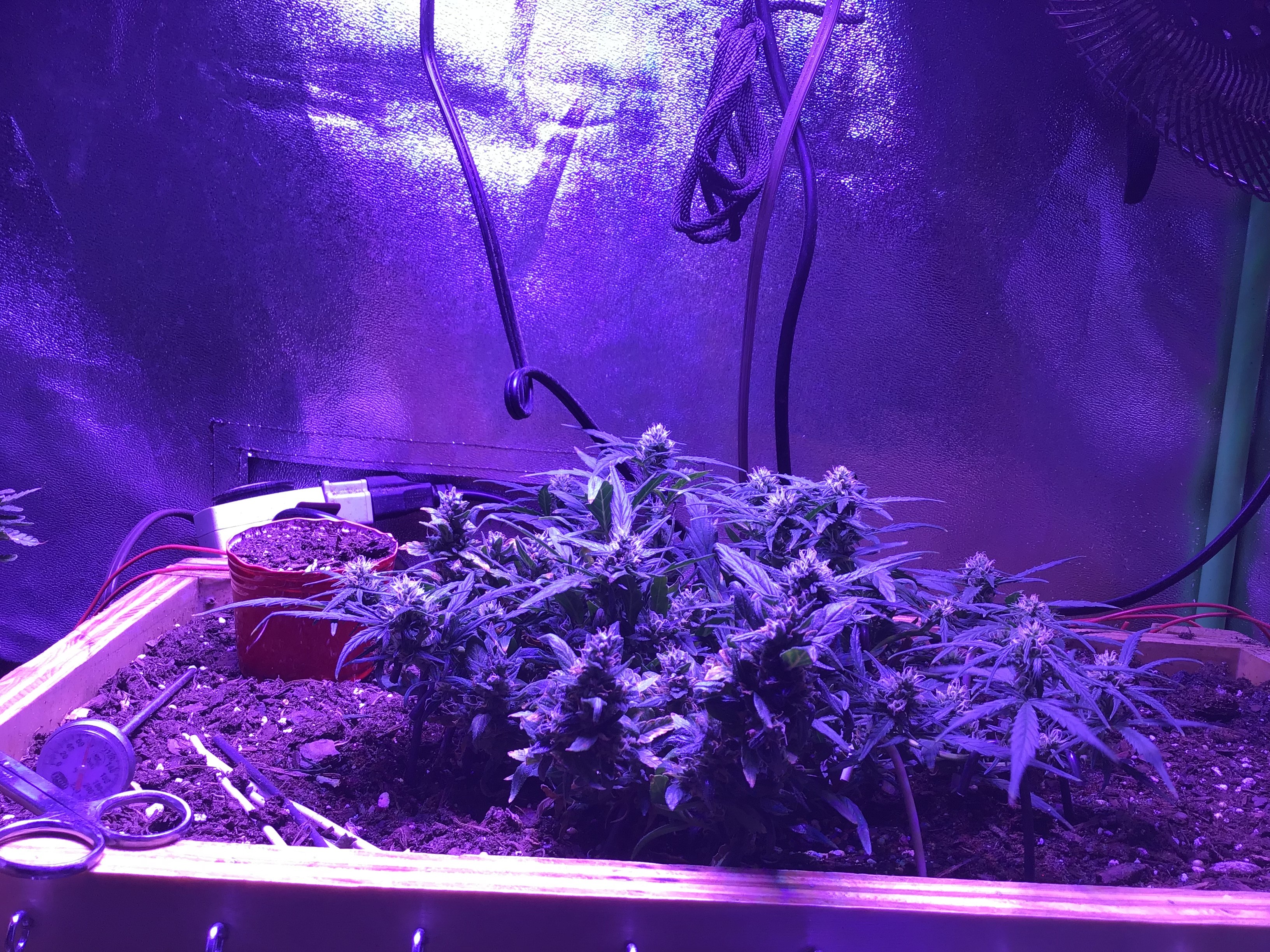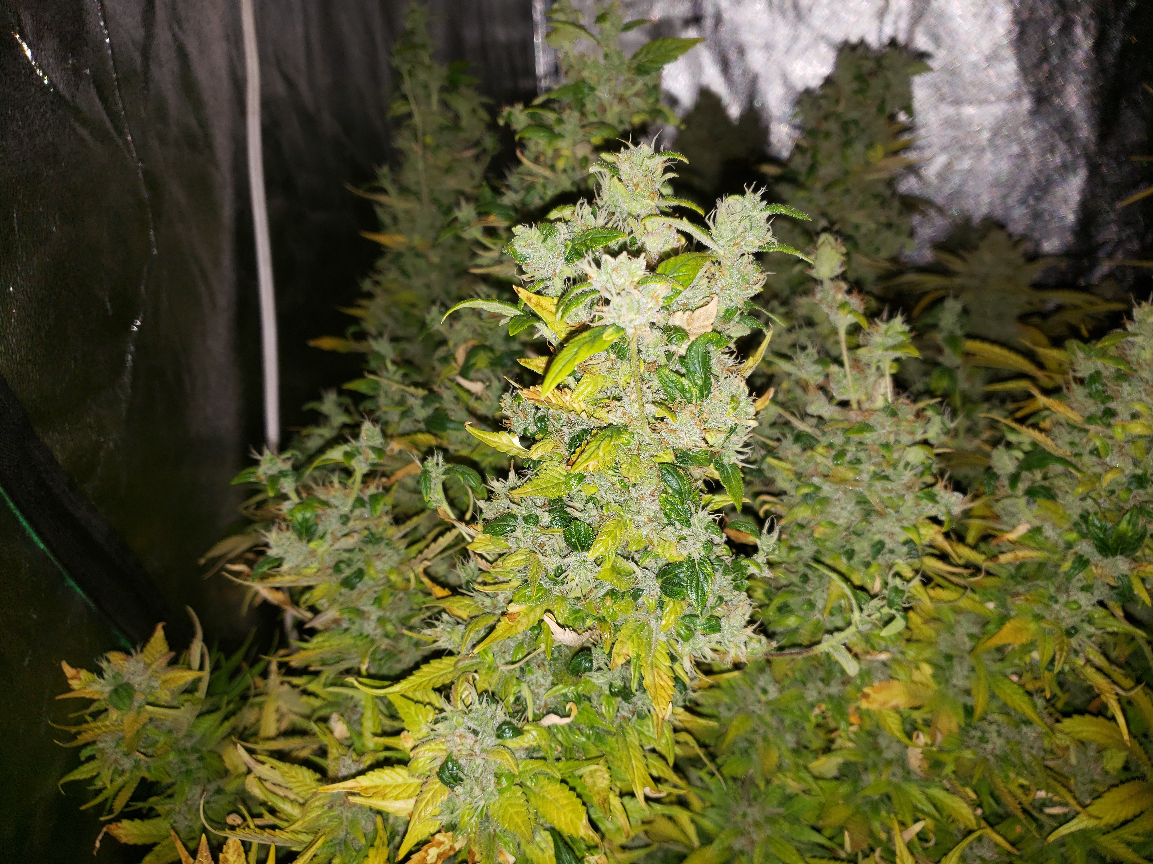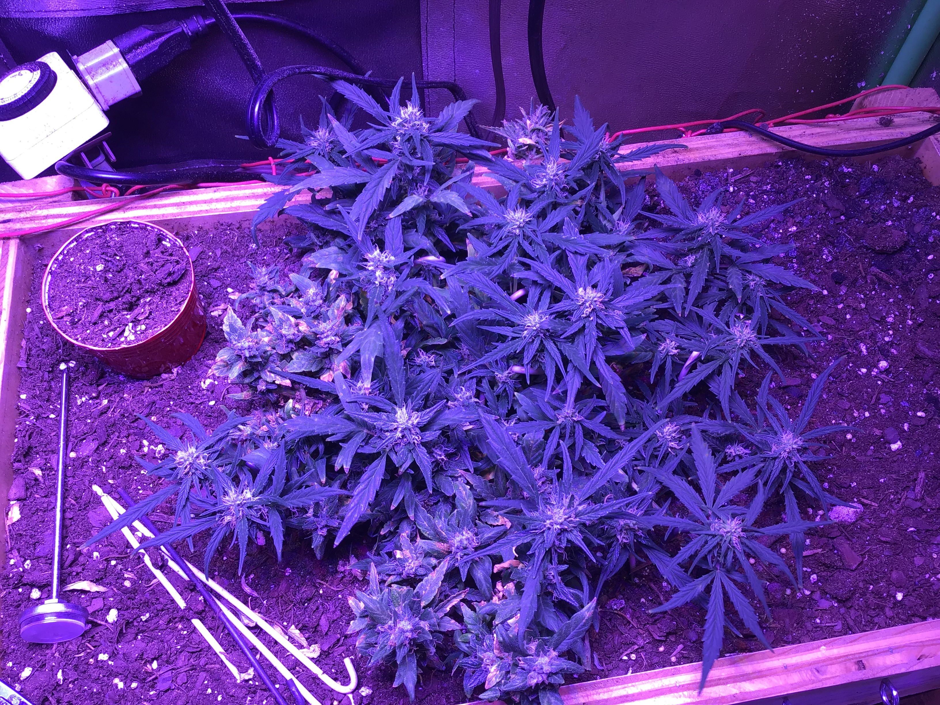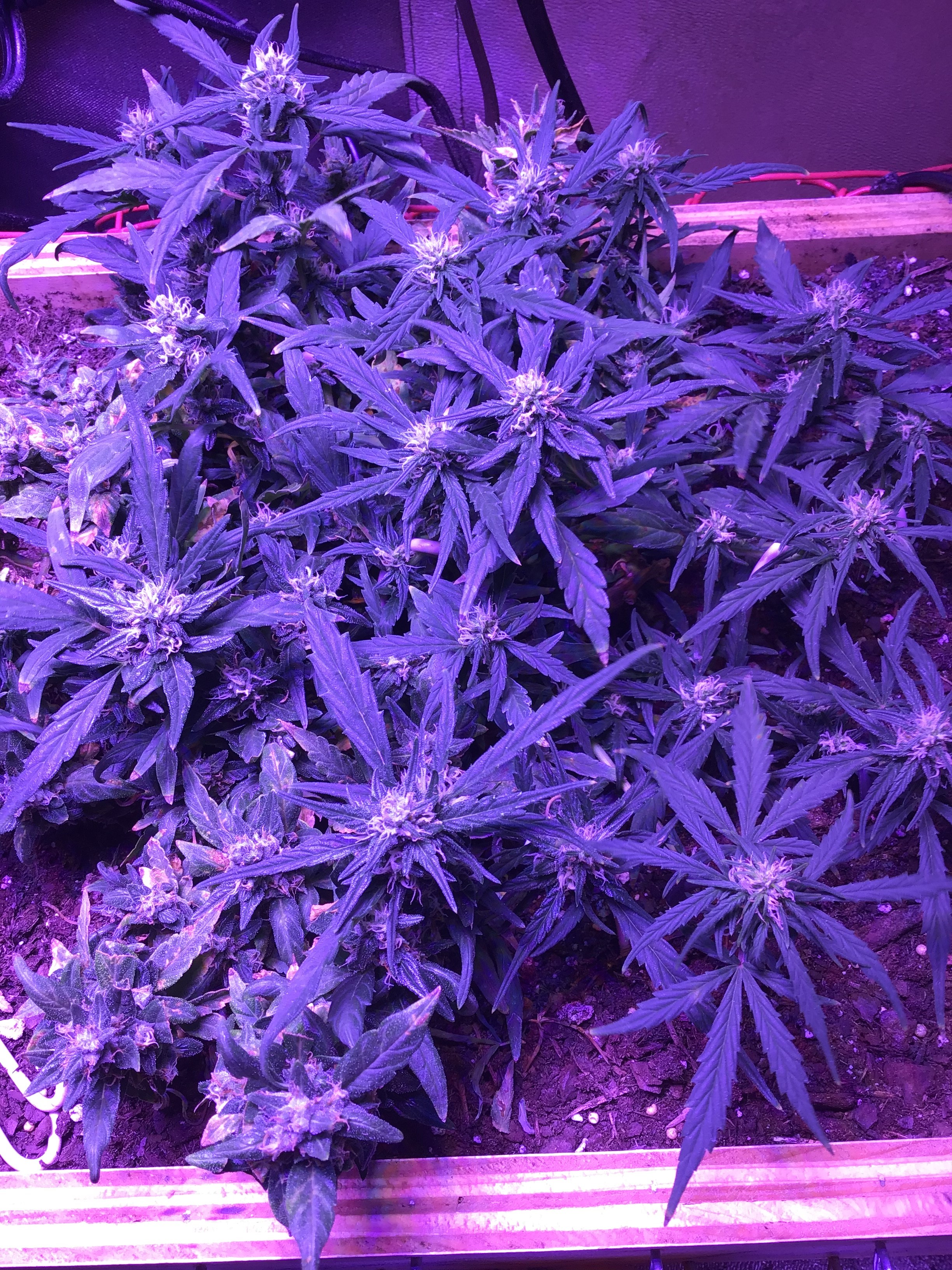Ok you asked be prepared for pictures. Lol The overheating killed one plant for an early harvest, the foxtailed on was opposite of it. The other 4 are fine. But as you can see from the pics thing one isnt even visible under all the others. I choose 2 and grew 6. 3 ak47 autos and 3 bluetooth. One ak47 got crispy and had to come down(very very high when you smoke but it tastes like ass. My thing 2 lost as the worst tasting plant in the contest. It may fuck you up more than any other plant here but whats the point if the smoke sucks. Dry it was 59 grams but if you stopped by you could have it all. Lmao But not kidding. Ok here she goes.