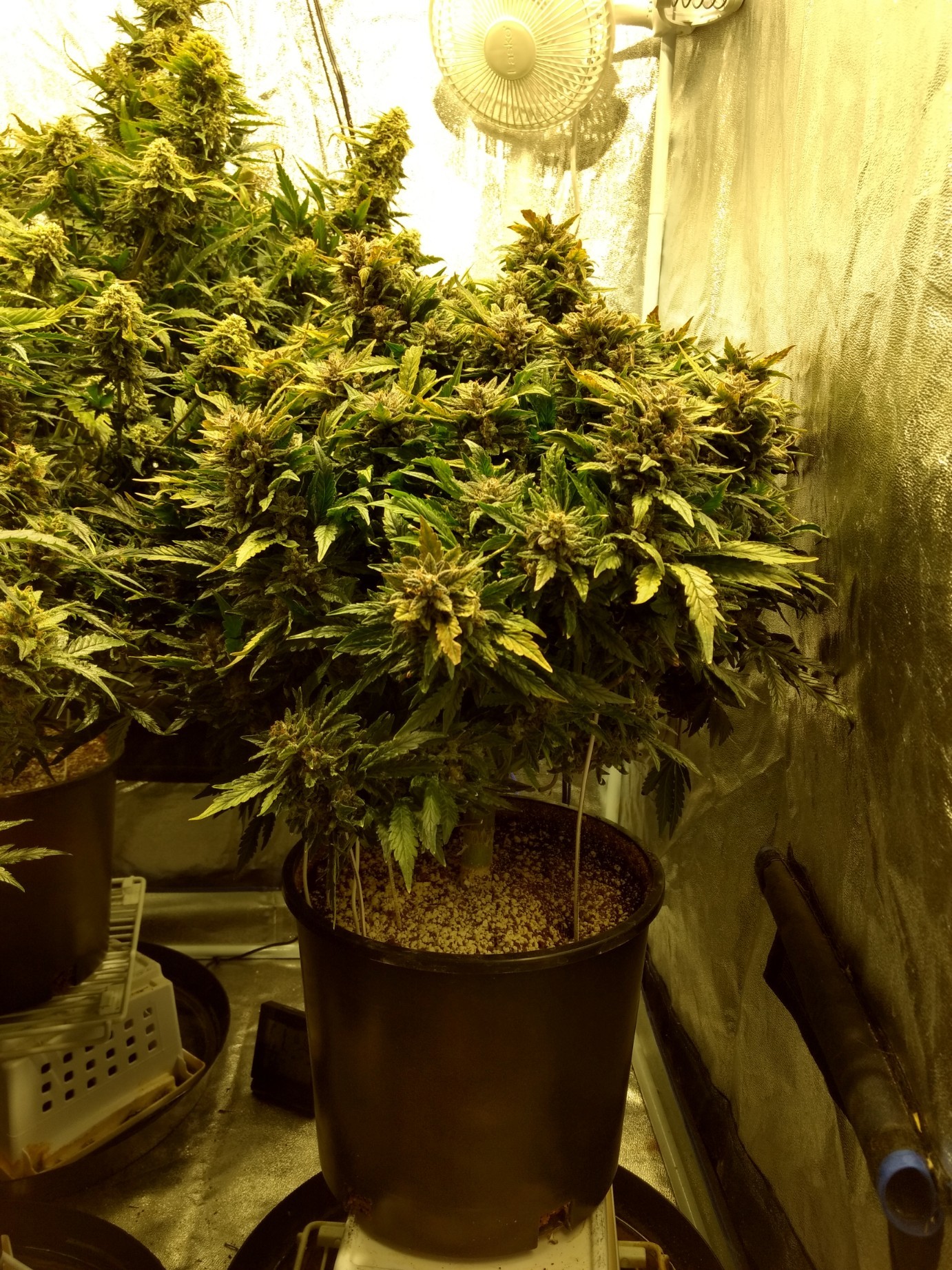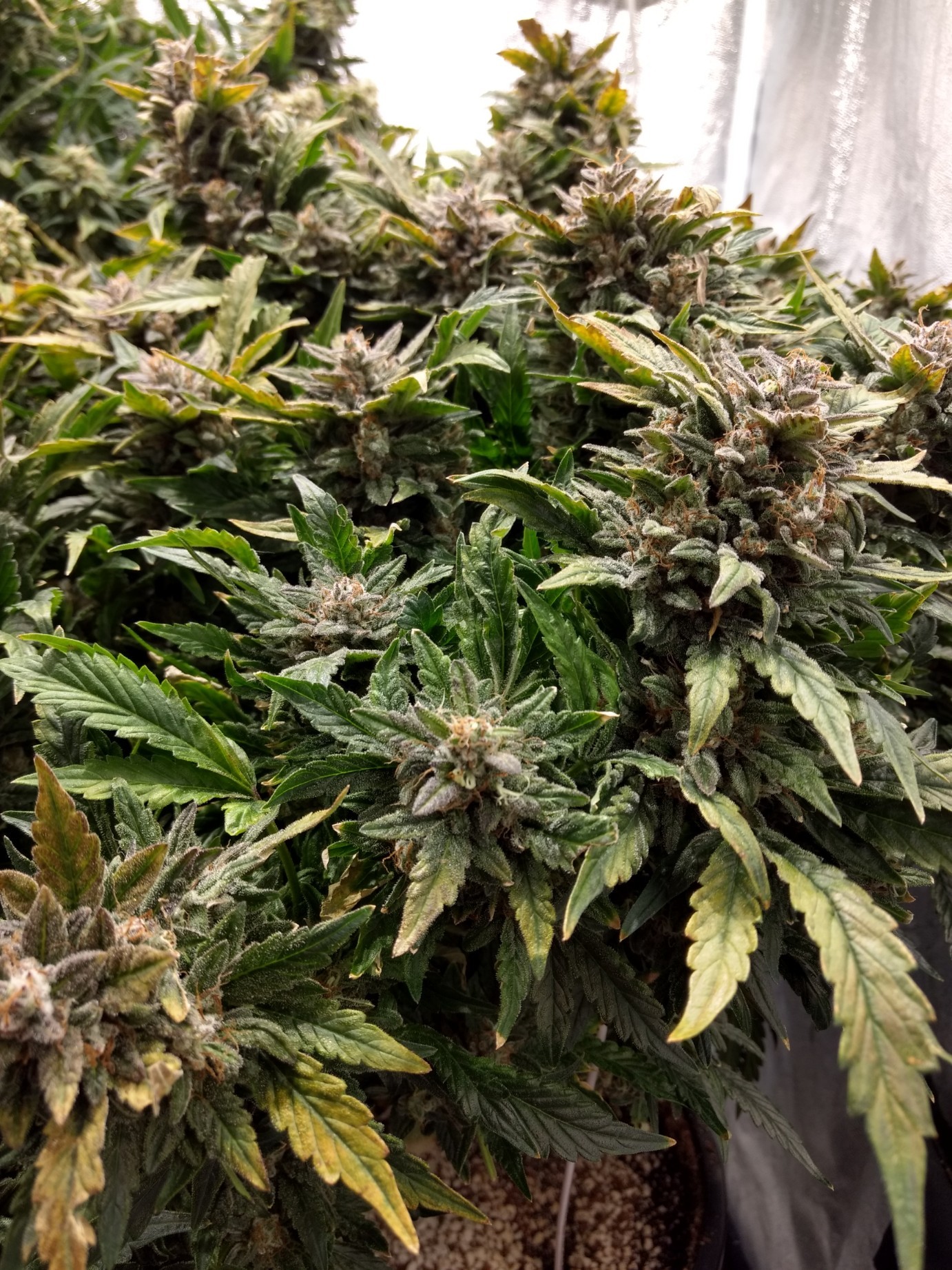 I have had 2 girls that have been a couple of amber trics away from chopping for 2 weeks they just would not finish,they are drying now but this is what I learned if you have aphids with real close buds you have to spray them ,Lady bugs just cant seem to get into the aphids ,I would have 10 lady bugs on top of a bud and still see aphids in between parts of the bud ,last week I dumped 500 LBs in the auto room and Monday I dropped another 500 to 1000 and there were still thousands on stems and leafs .I have never seen a worse infestation of aphids before , I took all the autos out trimmed up and spread out what I could then I sprayed them with 3 in 1 spray ,I sprayed 7 big plants and the ones I just transplanted the first 2 pics a before and after and the 3rd is one I cut down it produced 207 grams wet ,should be 51.75 dry the second plant I chopped weighted in at 120 grams wet 30 grams dry