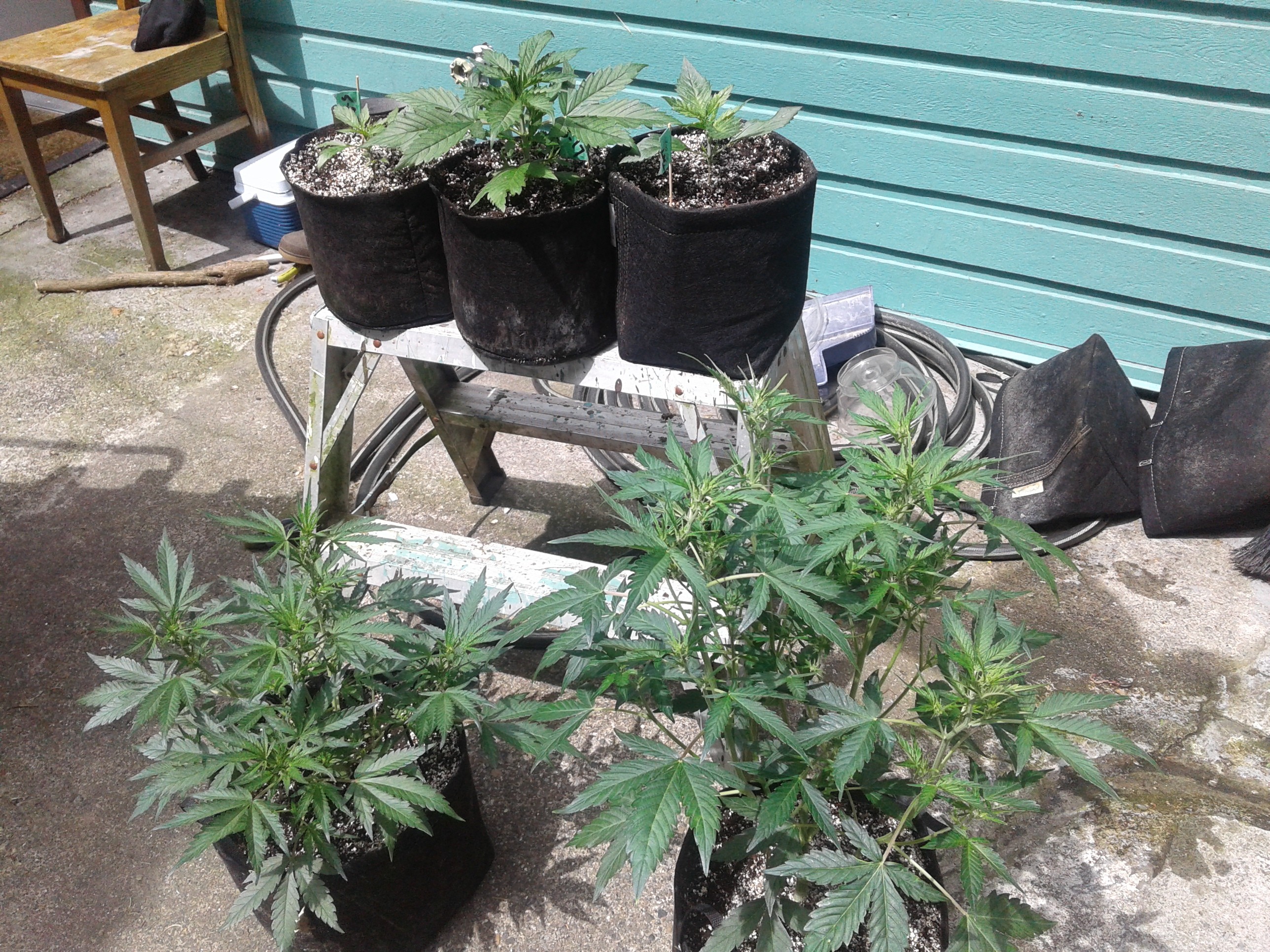 I'm wondering if I ought to put my stalled autos back into the greenhouse? So far not impressed with their growth rate. But i'm so use to photos seeing fast outdoor growth 2-3" a day now and will be growing faster now that the weather is warm and dry. I should of vegged them at least 6wks before going outdoors, oh well they are more of an experiment this summer. I'll do better next summer if I grow them outside. It's still early here in so.oregon could start somemore but my photos are my pride and joy and got enough planted. The 2 older well developed WW autos are doing great do to being under lights and tent for a month prior to sending them out to the greenhouse. Took a cut from one lower branch experiment, topped one and other is ahh natural. 2 GDP autos 1 Durban poison 1 sweet tooth are stalled just nursing them. Those are 50days old maybe 12" tall looking weak. I'm just giving them normal amounts of nutes, watering now till runs out the bottom of container and only every 5days as they aren't drinking much at all. I hope these snap out of their comas don't expect much at this point. I sure love the outdoor photos they are doing well not bothered much at all by the earlier temp fluxes. OJ that 3 month old auto that's deciding what it wants to do looks like mine but yours is bigger LOL I know if I put them back into greenhouse it would be a death sentence in a sweat house I will push them out of the infirmary mind you in 2 weeks hide them out in the woods and just go check on them as i'm not gonna waste my time with them. My photos are my pride and joy