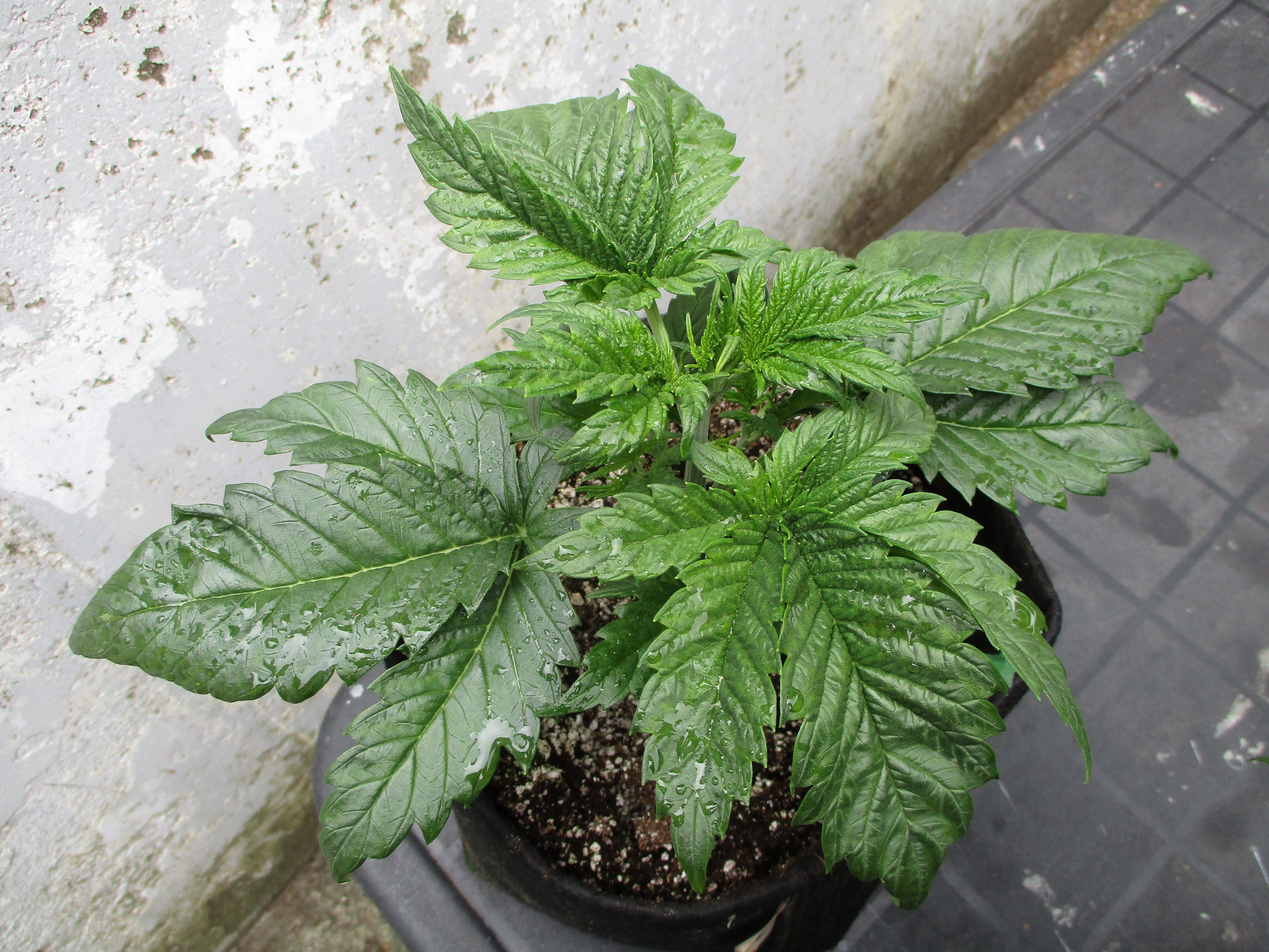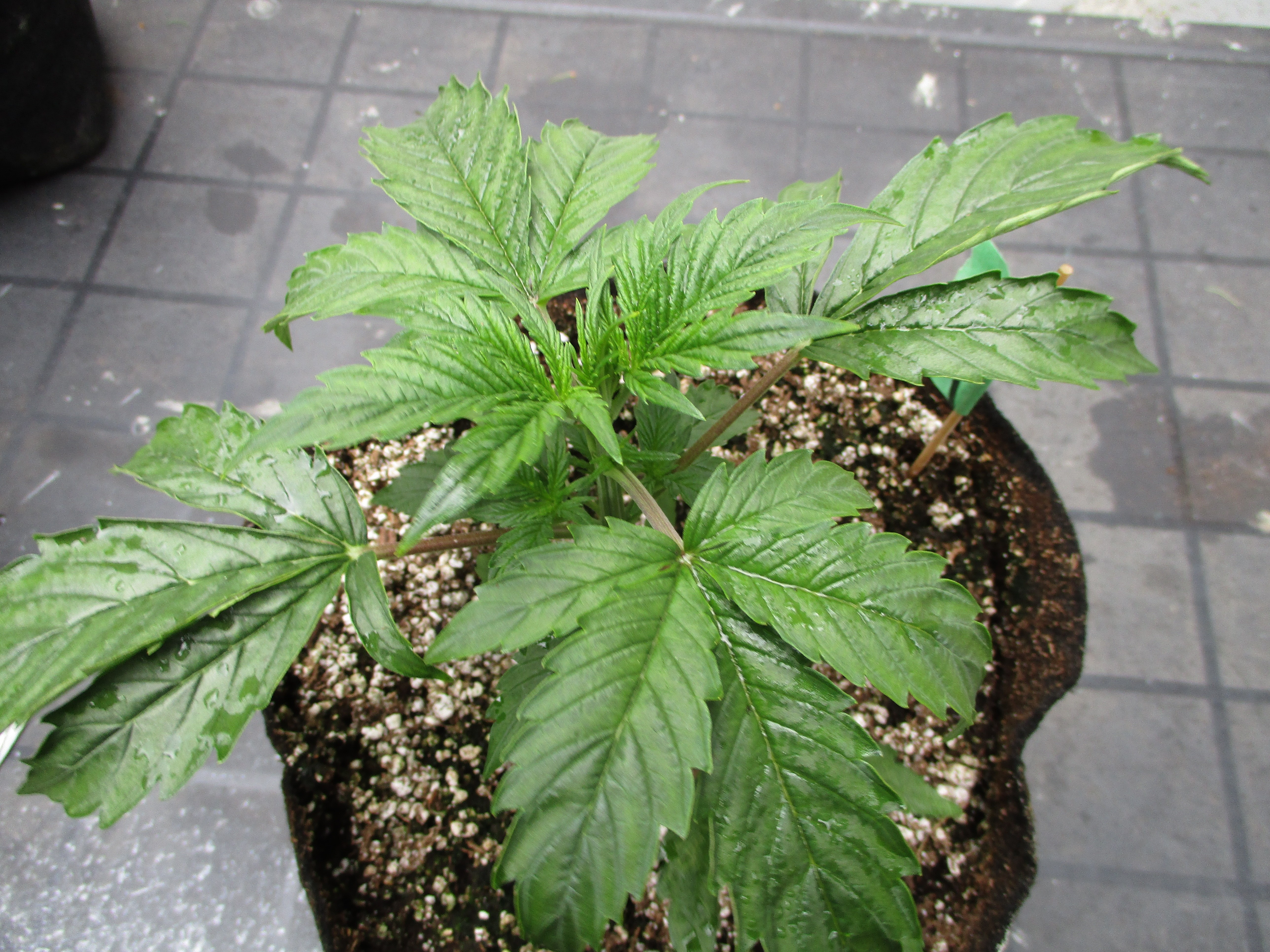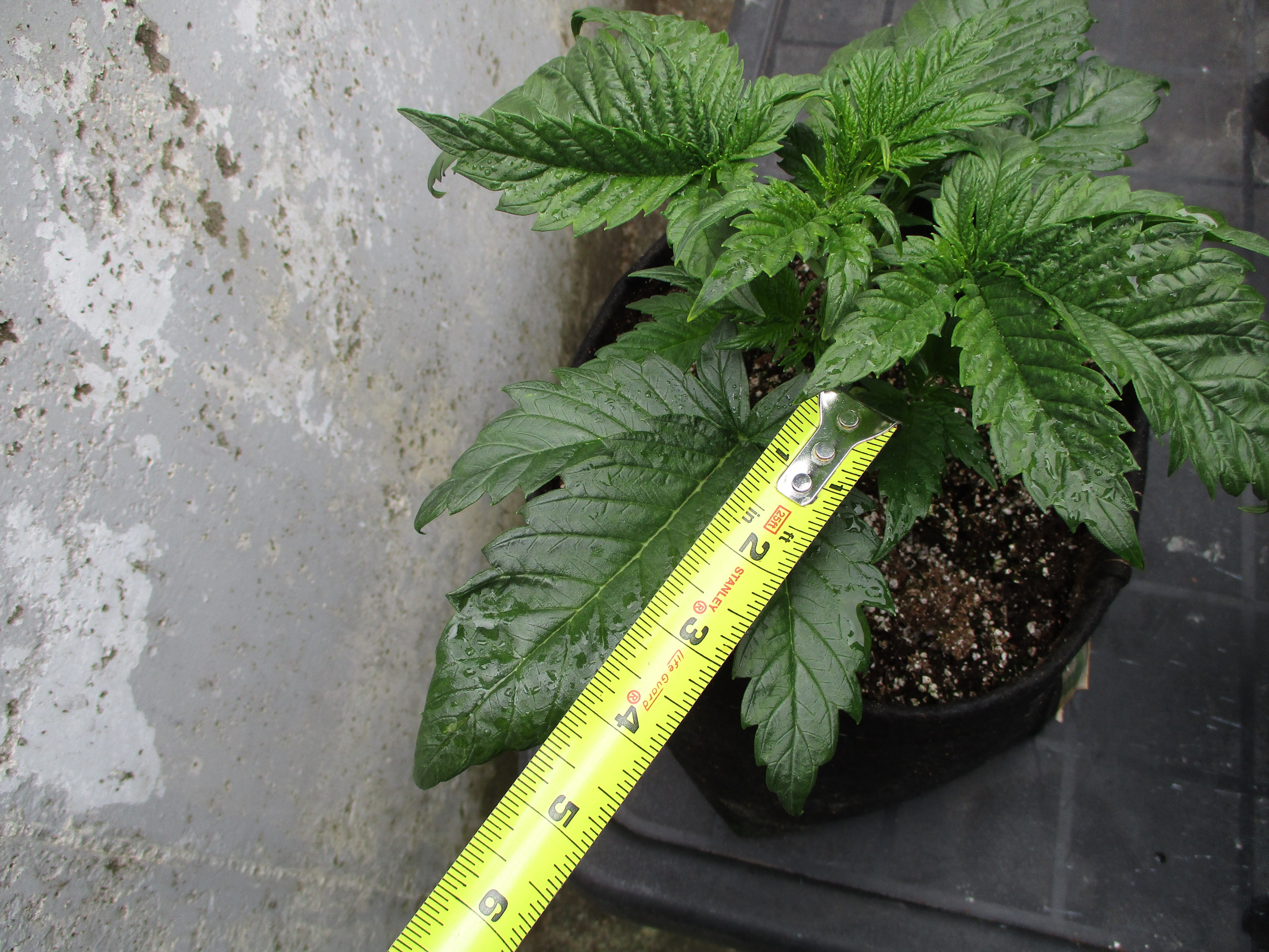 People keep asking me if Foliar Essence makes a difference - does to me - does to JTReviews as well - here's a little proof. She is wet from being sprayed today so this was her third spraying and she is 17 days out of the soil. Pretty big ass leaves to me. Click image for larger version