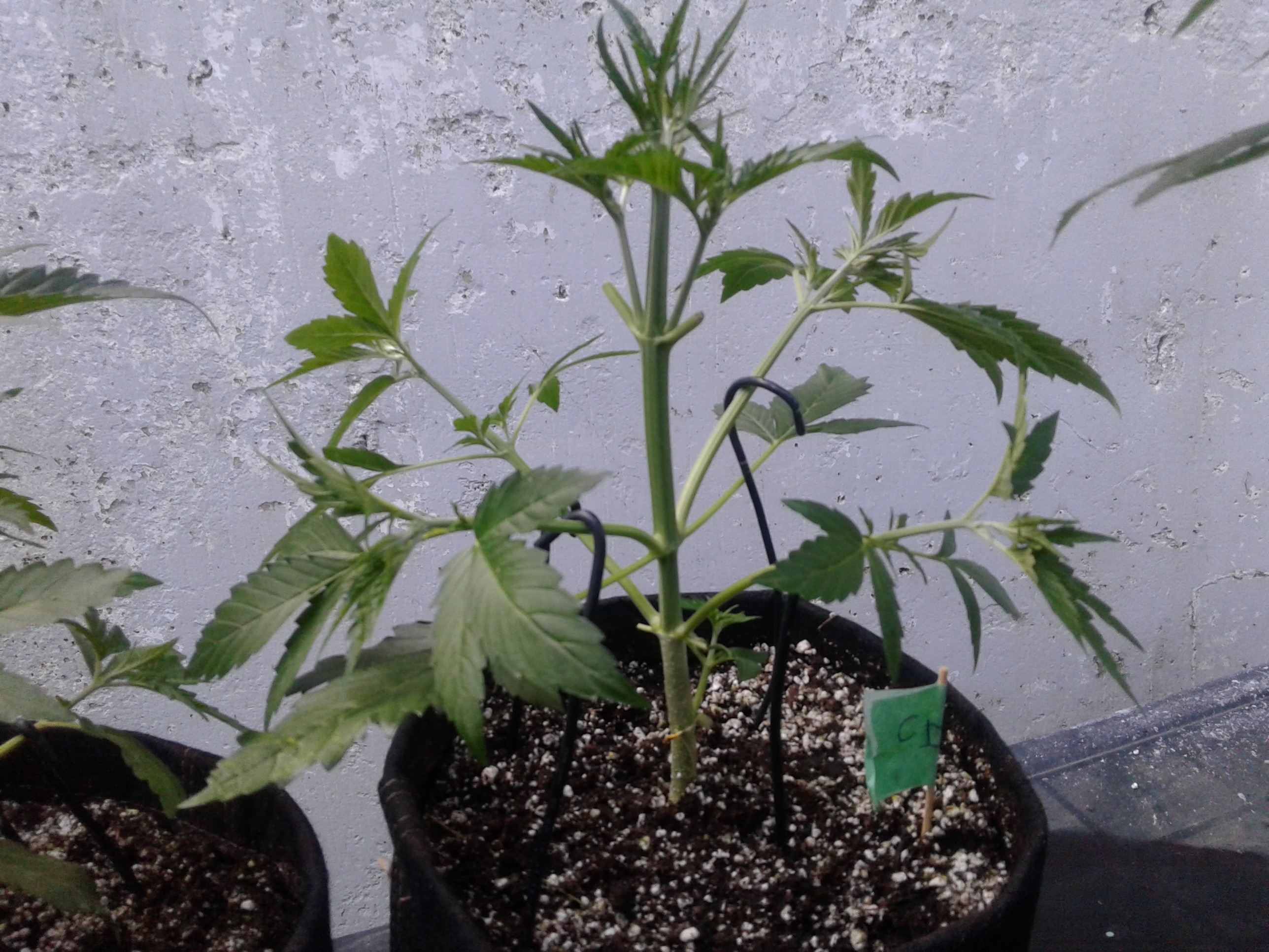 These pics taken Sunday, The CG went though a bit more training (just pulling and tying down), the Headbanger well she does not like the heat, poor choice for outdoor (or for a new grower). The BB3 is doing well, that twisted leaf is on the RG,,, and typing about the RG just look at her! Now what would all you guys and gals do with her? A friend was looking at her, stepped around for another angle, and then down inside the plant gently moving branches to the side "damn that IS just 1 plant!"! Well it is 2 plants that were to close to separate, so close they look to have grown together, for me I see 2 different phenotypes with 1 having purple stems to the leaf. then the Widow Banger she is doing well, looking forward to seeing just what this cross will do!