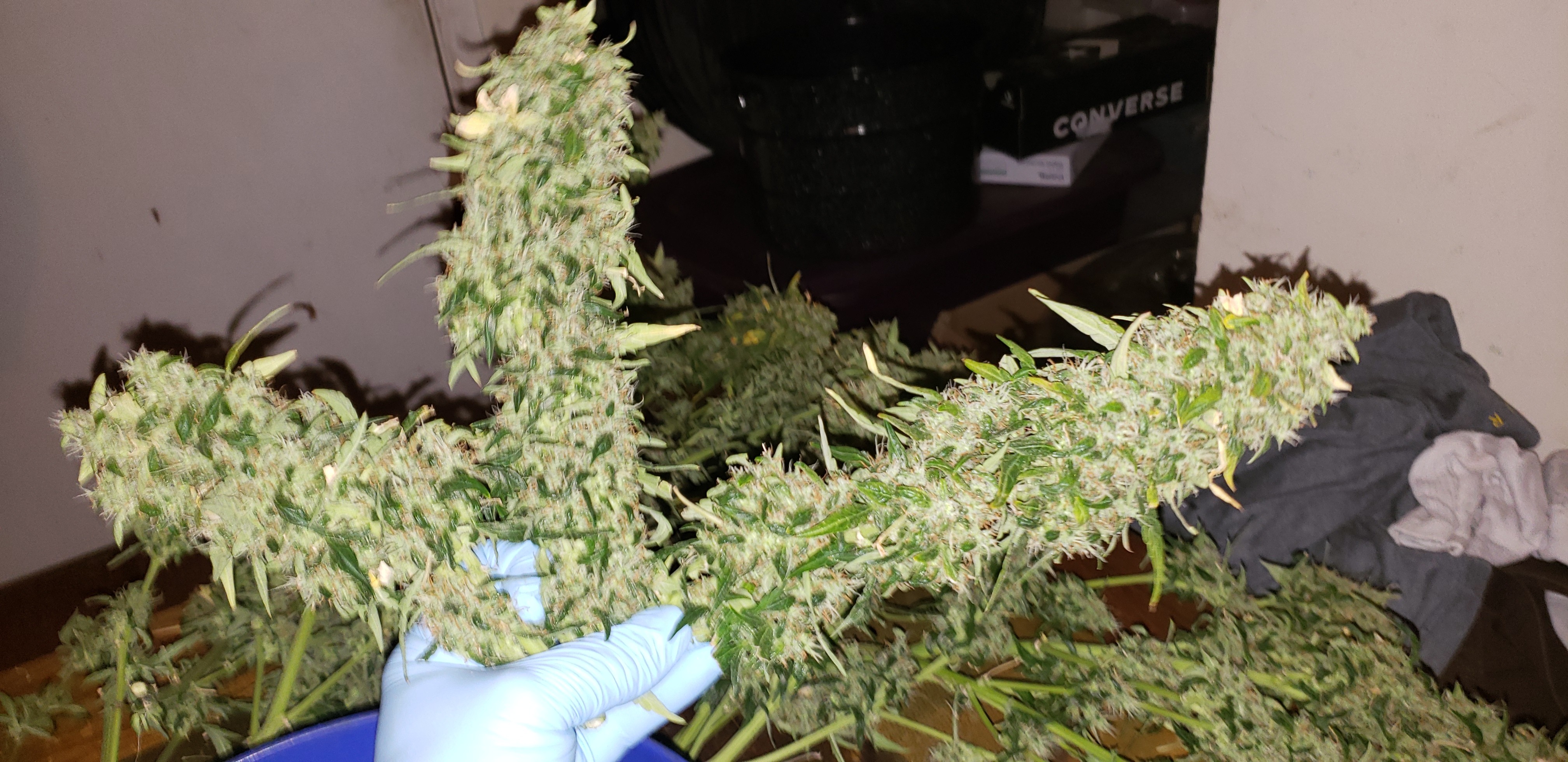 Little early, but chopped 2 grapefruit and dug out a ton of rot. Family is in this weekend, so took 1-1/2 hrs for three of us to go through and trim it all. Wish I owned a autotrimmer for the rest...lol. Longest bud was about 12”.