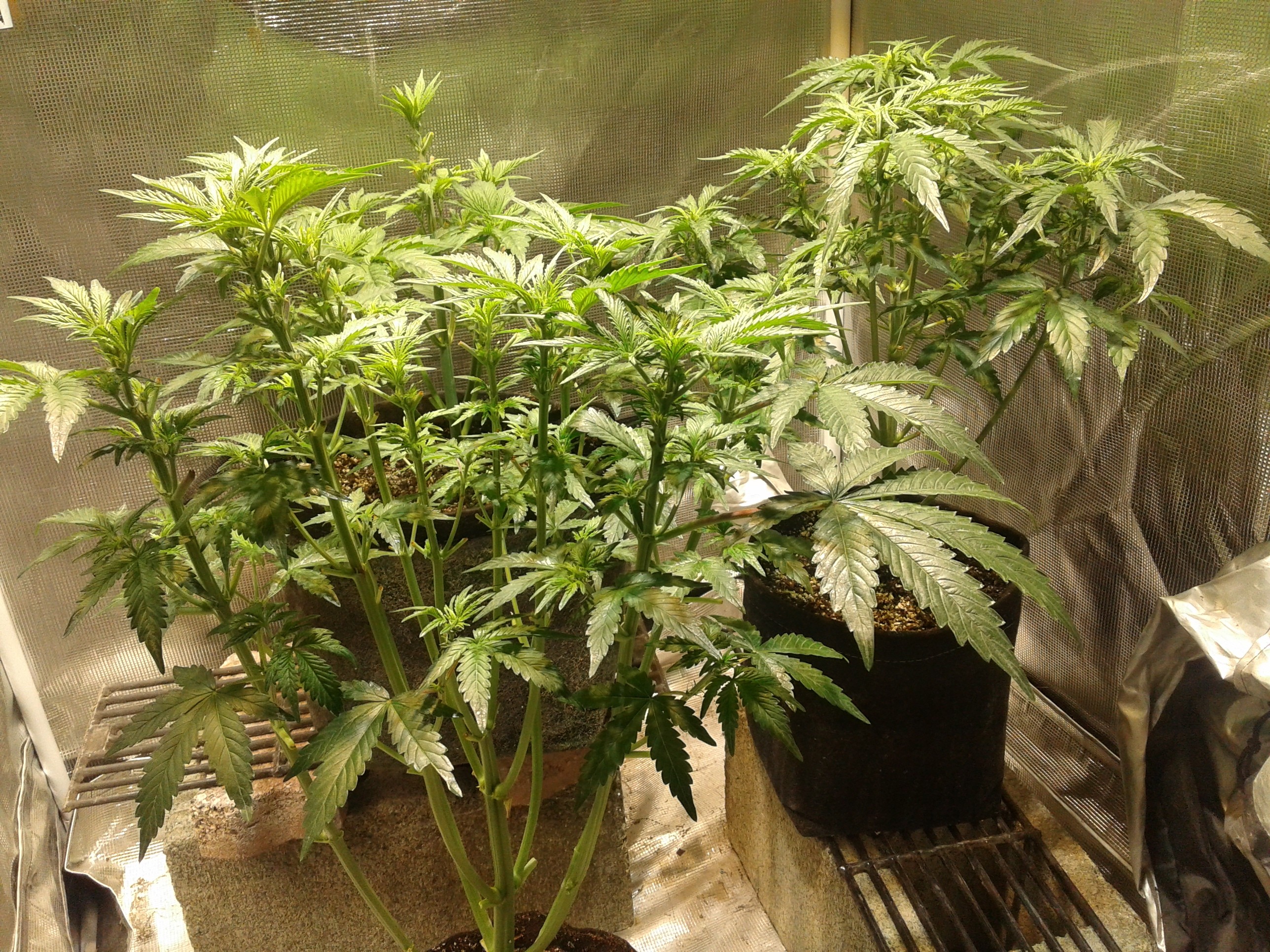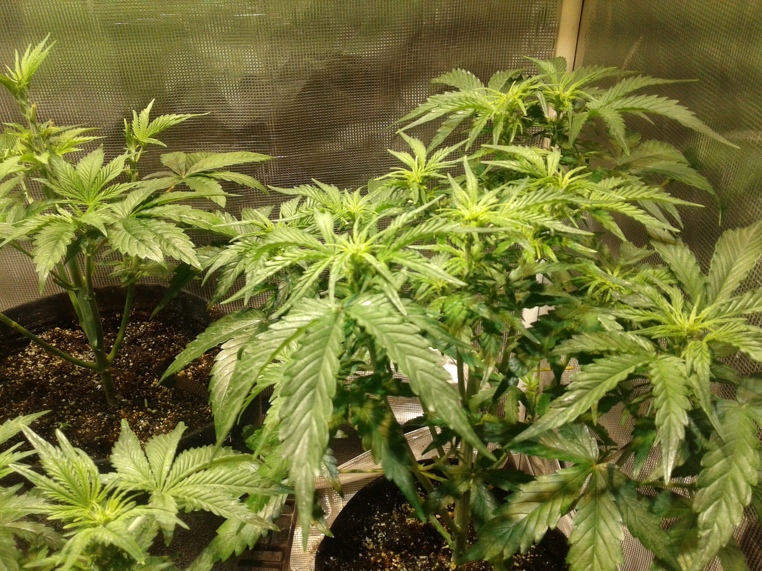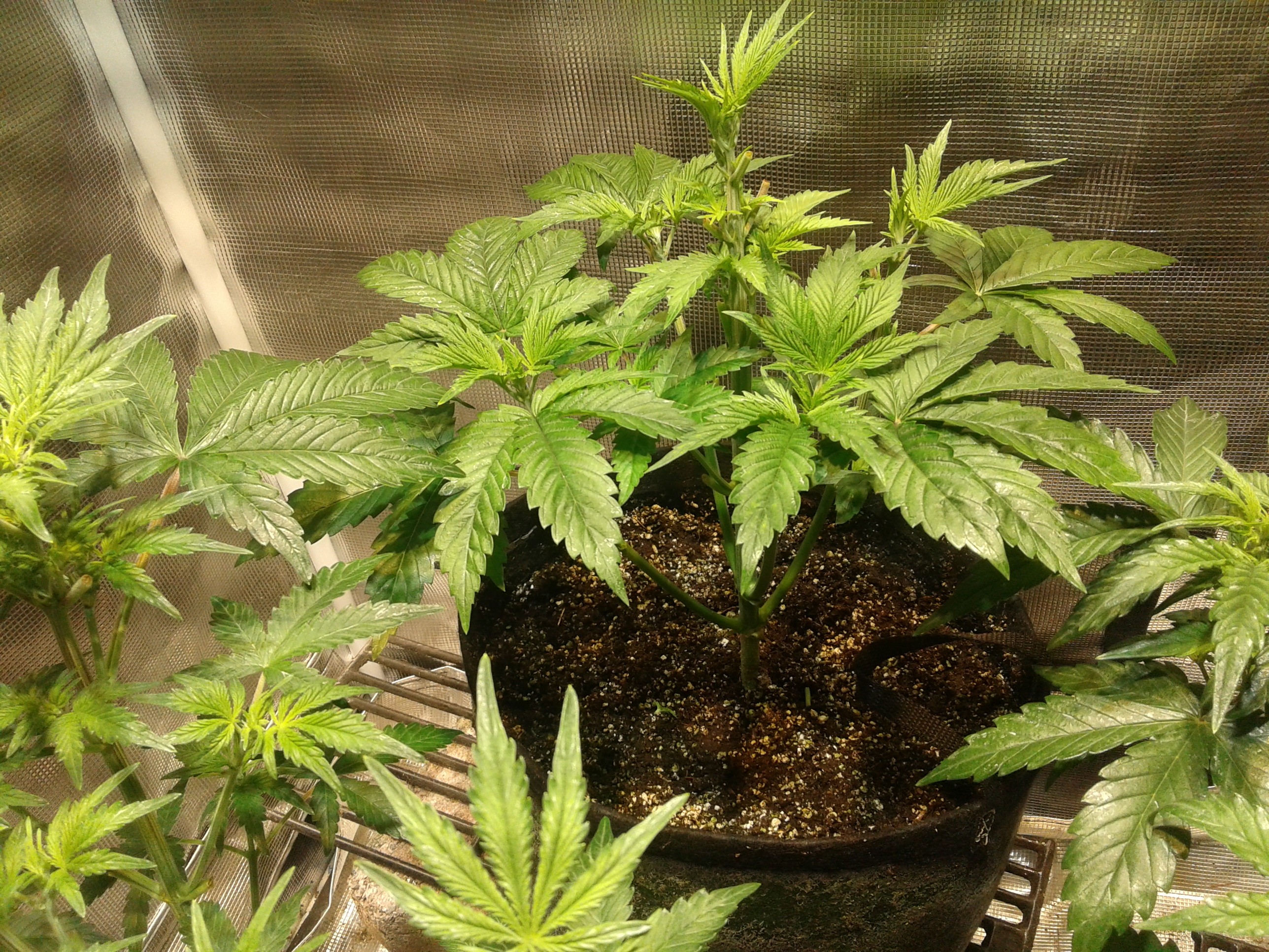 Two mystery seeds in the back and a Sweet Tooth in front. All around 35 days old. Seems I've been taking leaves off every second day - a few inside branches as well.