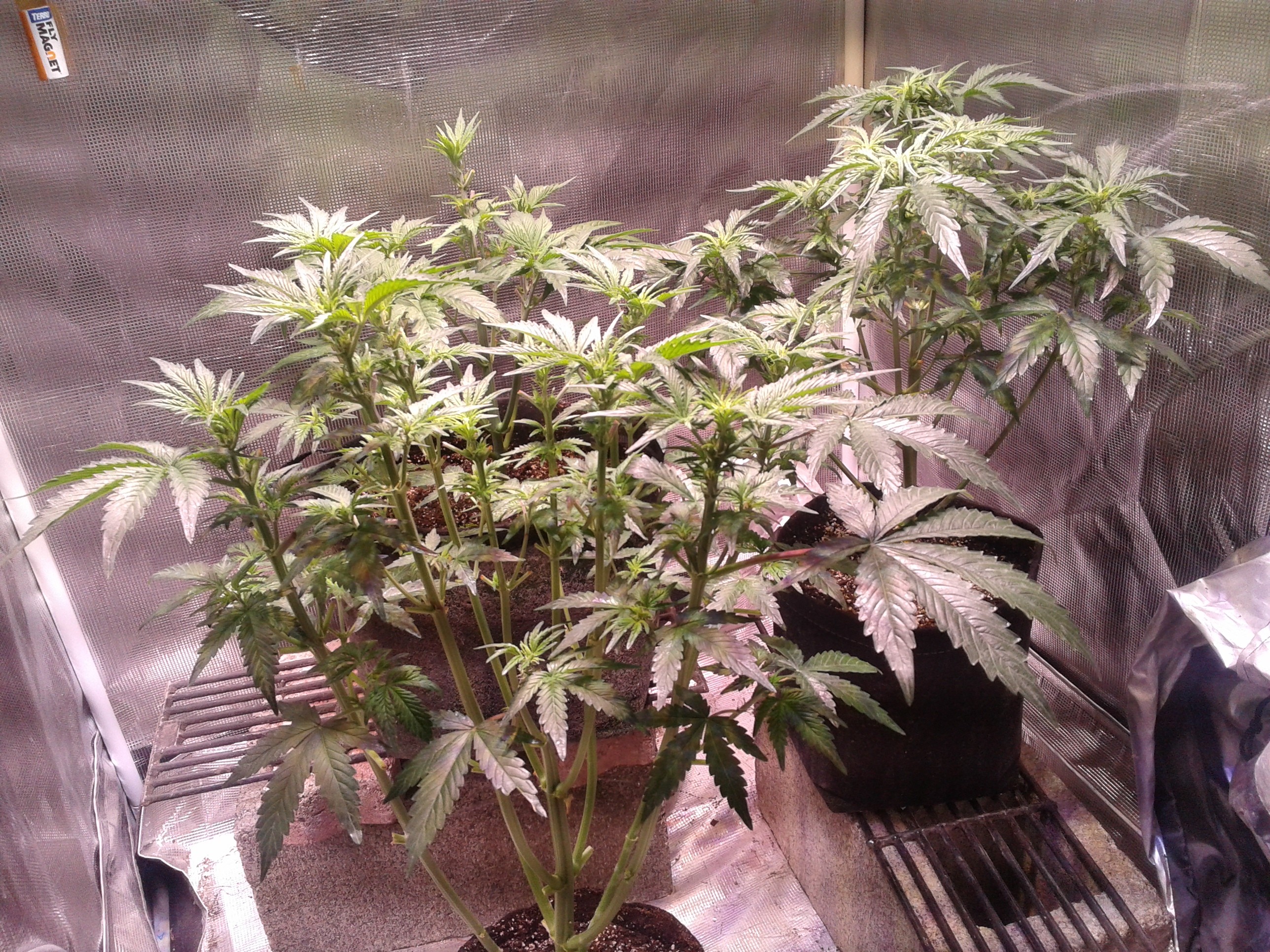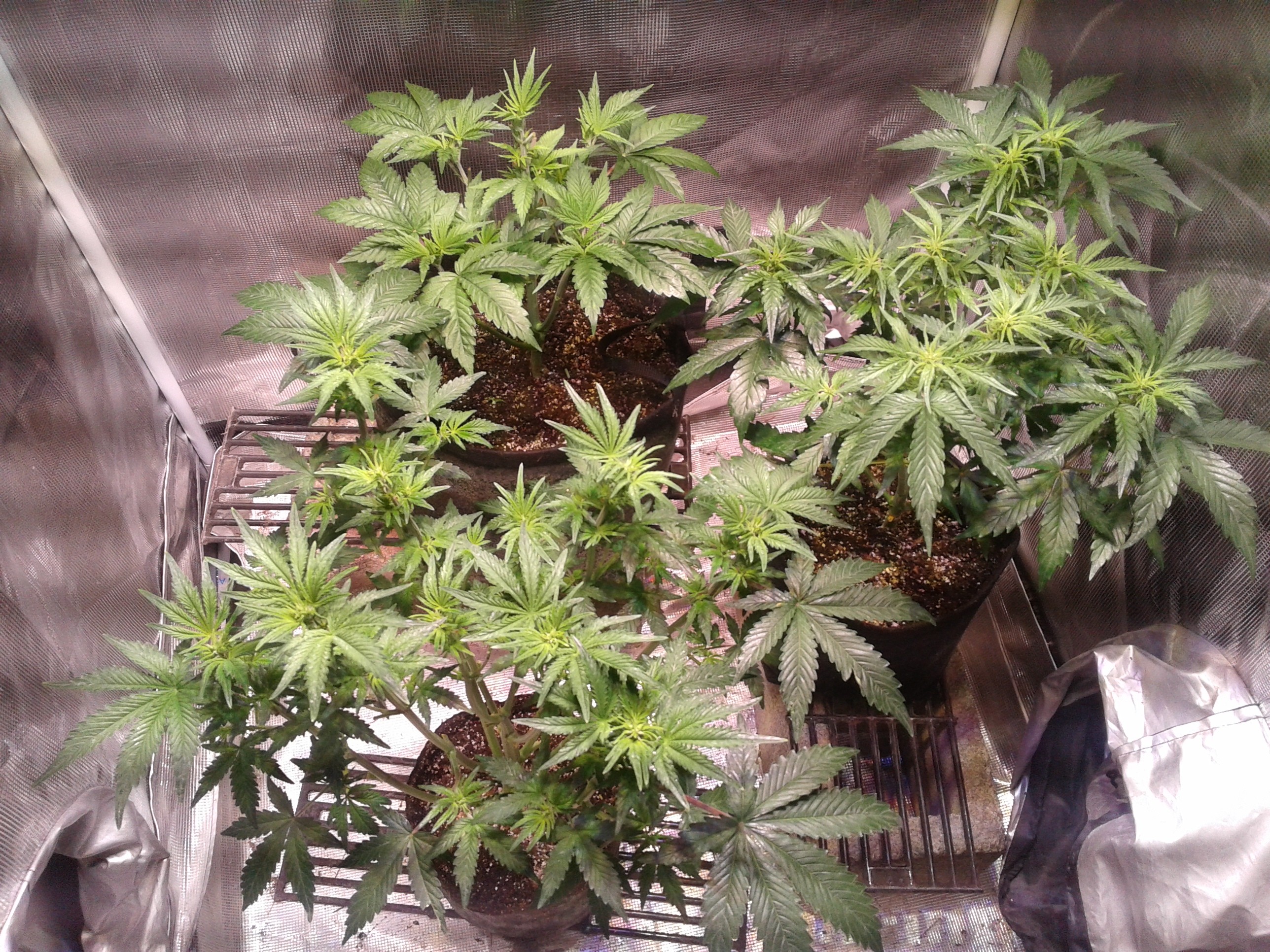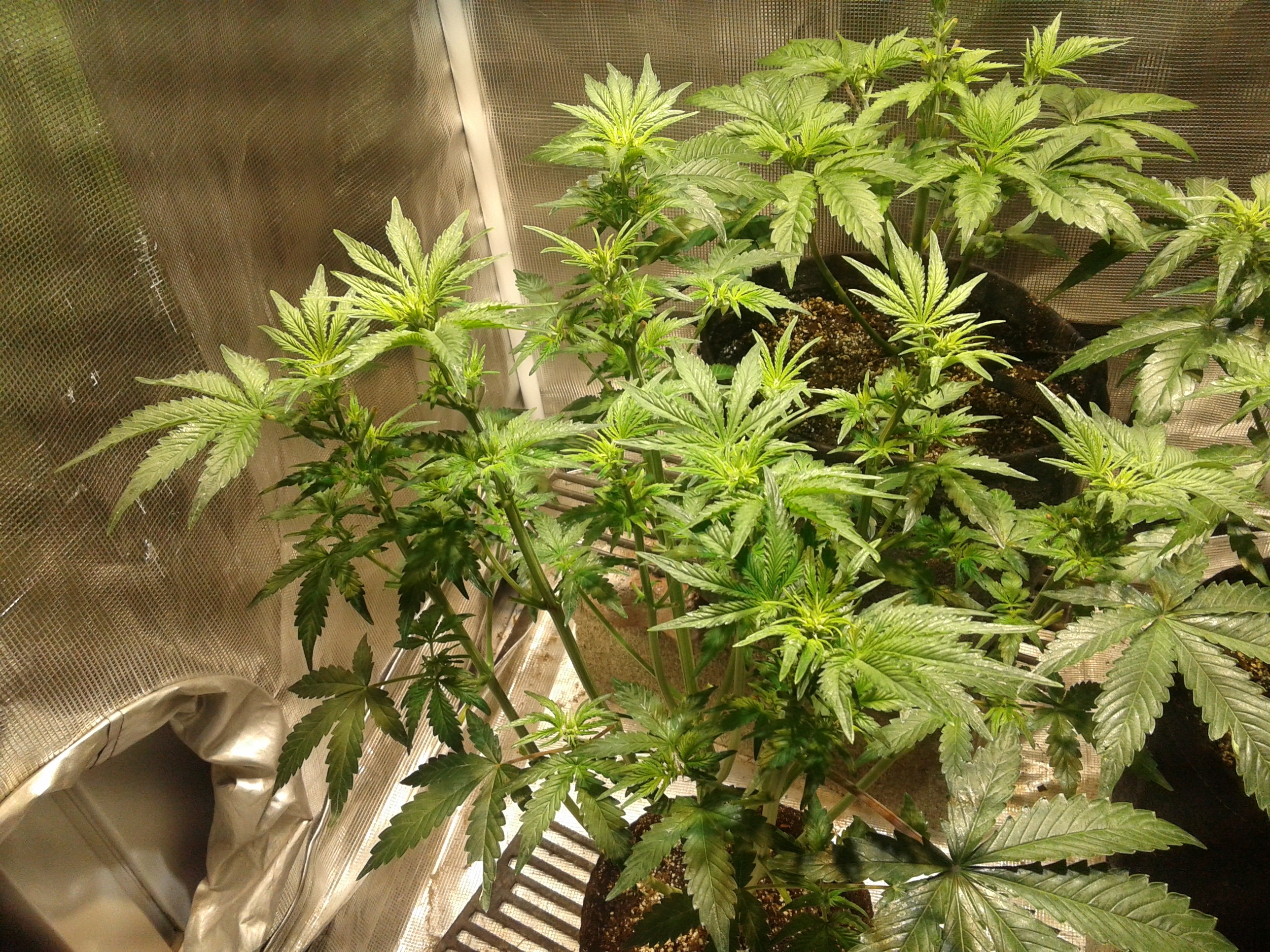 Two mystery seeds in the back and a Sweet Tooth in front. All around 35 days old. Seems I've been taking leaves off every second day - a few inside branches as well.