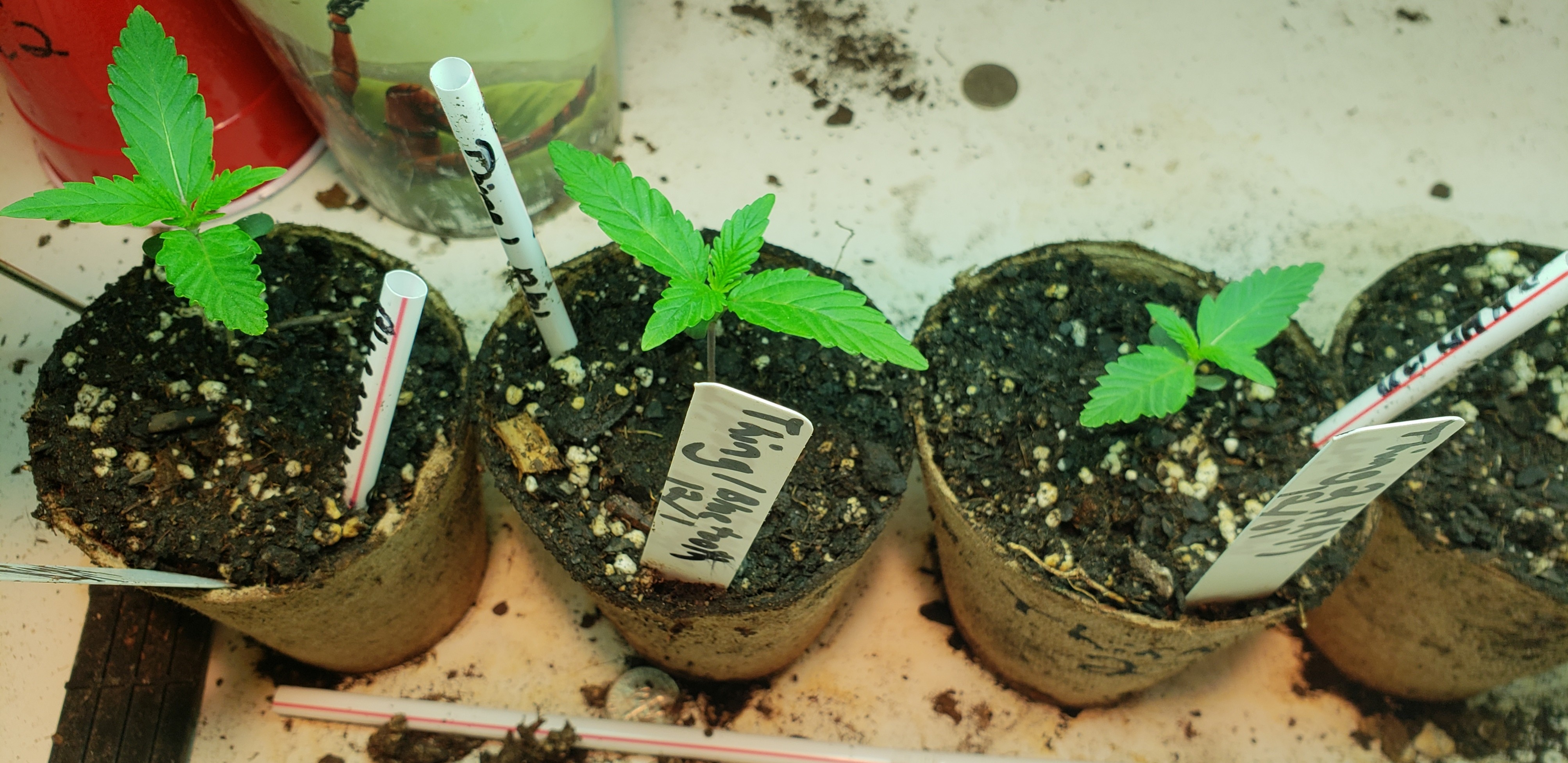 Here is a pic. of Thing 1 and 2, Soaked seeds for 44hrs. then this afternoon planted them in solo cups. #1 is Pure Haze and #2 is White Moscow. I'm hoping my pictures get more exciting down the road.