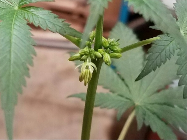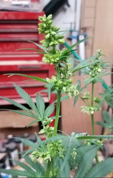 My plan was to keep it in the flower room by removing any early male flowers, but a few days after the last update it was apparent it was time to move it away from my girls. I placed it in my garage with a grow light on it waiting for some pollen to harvest. I place a box over it at roughly the same time it is used to. I expect to get some pollen by the next update.