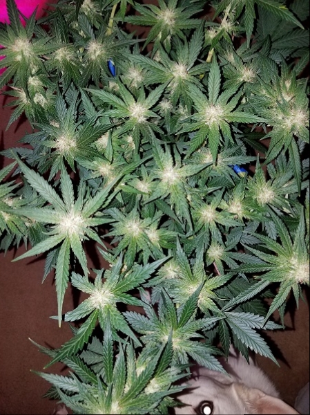 ID:	40595 This plant is starting to bud up and now I am hoping for it to fatten up. Seeing some nice crystals and the scent is very pleasant. My dog is looking on with approval.