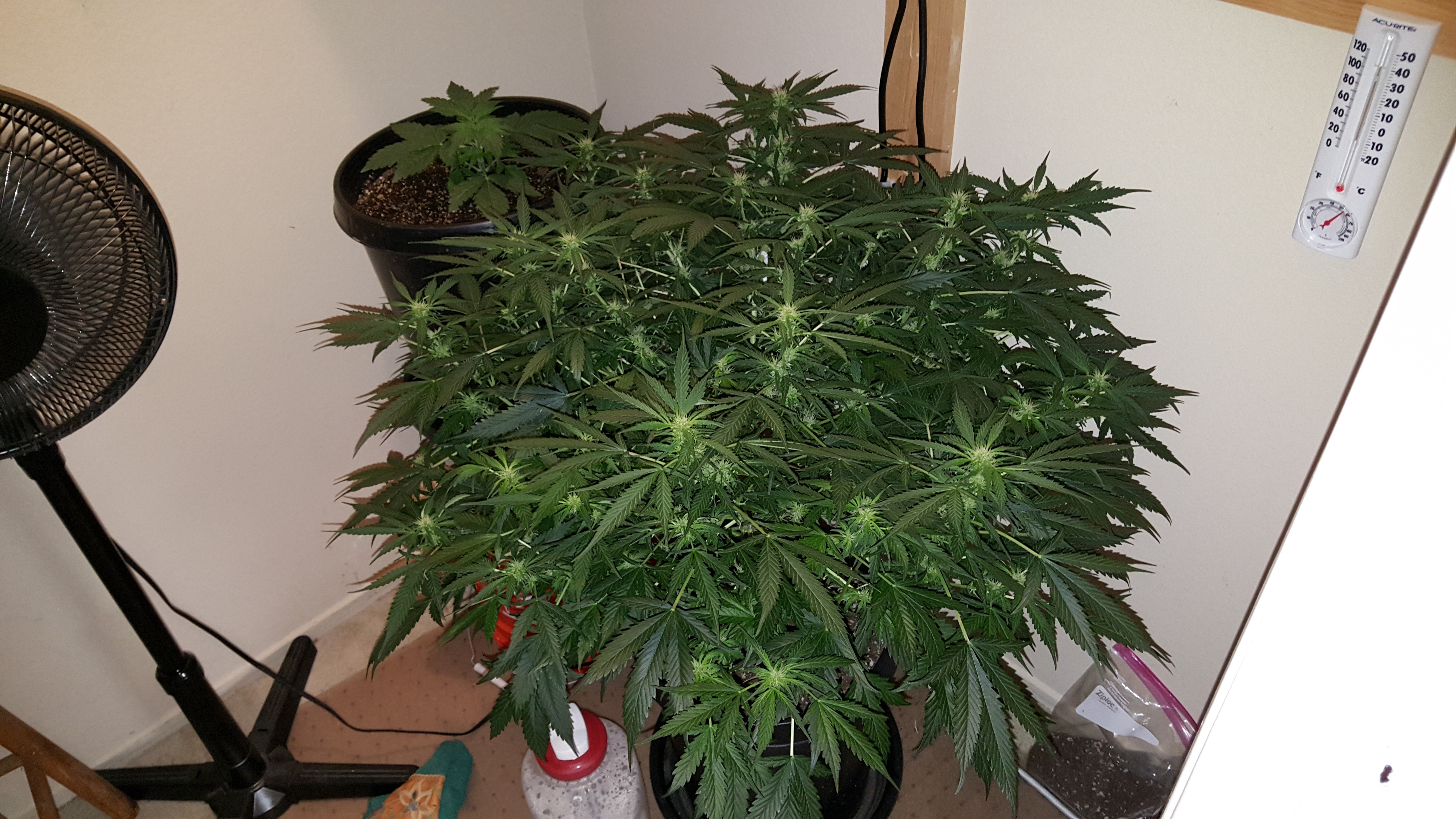 Hi Friends, I'm very very new to growing. This is my second plant and I feel like there are way too many leaves and bud shoots on this plant. I see pictures of young plants that are groomed down to just a few main branches with very few leaves with all the energy focused apparently on the buds. My plant looks like a bush! I removed allot of the veg from the lower branches, the plant is fairly flat on top with many many small buds growing but its just a mass of leaves. This is a northern lights plant almost two months old. I'm so tempted to just deforest the thing leaving just the larger branches and buds but I don't want to stunt growth with all the trimming now that its flowering Click image for larger version