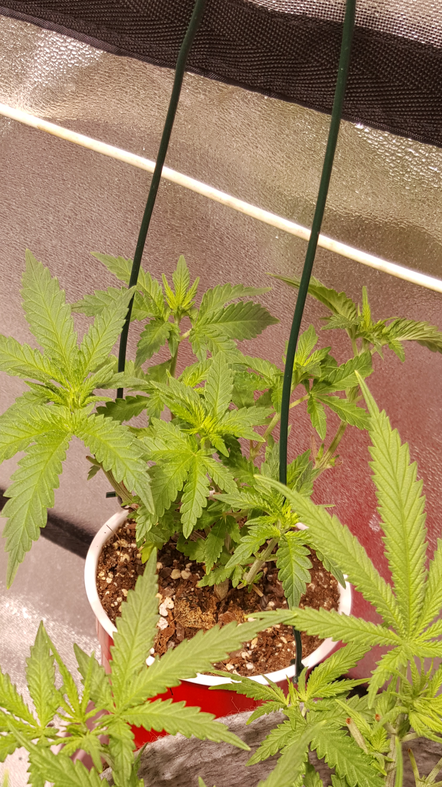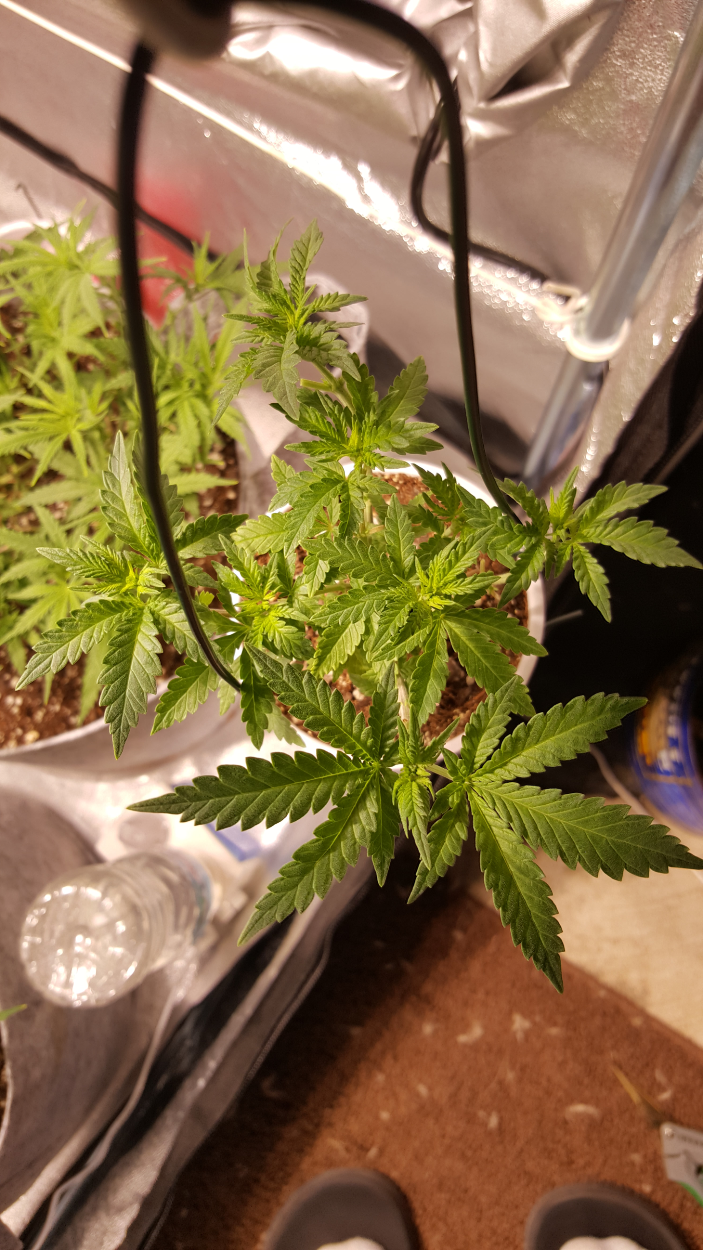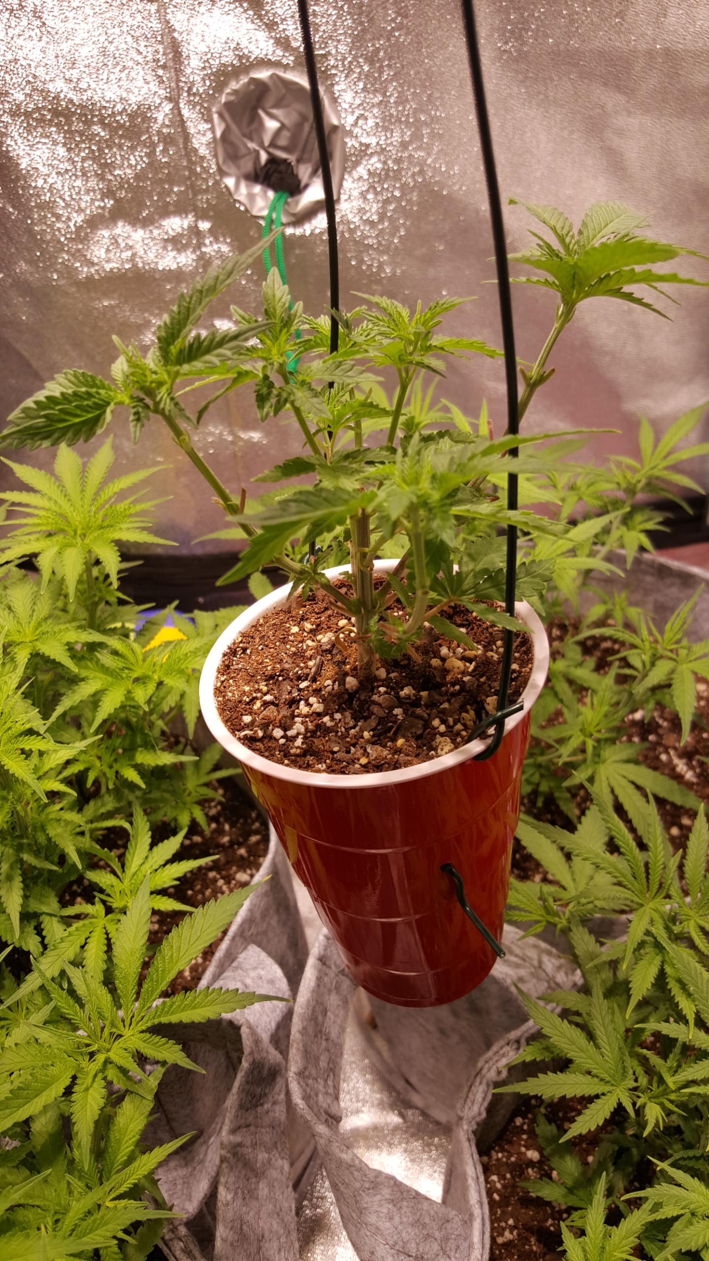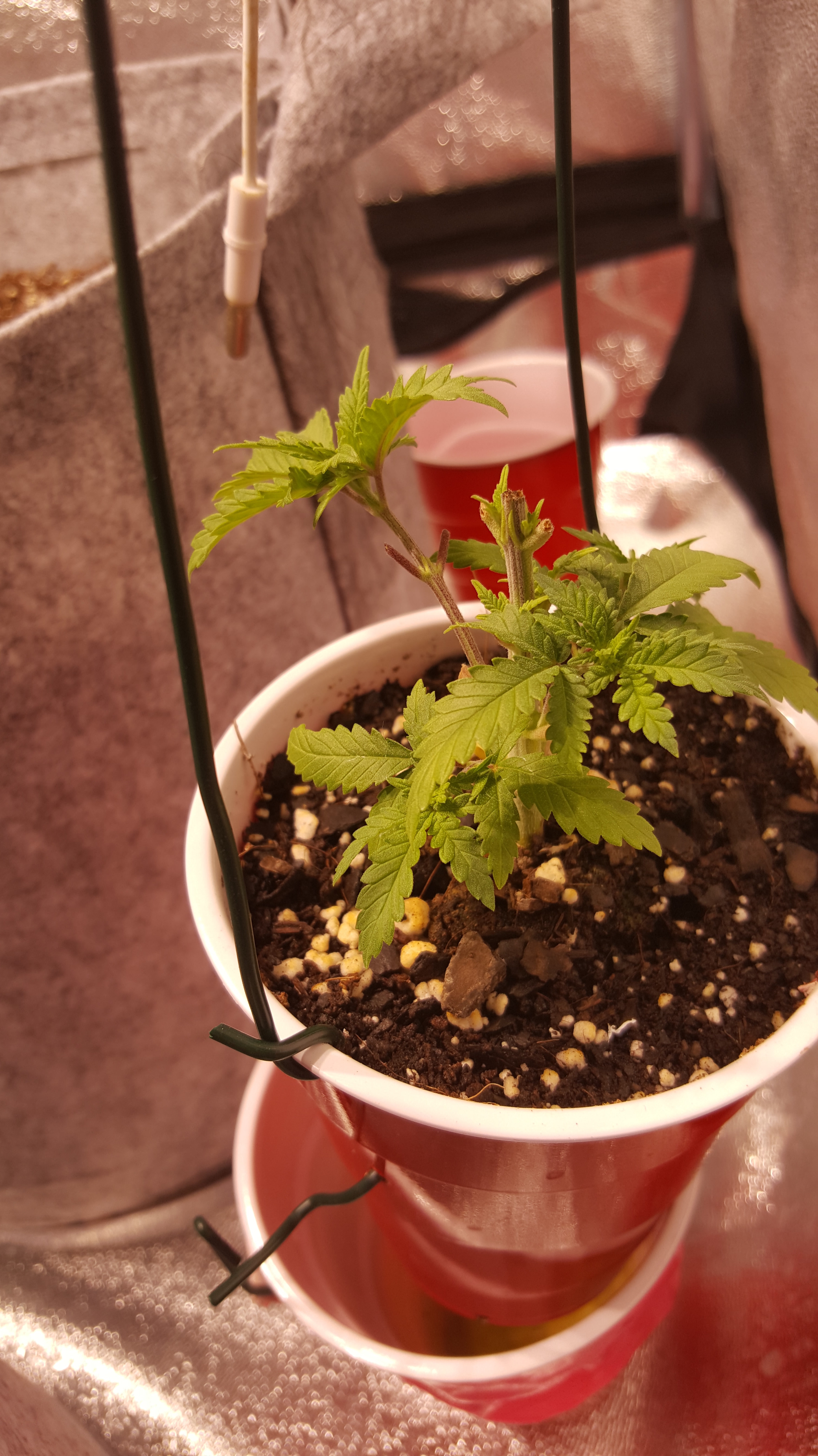 day 21..I topped her this morning at the fourth...I was not going to...but her vertical growth slowed down and her side growth took off...so I obliged her and set her desires to fact....I could barely see those two top node sprouts this morning...won't be a big yield but I will have a jar of it....(as long as she is not a he or hermie to bad...it is BAG seed).....