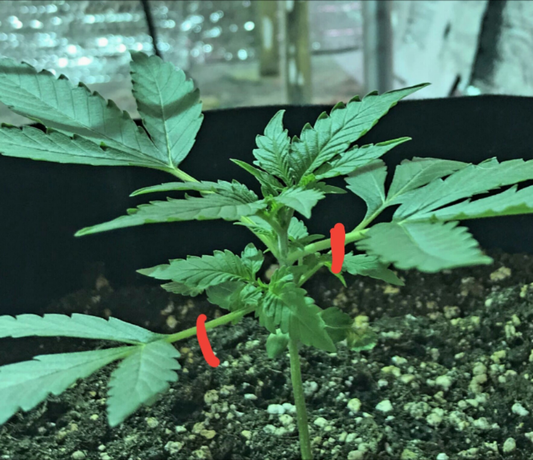 34 days. Had some problems uploading pics last week but all is well now. Watering 1L-2L every 3 days. I just notice a tiny bit of runoff. I feed more on days where I add nutrients so I get the 10% runoff. I also switched side lighting to LED’s from CFL’s. Nutes are 1/2 tsp per 4 L of water of each Micro,Grow and Bloom.2 Photos