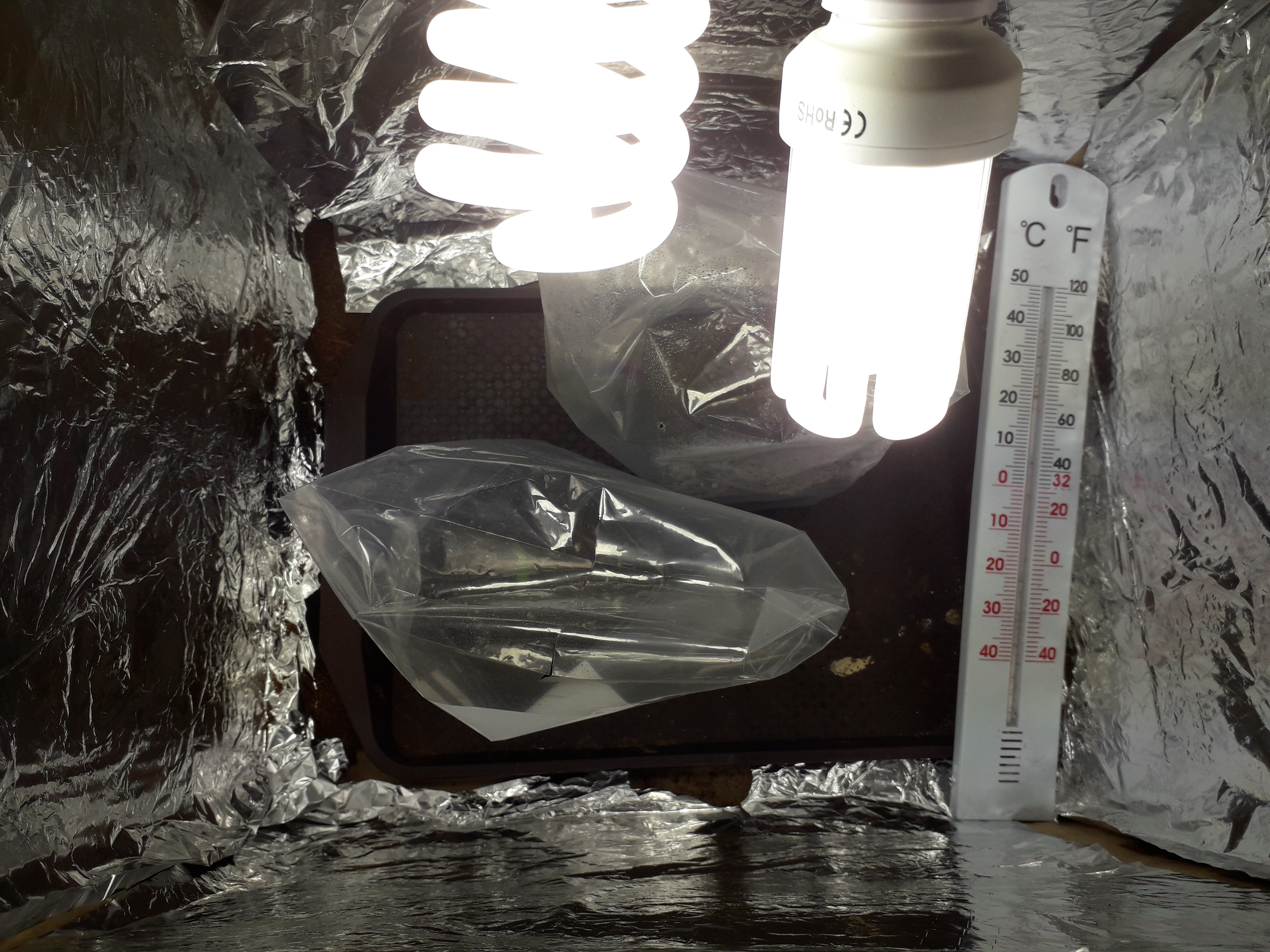 Day 21 looking good so far, I have them in bat soil wirh bags over them to keep them humid, and using 50w of cfls right now, but have a 125w duel cfl for the next stage, but how long before I should use that light? Or are they ready now? Click image for larger version