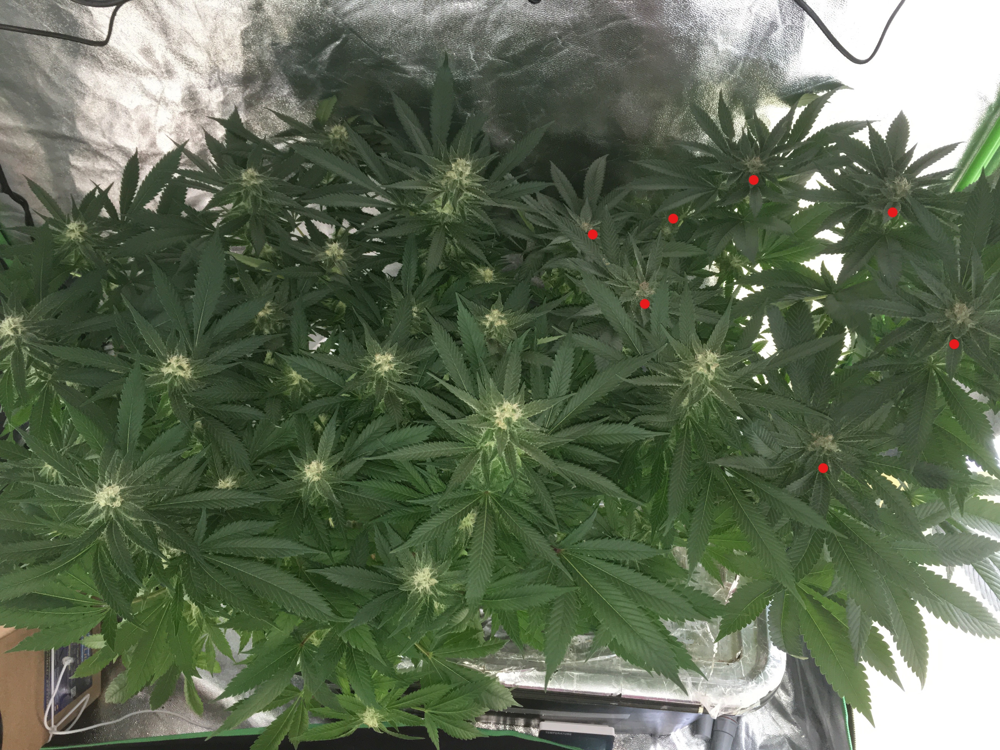 Afternoon mate...it can be pretty soul destroying posting with limited feedback. The plus side is this is a good grow mate. I wouldn`t do much more defoliating this late in but poss try and tuck some leaves outta the way but be mindful of mold. Personally, I`d have been heavier at flip and 3 week-usually by week 3 the leaves have bounced back but I find the canopy`s not so full so 3rd week is a bit less than flip. This is an old pic of a girl that shows how far I`d take it at 3...this is the max I`d do for but I`d expect good bud growth as well as good leaf development. That is a lot of canopy you have there so lower buds are likely to be more airy but hell, still a very healthy looking lass and great bud sites. She`ll yield well and next grow will build upon this. Defoliating is a personal thing...there`s not that many factors...well 2 really for me-you have to remove enough leaves to make defoliating successful and it depends upon the strain. It really is trial and error. I`d go 2/3rds of how much you think you need to remove if you find you generally overdo it and def more next grow. That`s what I`ve been working on anyway. Anyway, however you approach it, there will be mistakes but it`s a personal learning curve, one mother of a curve though. Good luck mate. Sorry for quality of pic but this old pic seemed to suit this chat well