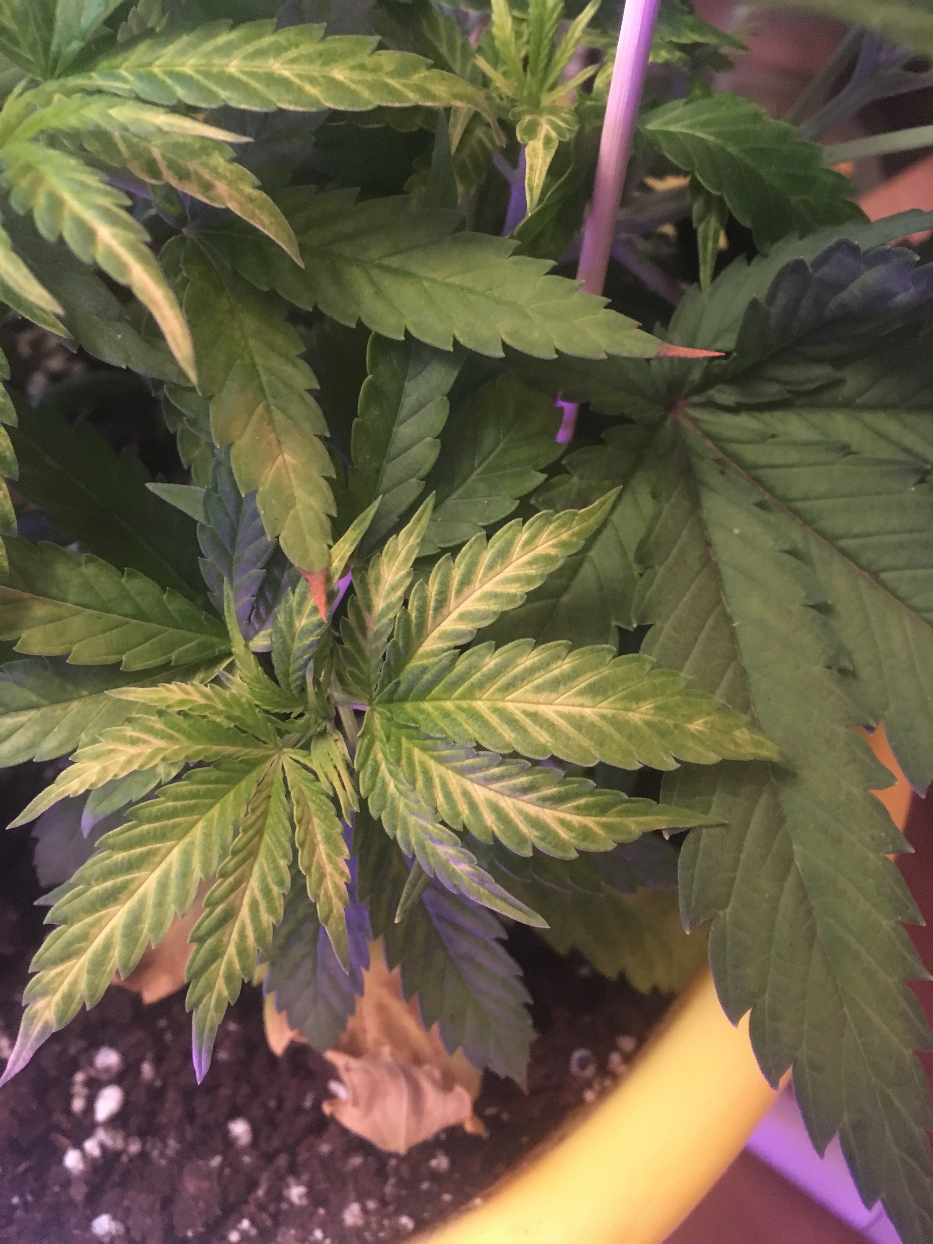 and a 2x2x4 tent........... Hopefully you can see in the picture that splotchy yellow mostly originating from the stem area on the new growth, which is also happening below the 'canopy' on the new growth; also the single and triple leaves on the bottom are about dead. I recently transplanted with a little bit rootbound into the larger pots, and these plants looked about the same before that........ Under the lights they look 80% worse , like they are burnt.......Any help or advice would be greatly appreciated. Thanks