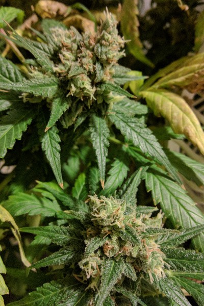Plants A and B are doing well. I am seeing good frost on the buds. But I'm starting to see what looks like heat/light damage on the fan leaves directly under the LED on this grow. I am beginning to wonder if this strain likes it a little bit cooler in flowering. (Maybe it's better suited to a winter grow in my place?) So far, no signs of damage to the buds or sugar leaves. But I'll be watching this like a hawk. I have my LED up at max height right now, so there isn't room to adjust, really, but perhaps I can rig something.
