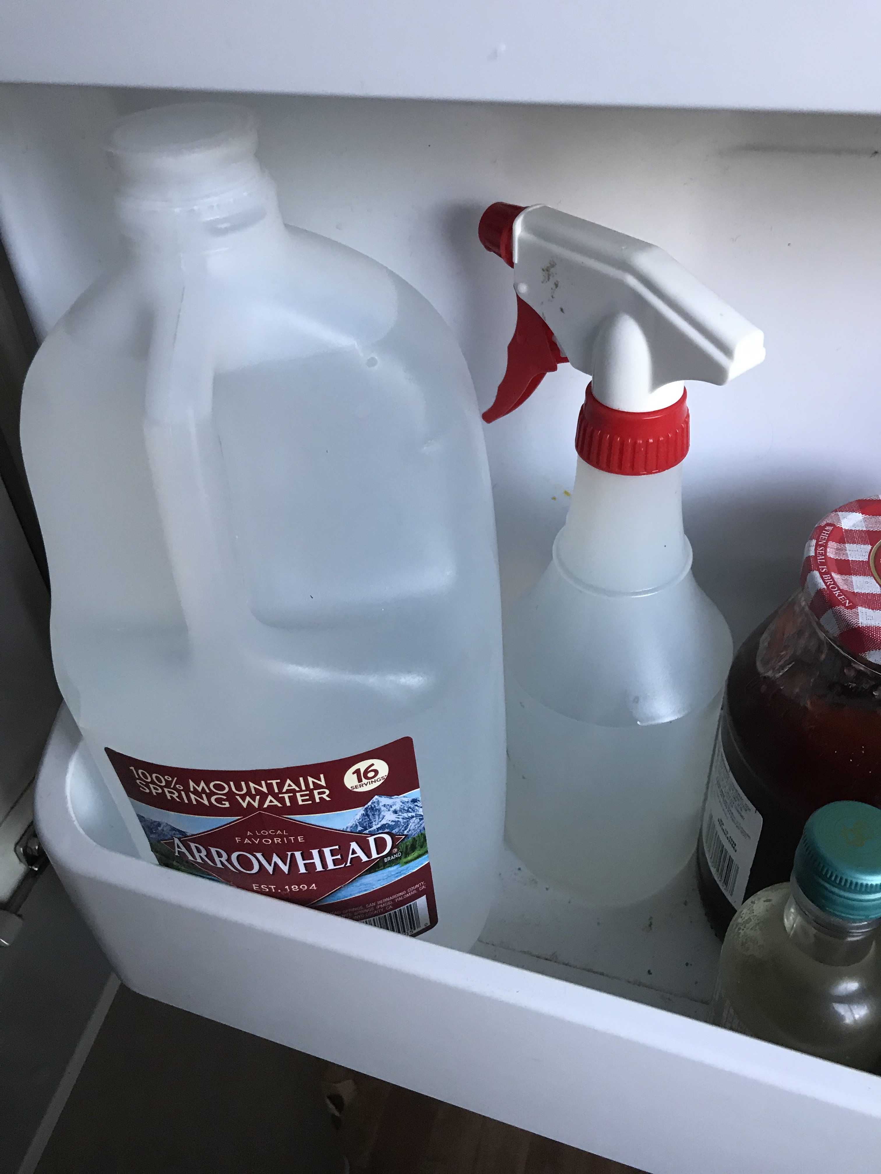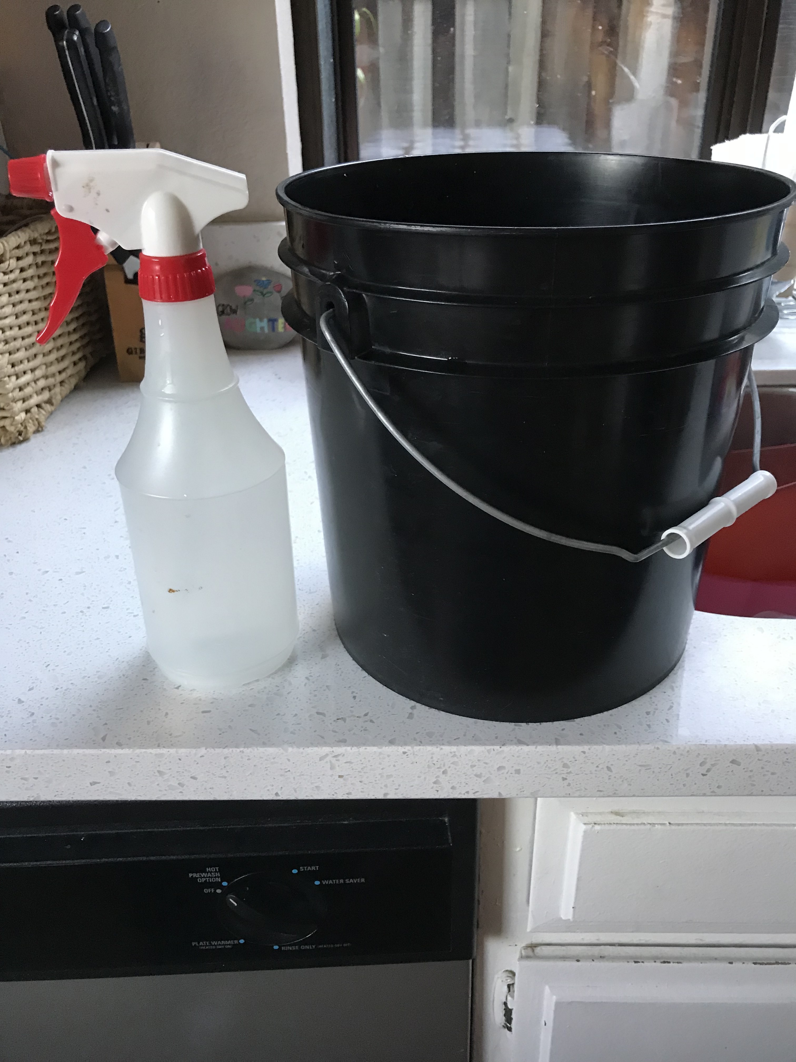 2 gallon bucket 1/2 full with water (will be soaking the dry trim in this bucket with some ice added first thing in morning. Will soak for several hours before I wash it), spray bottle full of water, and 1 gallon jug full of water. Chilled overnight in the refrigerator.