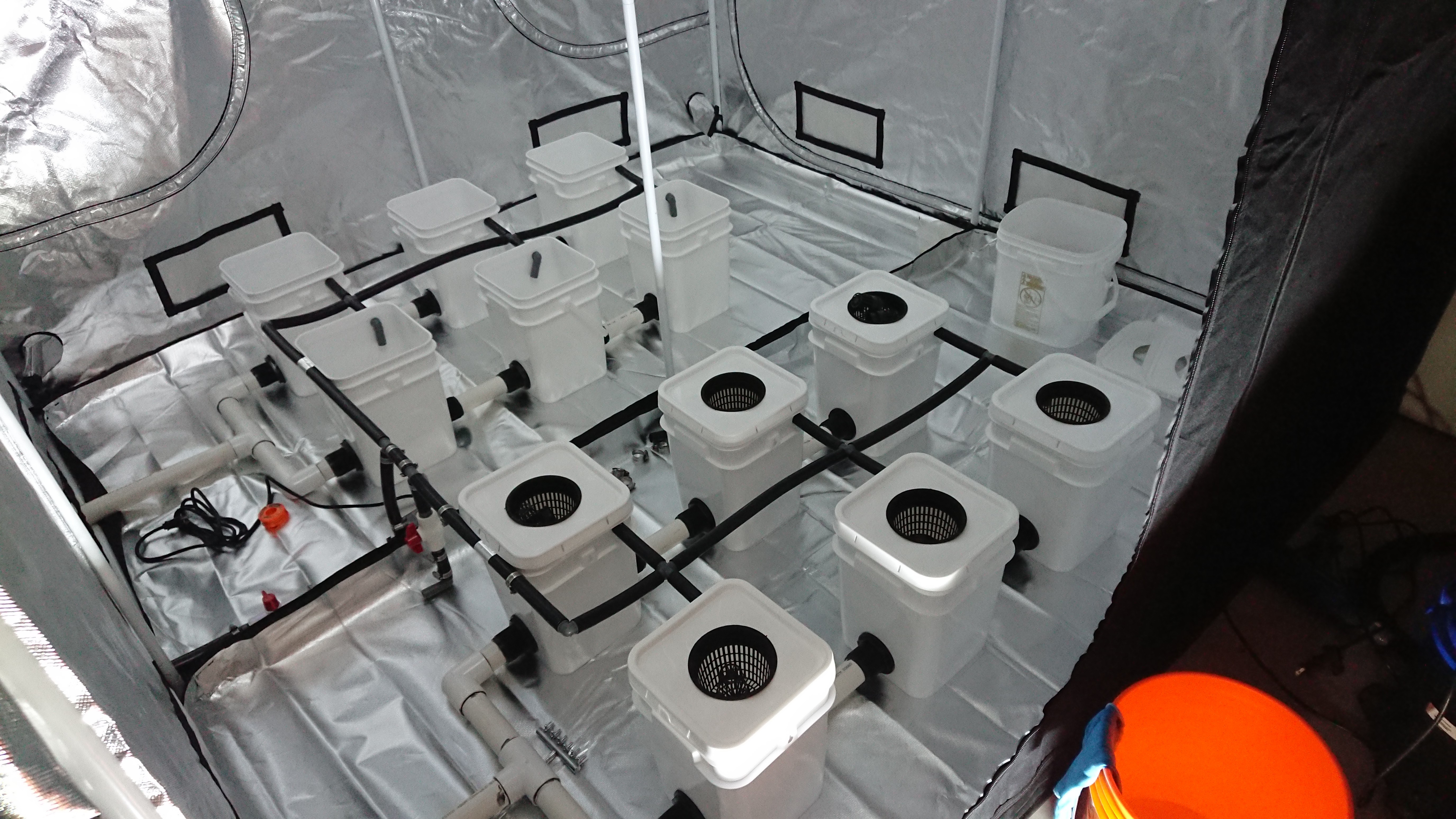 If u could use some of that 2 inch pvc u got for ya drain to make a manifold running where the black like runs between the buckets then pipe off that u can pipe into the 2 inch with the .75. This will cause the 2 inch to fill first then give even presser to all buckets the same way the manifold on the air pump works water has some unique property's diffrent from electricity