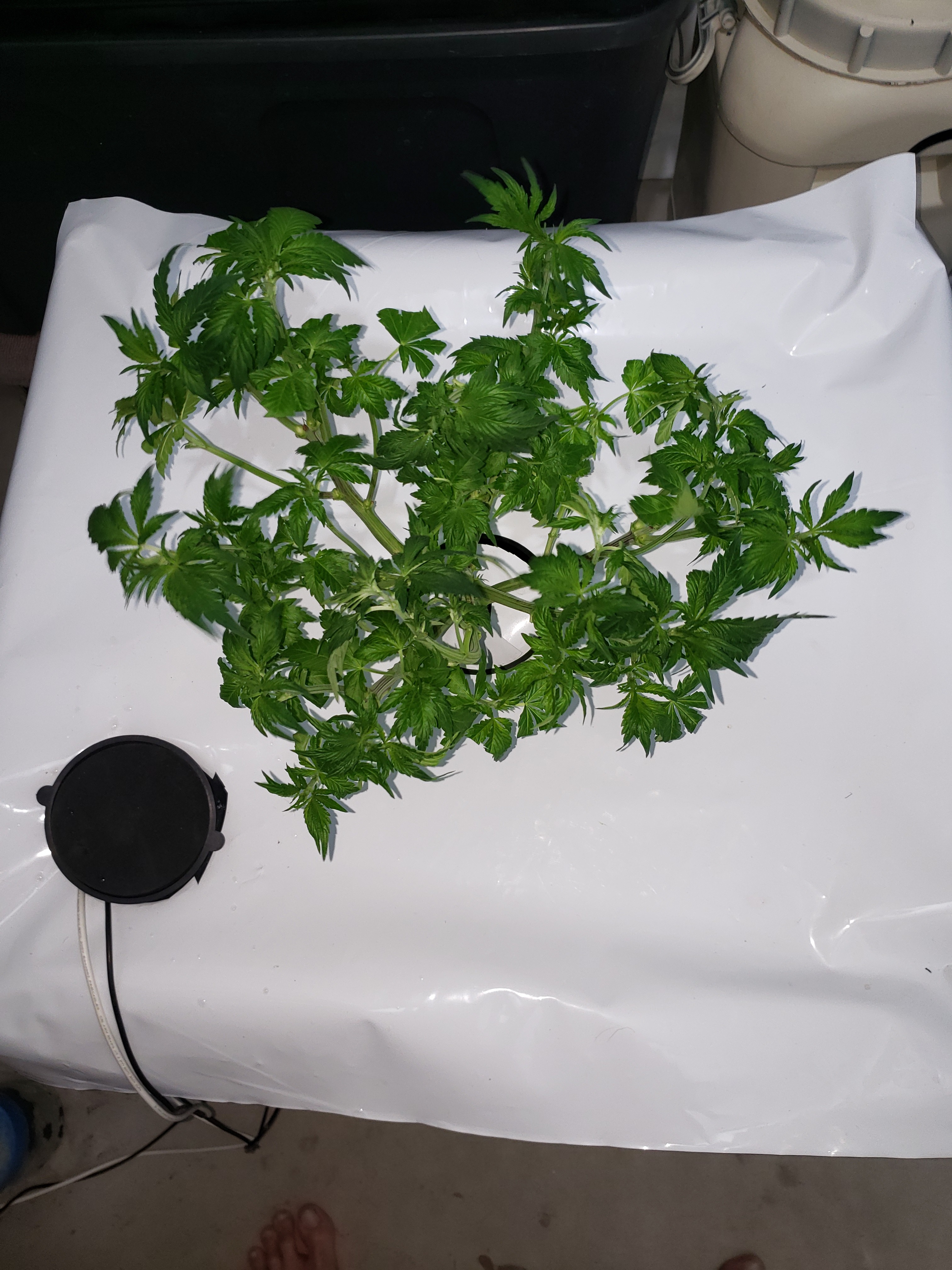 Before I transferred the starter cube into the net pot and then into the aero bucket, I trimmed the cube, cleaned off the algae, set the cube low in the basket and covered it with hydroton. My thinking was that if the cube was buried and there wasn't any light on the algae, all would be well. I should have probably done the opposite and left the top of the cube exposed to the air, let it dry out and not had the first nodes down below the top rim of the basket, where the nasty shit was apparently still active. Also, I've got my fan hanging right where it was after my last flower cycle, about a foot and a half from where it should have been for a five node seedling.