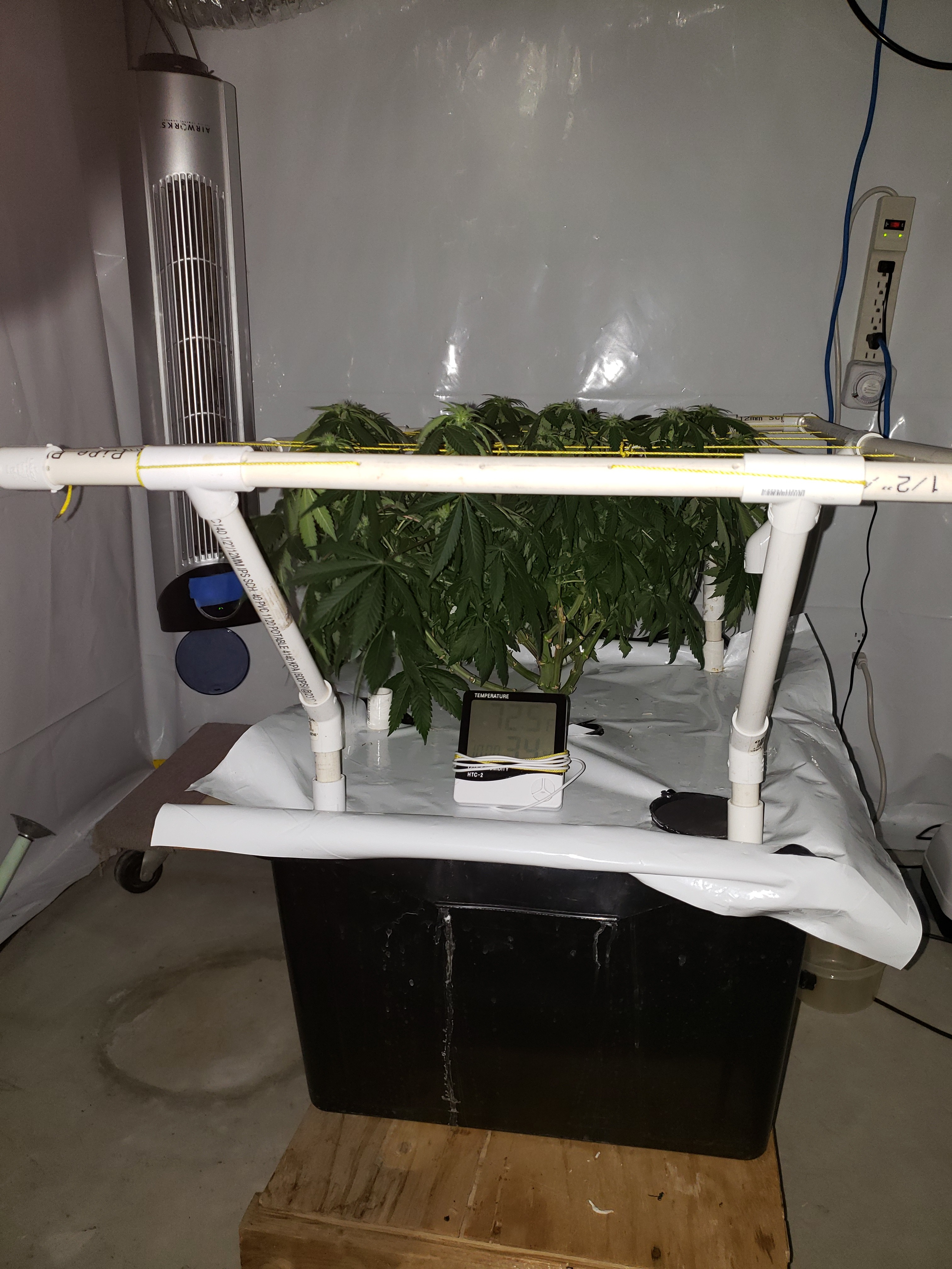 Thankfully, it doesn't look too bad and I think I've got it sorted out. I pulled all the hydroton out and washed it in a 10% bleach/water solution and then put it in the microwave to steam clean for 10 minutes, so it's sterile (this is SOP for me starting each grow). My root ball is still healthy and white, but I gave it the bottom of the plant / top of the roots a H2O2 bath, which I hope sterilized the problem area before I replaced the hydroton. Defoliation and training was done to about 70%. I left a few branches and leaves that I probably would remove under normal circumstances, but I want to get some clones off this girl in the next ten days in case the stem rot turns out to be fatal.