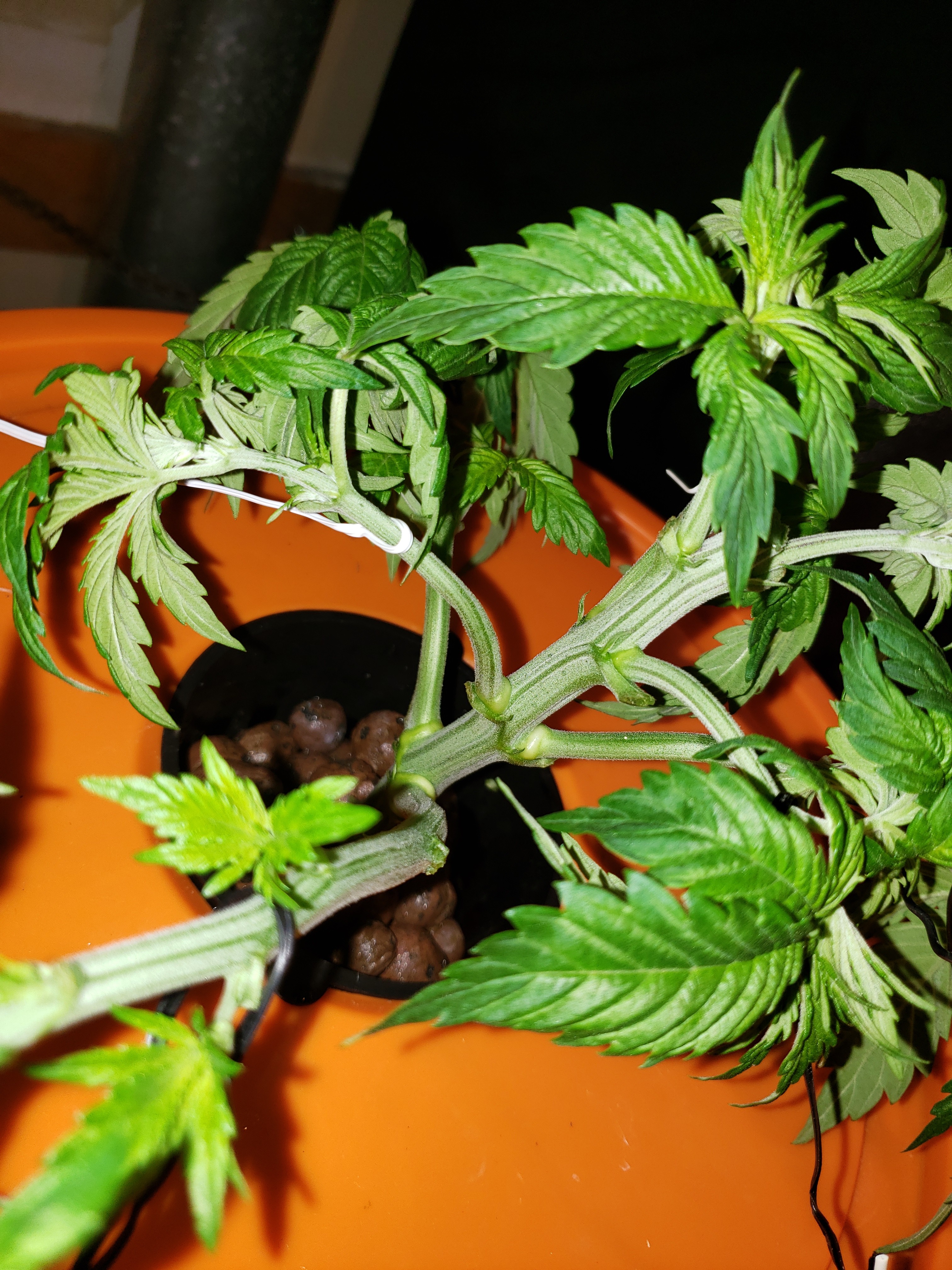 If she keeps going well, training isn't going to be as straightforward as I'd hoped as the plant has a pretty distinct asymmetry, not just from the missing bottom branch, but all the way up the plant. Normally a seed grown plant puts out the main branches from the central stem pretty much on opposite sides of the stem and in line. This girl has her opposing branches offset vertically, just like you'd see from a clone branch...weird, but I'll see what I can do with it.