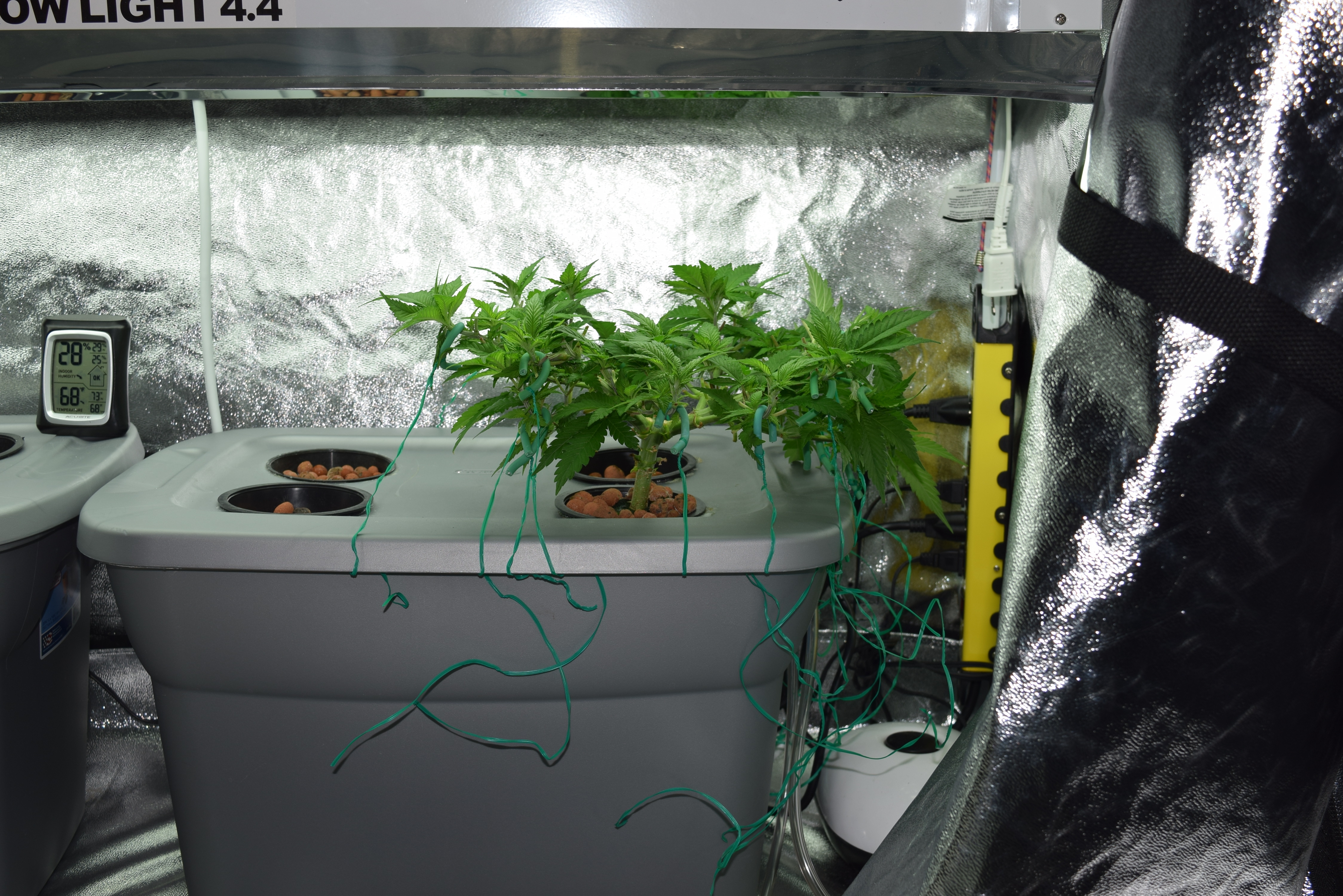 Using 4x 300w LED lights and DWC hydroponic system. There are 4 growing totes each with 5 gallons of water in a ten gallon tote. Each tote will grow two plants placed as far diagonally from each other as possible. The main tote is a 30 gallon tote holding 20 gallons of water. It's job is to supply oxygenated, nutrient rich water.
