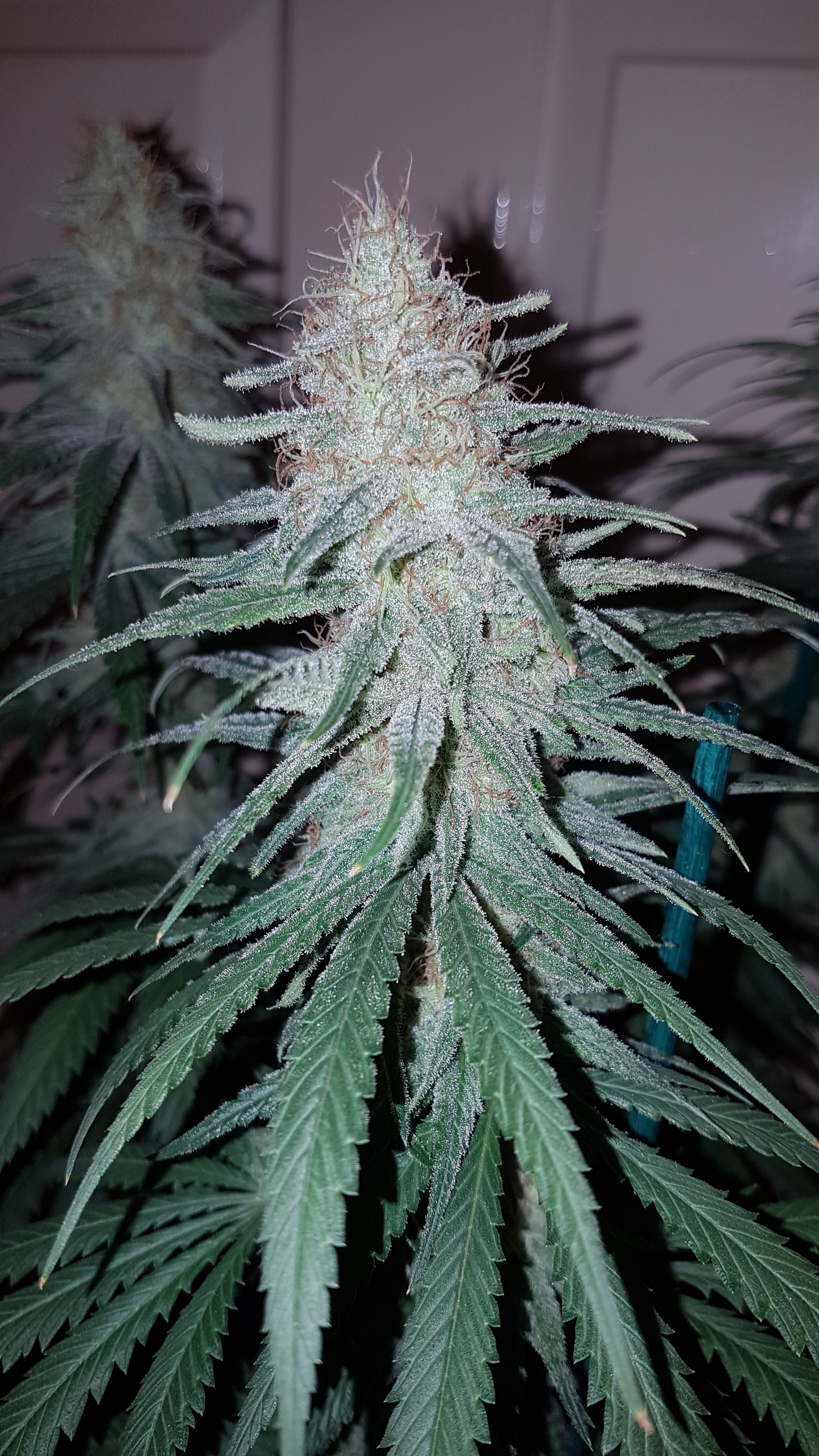 Hi all, It's now 8wks and 4 days since flip, getting oh so close now at least for 1 with another not far behind as for the other well your guesses would probably be better than mine lol keep extending my guestimate. I stopped the feeds on my short Fat banana now and I'm just watering that one now as i think she has maybe a week left now although I could be wrong. The taller Fat Banana is at least a week behind I think. Gave her what may be her last feed today but still a little unsure on that. The Critical Crack got her last feed today too today think she will be 4-7 days behind the short FB. Had a little scare when i first opened tent today. The taller FB had most of her branches leaning over. I didn't get chance to water yesterday like I intended so she had gone longer than I wanted with out water and was really droopy today. My one stake wire engineering i had created to hold branches up was no longer effective so went out and bought a pack of 60cm plant supports and now have those in place on each branch which should see her through to the end. Buds on all are not getting as fat as I would like and have an average length of about 4 inches so not a as big as some on here I've seen but i have buds at least and they feel dense and are nice and frosty anyway on to the pics. First 3 are the Tall Fat banana before and after supporting, next 2 pics are the short Fat banana and first that will be ready, jewellers loupe is arriving tomorrow so will get a better pic of the trichomes then. Last but not least is the Critical Crack, i think she will be ready sometime between the 2 fat bananas.