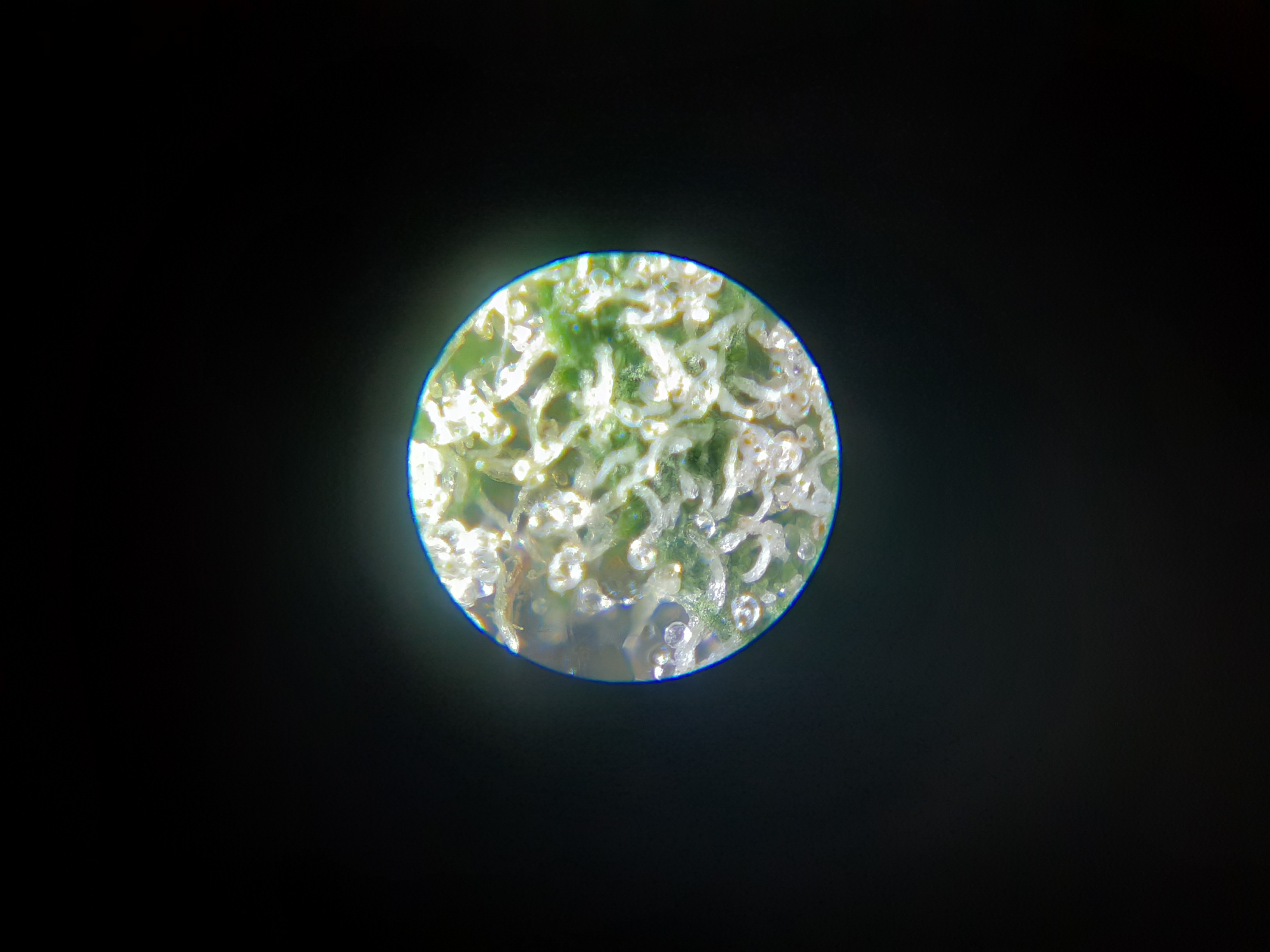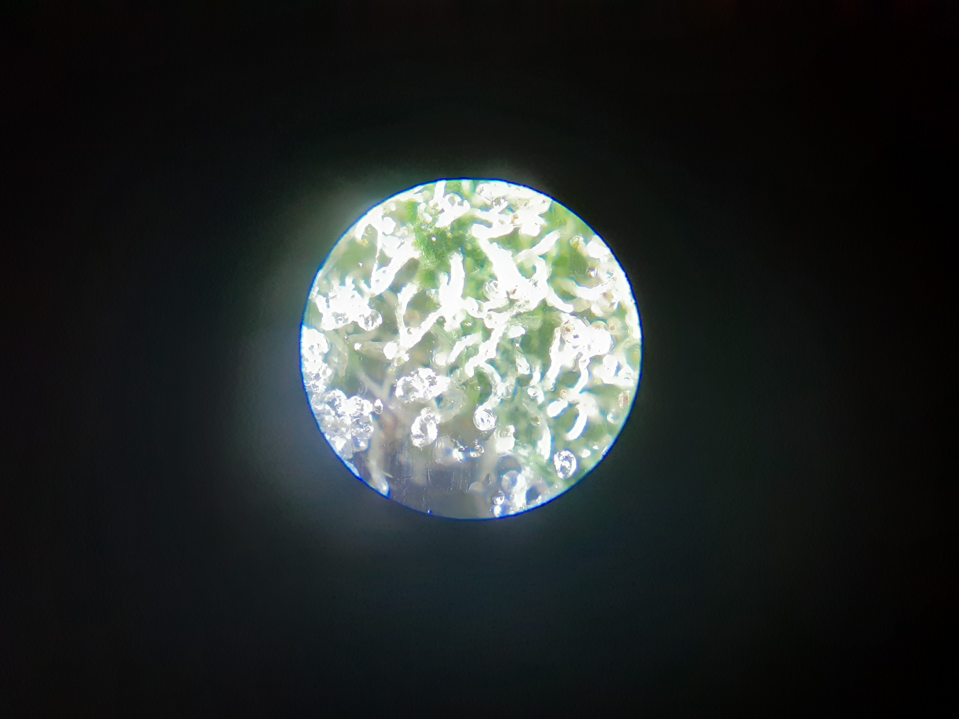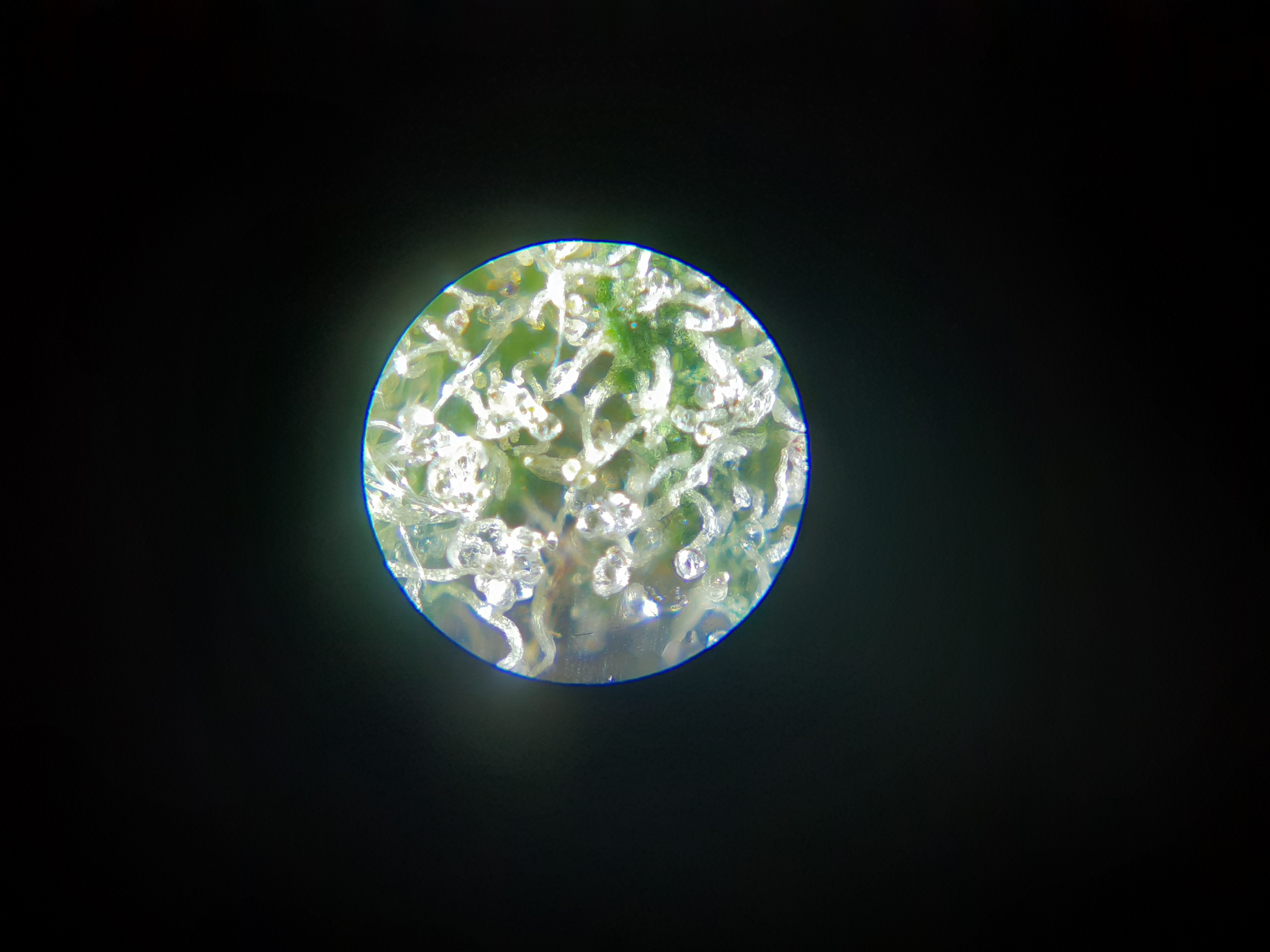 Ok so seeing Wolfe0420 photos, I wondered if I could use my mini microscope and my phone to take a photo. Well I put bud in between microscope slides. The one just harvested.