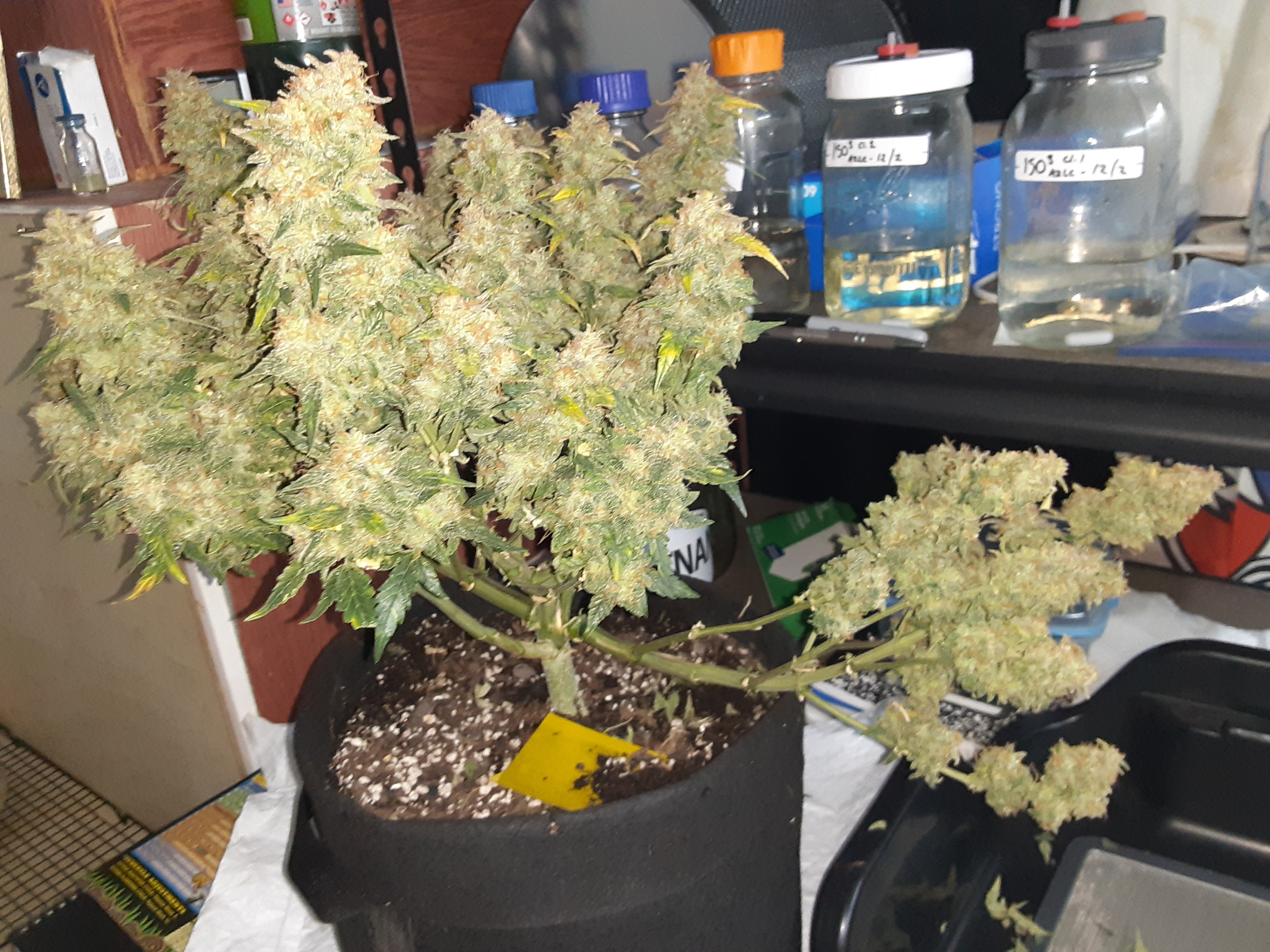 Well she was topped and just popcorn nugs all over but a lot. Still drying but probally 3quarts full of small lil nugs. I think I'll weigh before cure