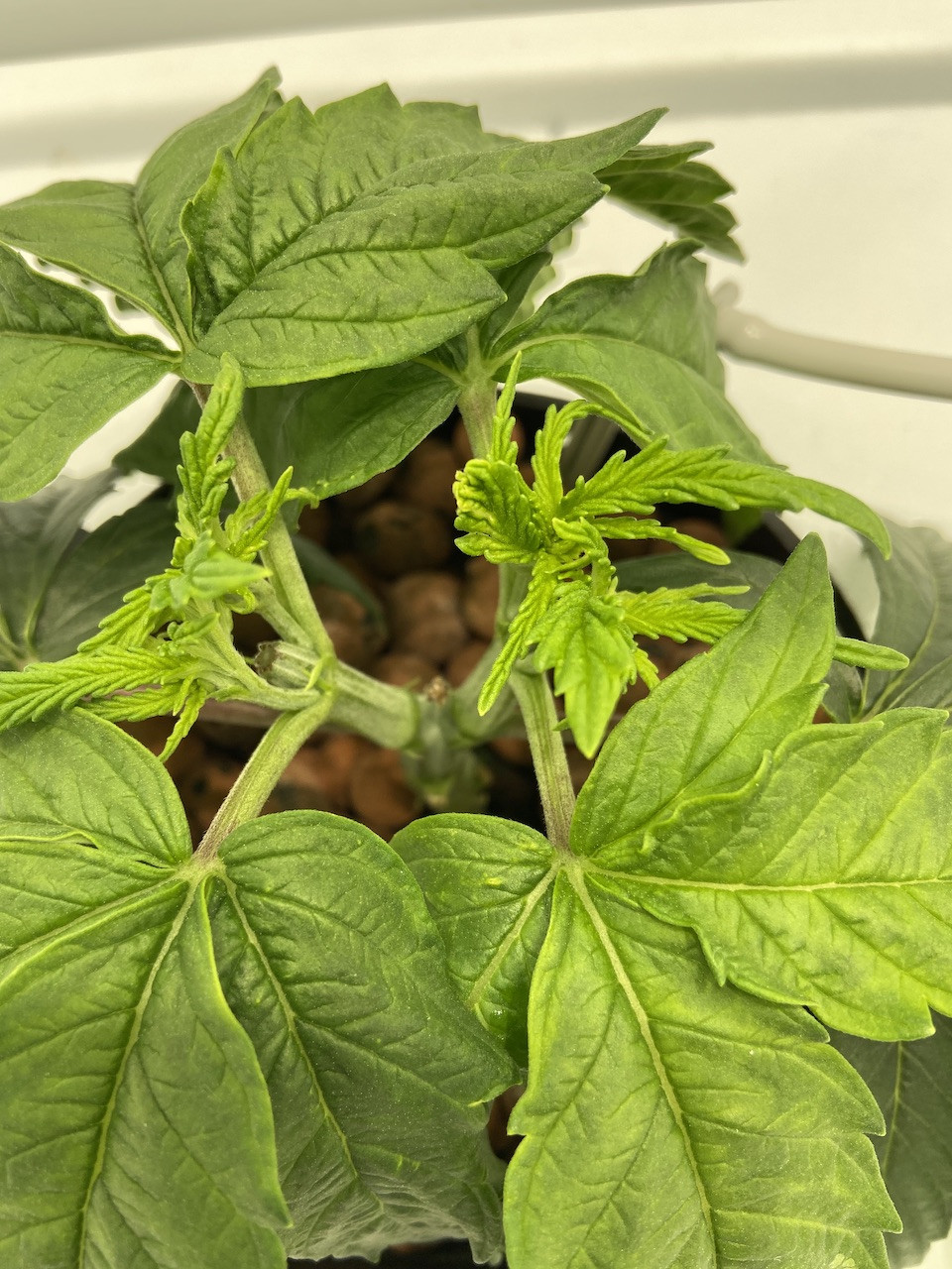 The Mimosa Evo (BarneysFarm) w/ 30% THC potential has had weird leaf growth since the beginning, but seems to be coming along; ya never know about some of these genetics; the Triple G (Royal Queen) has beautiful leaves. I love mainlining.