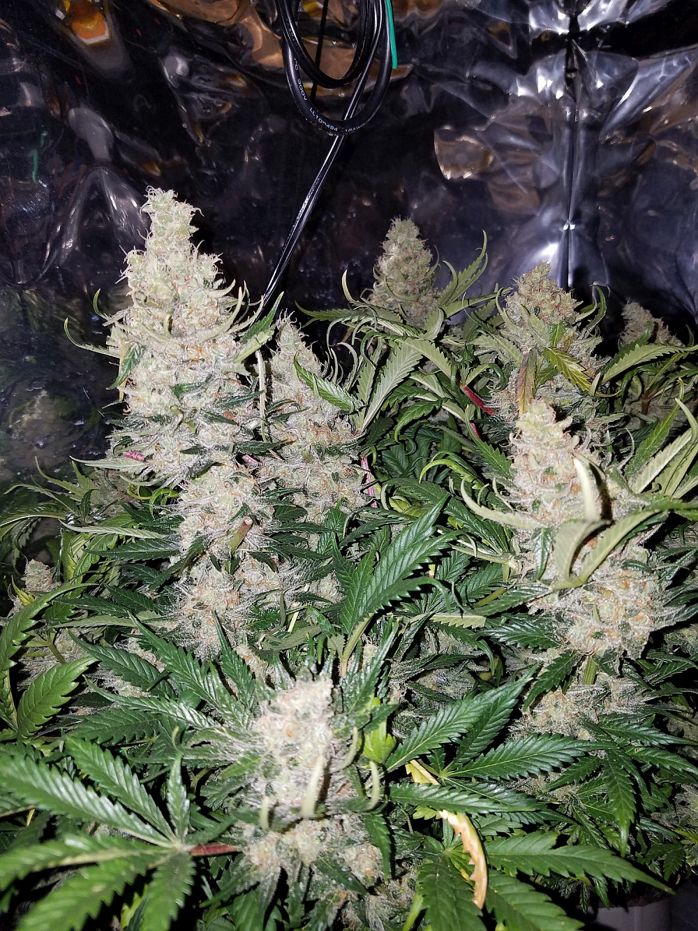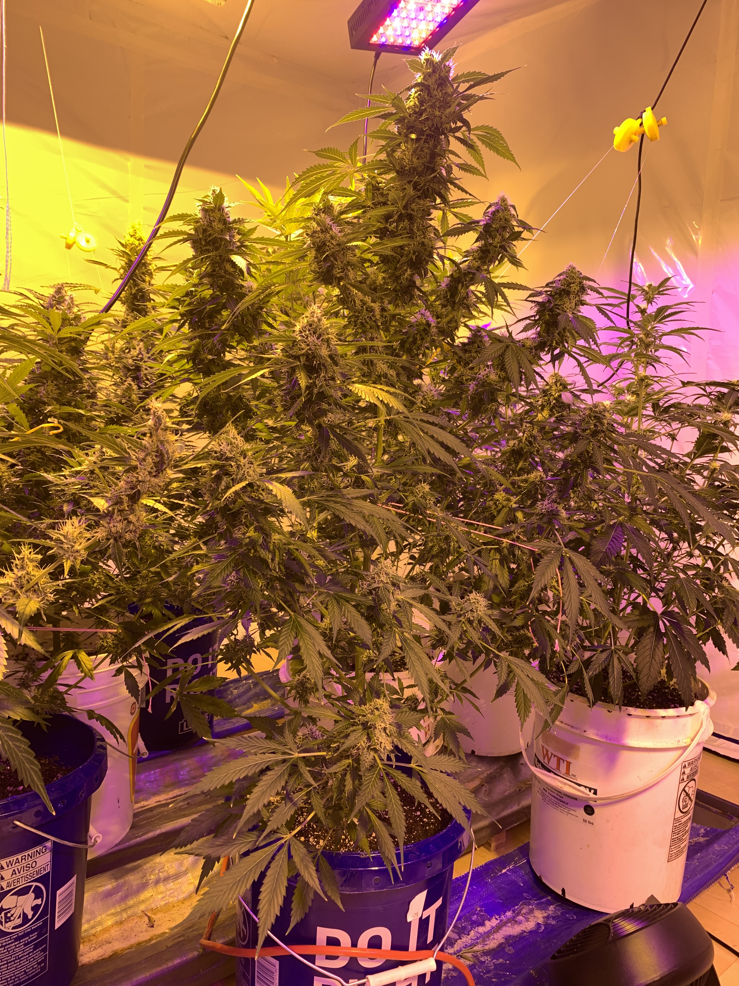 Well, they’re starting to finish now... all at different times which is truly a blessing. I’ve taken down a few of the AK’s, but the critical mass are still actively growing new pistils, and not a single one has turned red yet, so really no idea when they’ll finish. If I believed the breeder😂😂😂 they’ll be done in 2 weeks, but that’s definitely not happening. I would love to get some individual plants out of their places to get some better pics for you, but the room is a sea of yo yo’s now, and I can’t breathe on them without a branch falling over. I promise some good pics at harvest. Will also make a separate post of my mutants, of which there were a few 😂