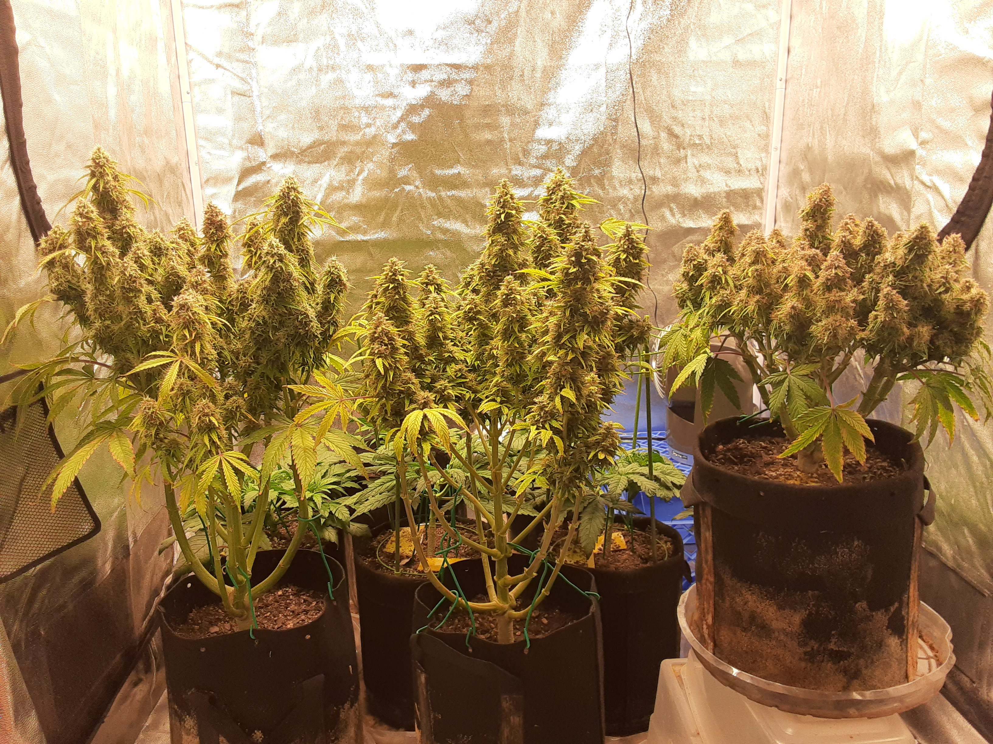 Here's my tent today - mature girl on the left is a Revolver - 2 on the right are Girl Scout Cookies and the remaining one is a Bruce Banner - all autoflowers. The girls about to explode are 55 days old.