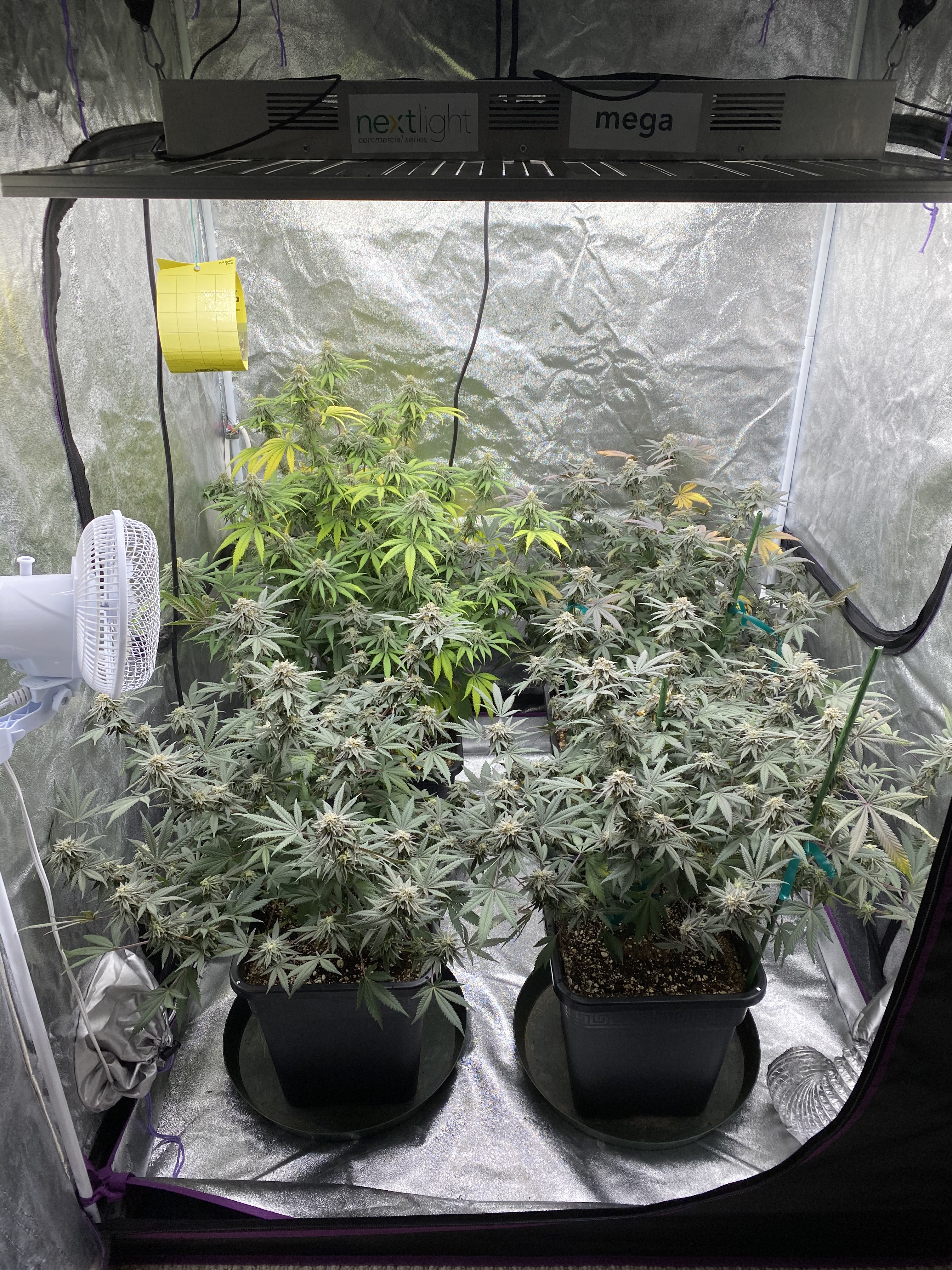 4’x4’x6 1/2’ tent, Nextlight Mega, Roots Organics 707 soil in 5 gallon square plastic planters, GH Flora Series Performance Pack nutes alternated with Fish Sh!t in RO water