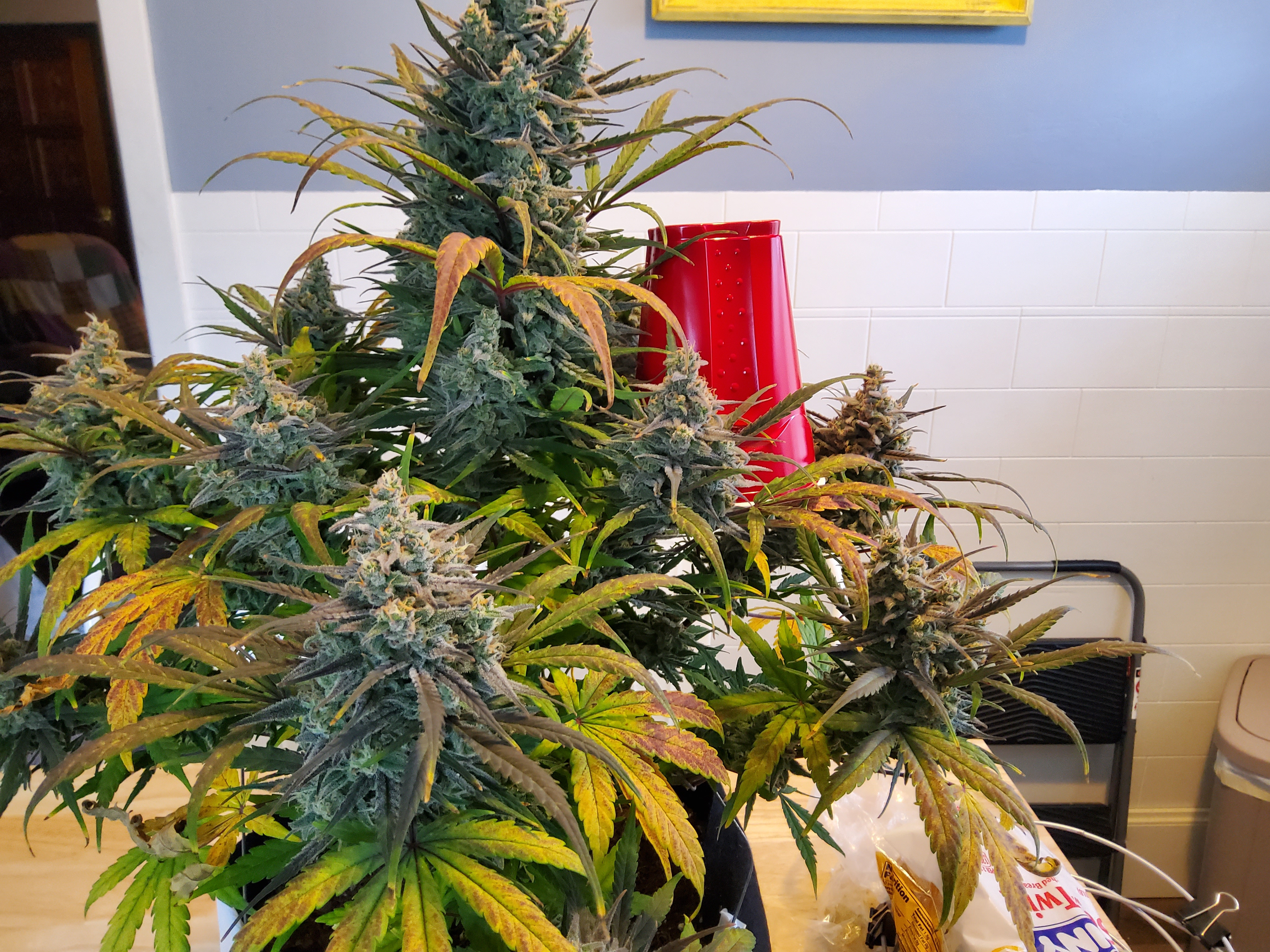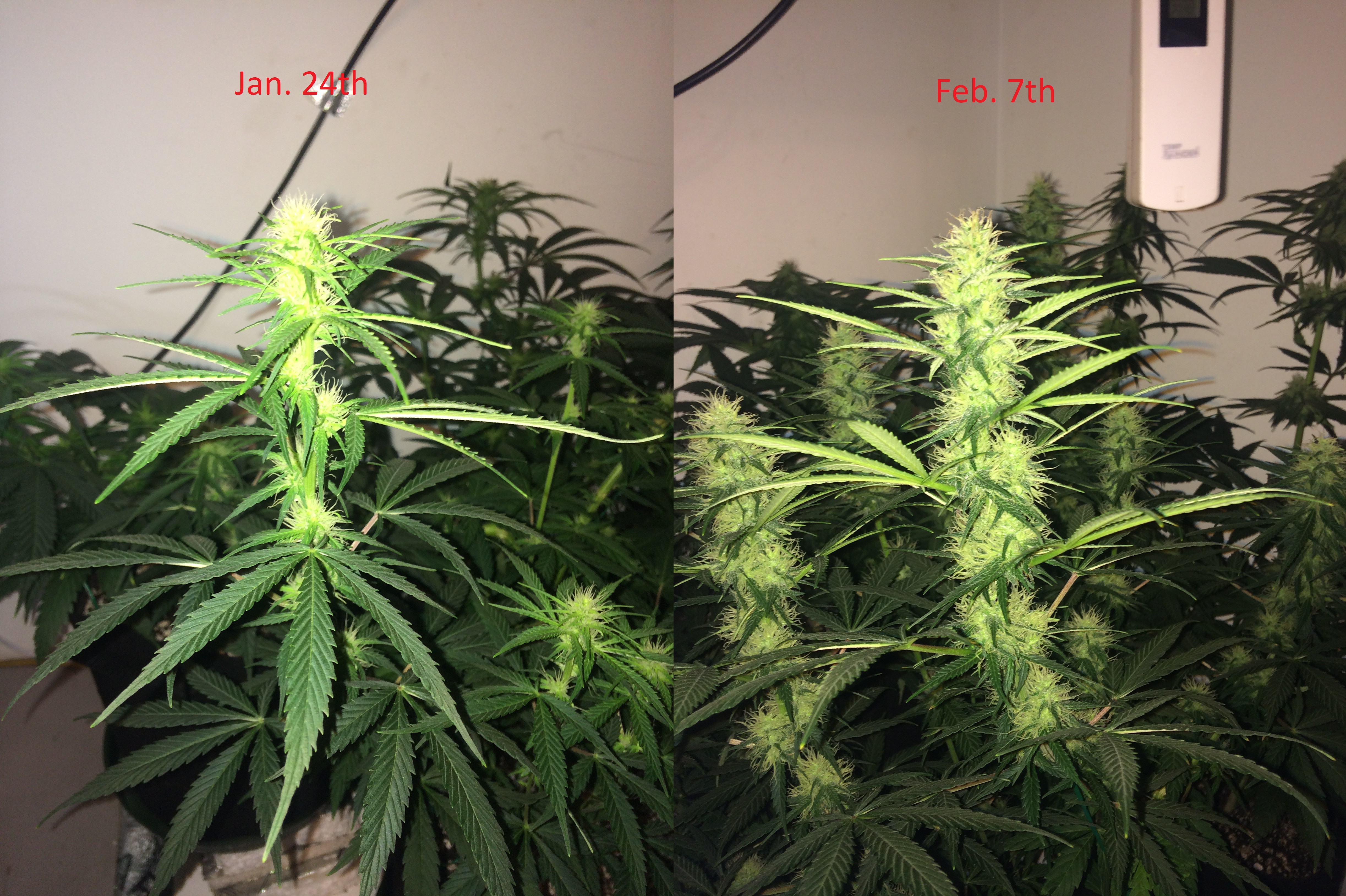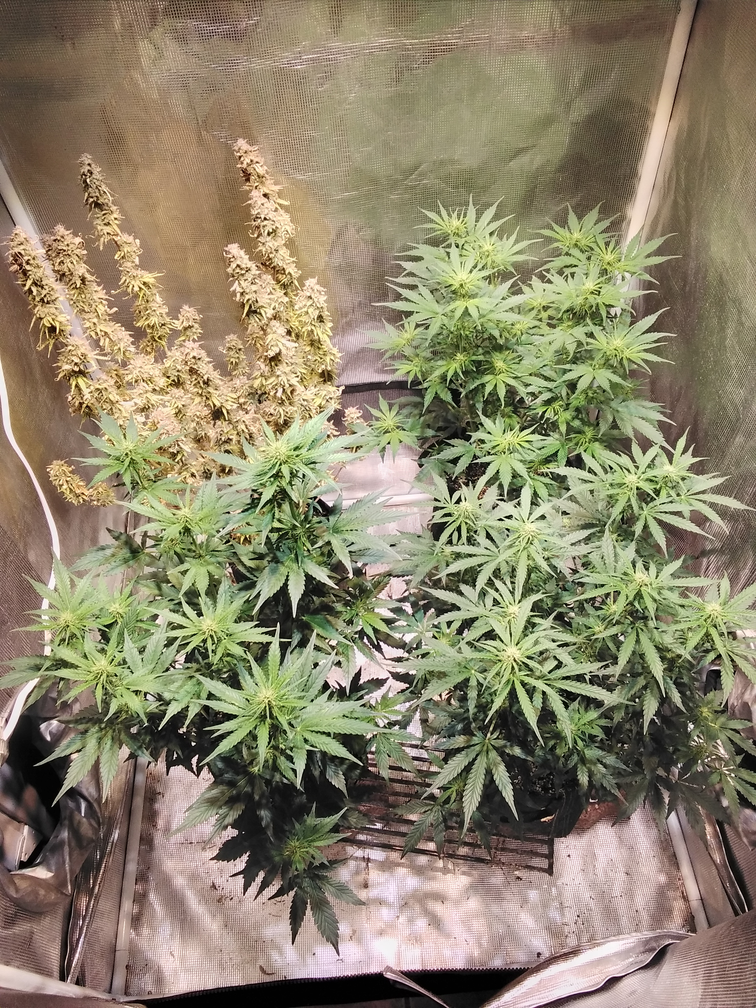 Yeah I'm pretty baked. I wish I had a time machine, I'd go back and fix all my problems from previous grows. This has just been a good run. I fed them really hard and pushed them in early flower. They grow real quick in early flower. They just finished week 4 of 12/12. The sour kush takes a bit to get going. I got a cookies & cream off on the left, it's a little more steady eddy