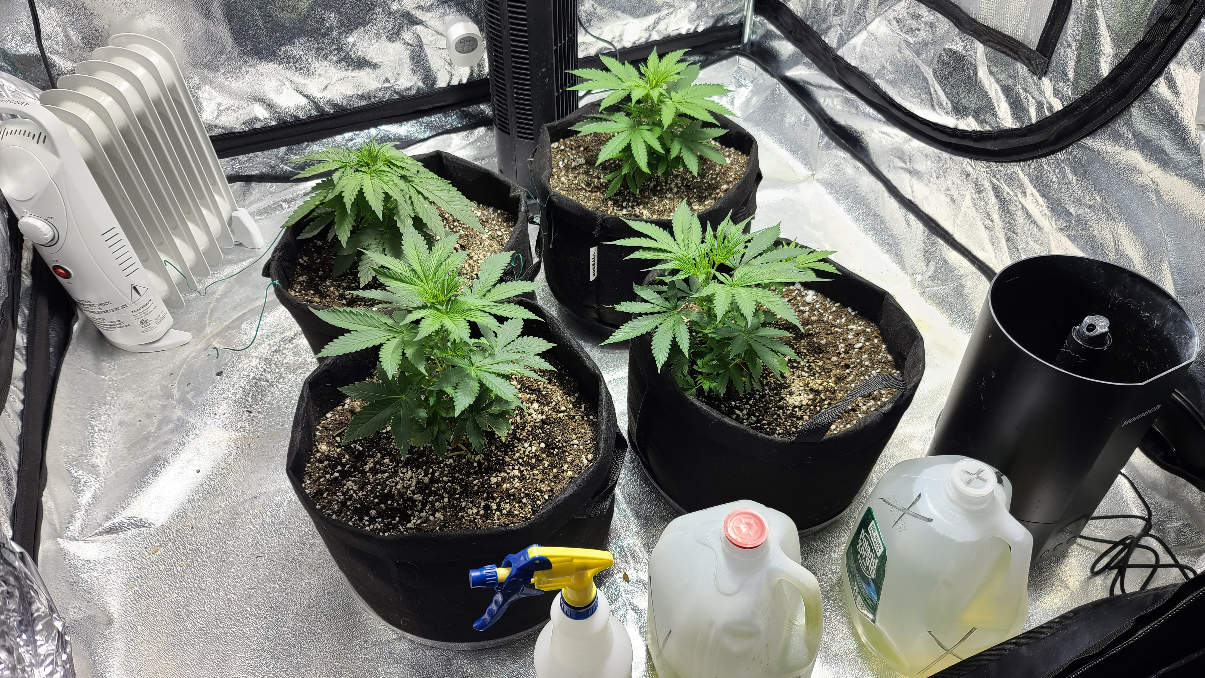 I was able to take 22 clones of blackberry dream yesterday and still leave some good ones for later if I need them in the second pic is my gravity fed heater for the space ,third is the end of ducting and my humidifier 4th is whats left on the mother think she will like it just fine at the back of this tent for now