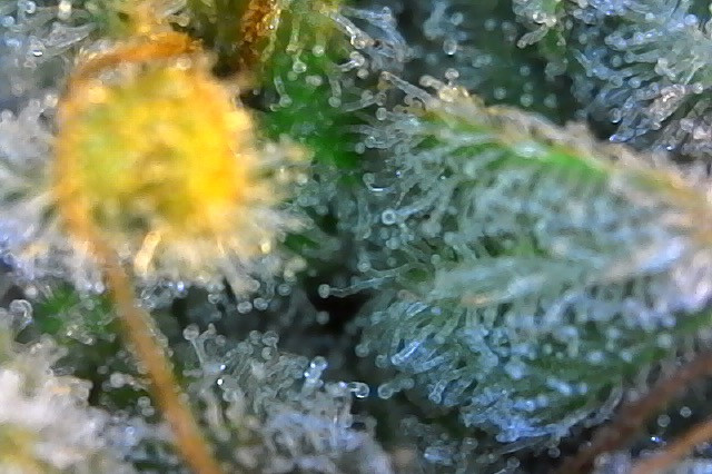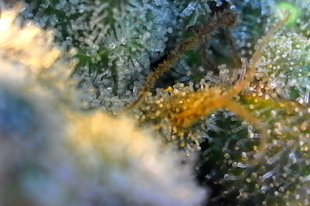 Big Bertha made it to 46". The sugar leaves scintillate like little tiny people with mirrors. With a light squeeze of any two buds my thumb and forefinger are sticky enough to pick up a piece of kitchen paper. The Berthettes have also added a little in cola height. Not as sugary.