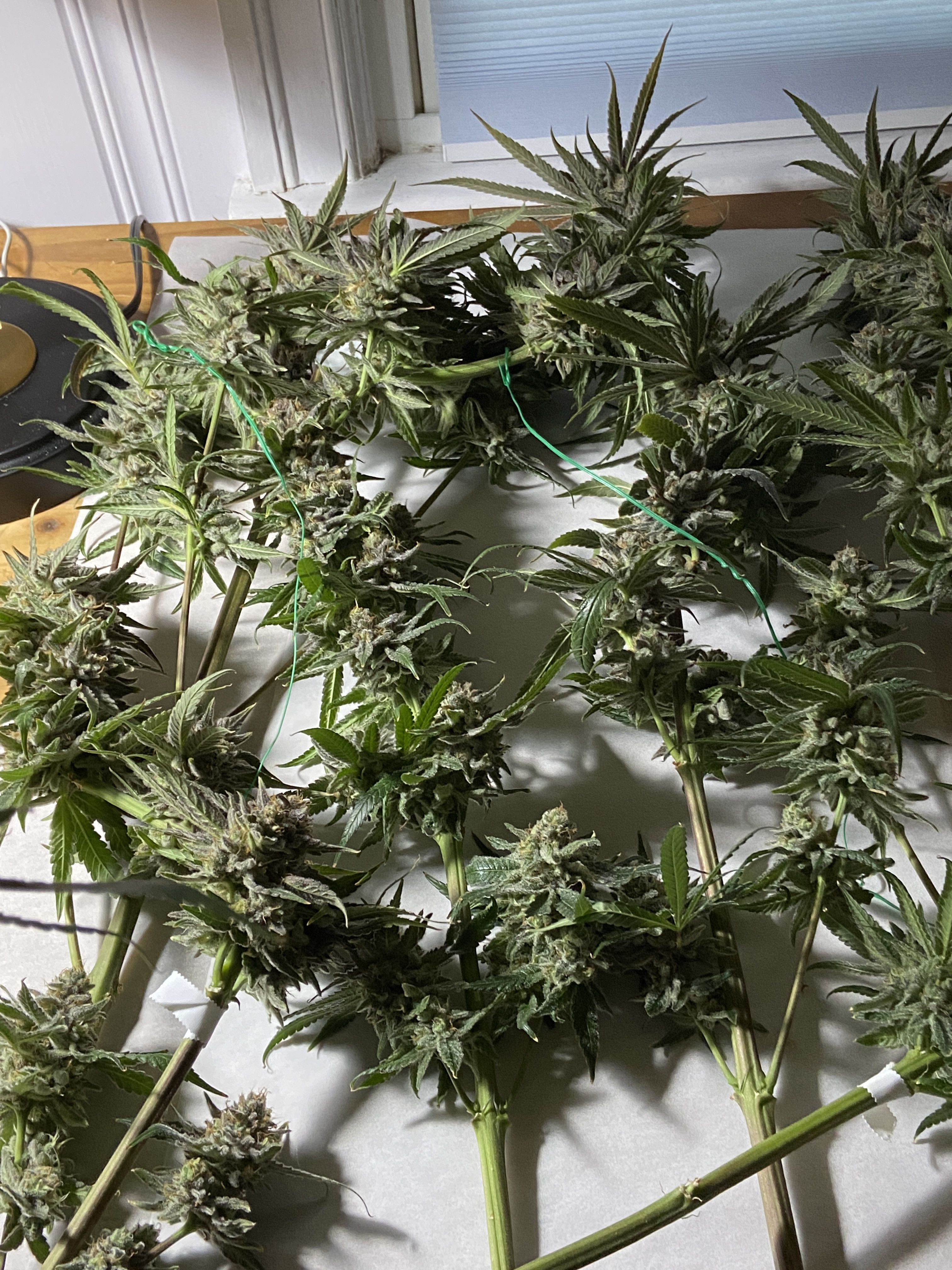 They're still hanging I don't weigh em till they're ready to jar. I leave more branches to but as I trim up the leaves towards the end I cut off anything not really growing or that's hanging upside down and give em to the kids so they’ll leave me alone about samples lol I'll post final weight on it as I jar it