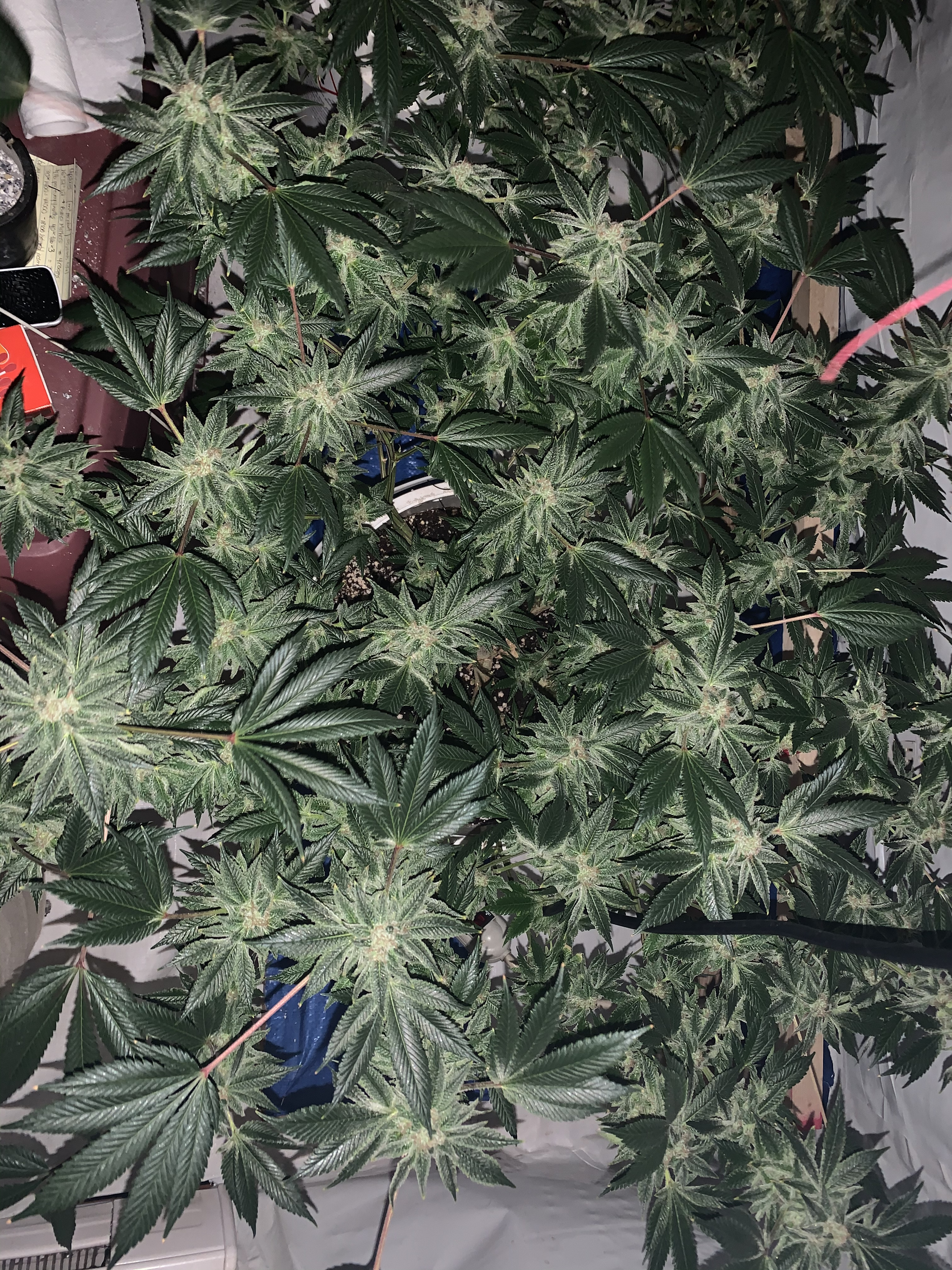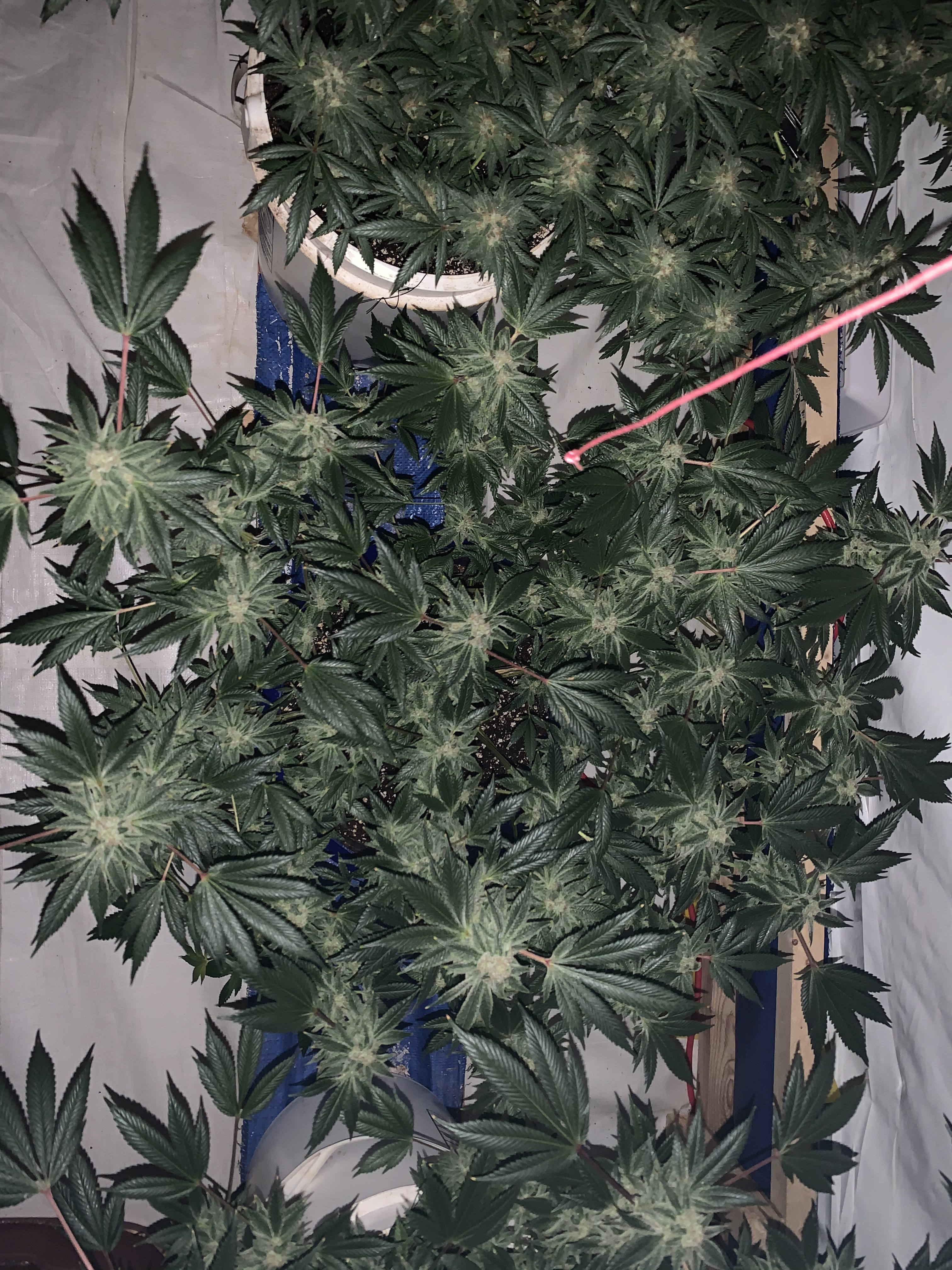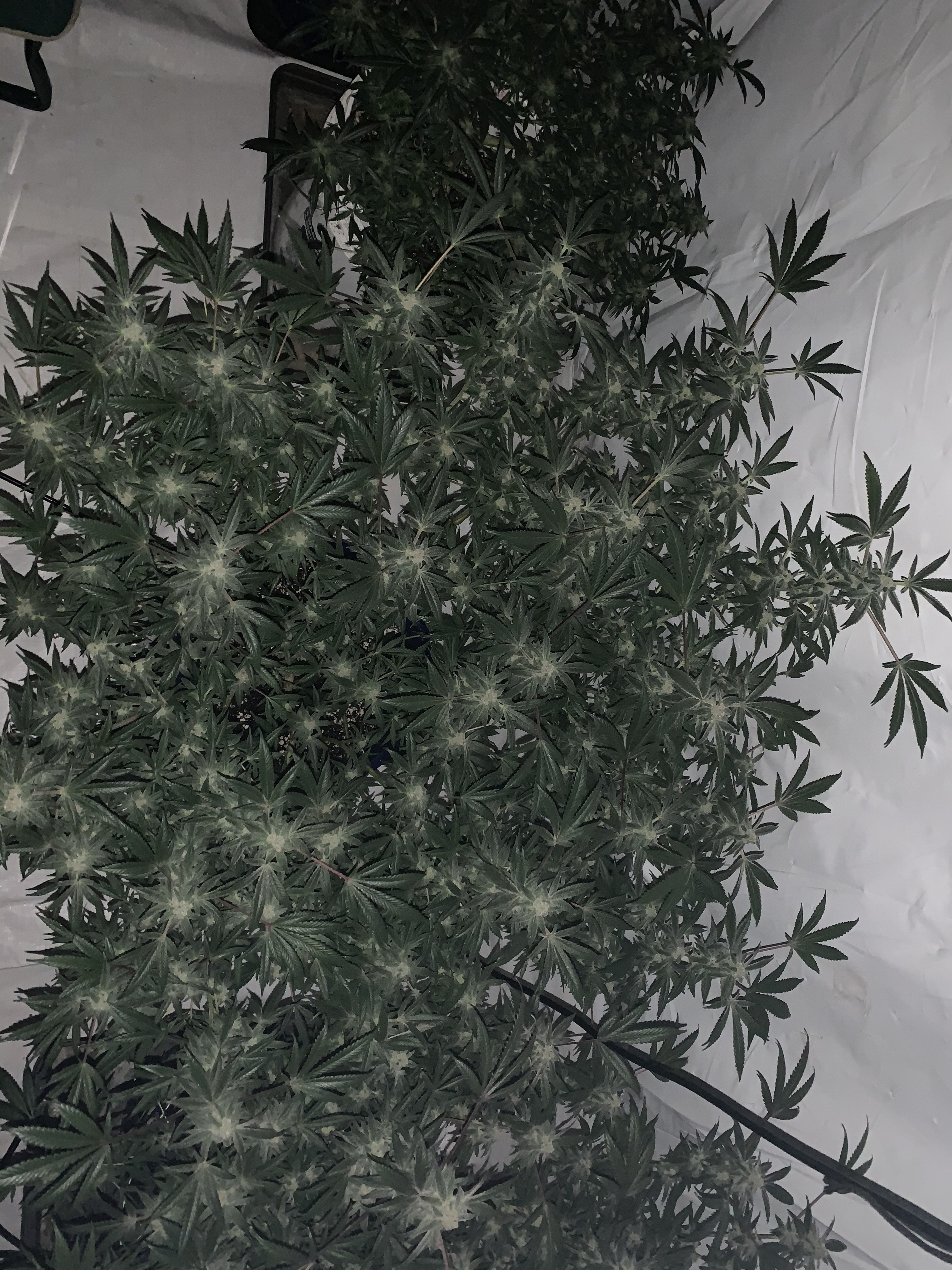 Day 22 of flower. These plants continue to amaze me. After stripping them of 85% of undergrowth they still drink water as fast as a full plant. I left as many big fan leaves as i could to feed the buds..as long as they aren't interfering with other buds i left them on and tucked them under. I havent noticed any major stretch in the last two weeks. probably 5-6 inches. Maybe their just concentrating on building buds. Dropped the lights down to 18" and cranked them back to 70% for a day or few, see if they wanna stretch anymore. If not, im gonna give them as much light as they can handle without toasting them. Oh in the last pics, i left a tie down on a little too long. Its gonna become part of the stem soon..ha10 PhotosShappel S3000 3.5x6x6' ice hut