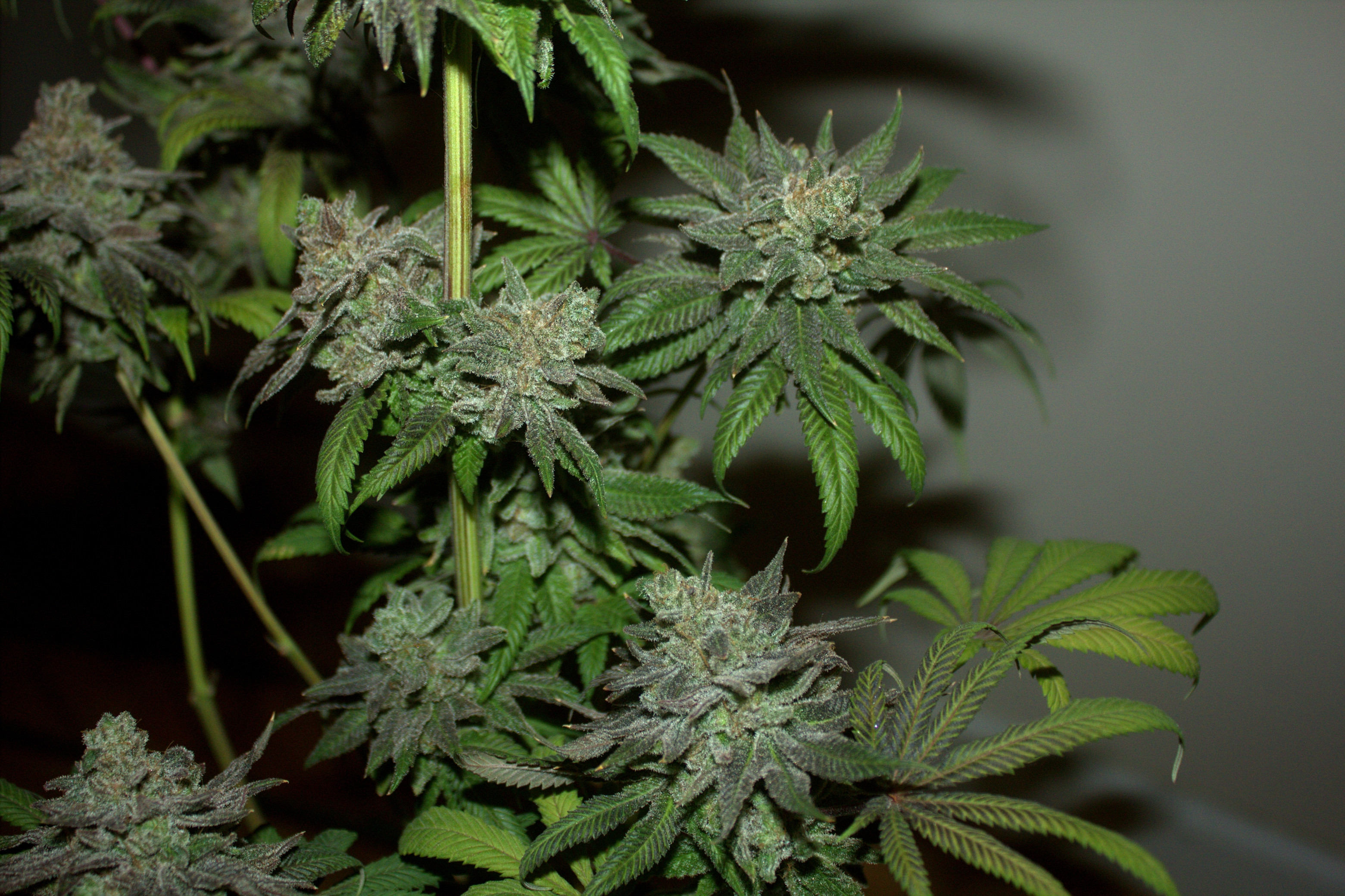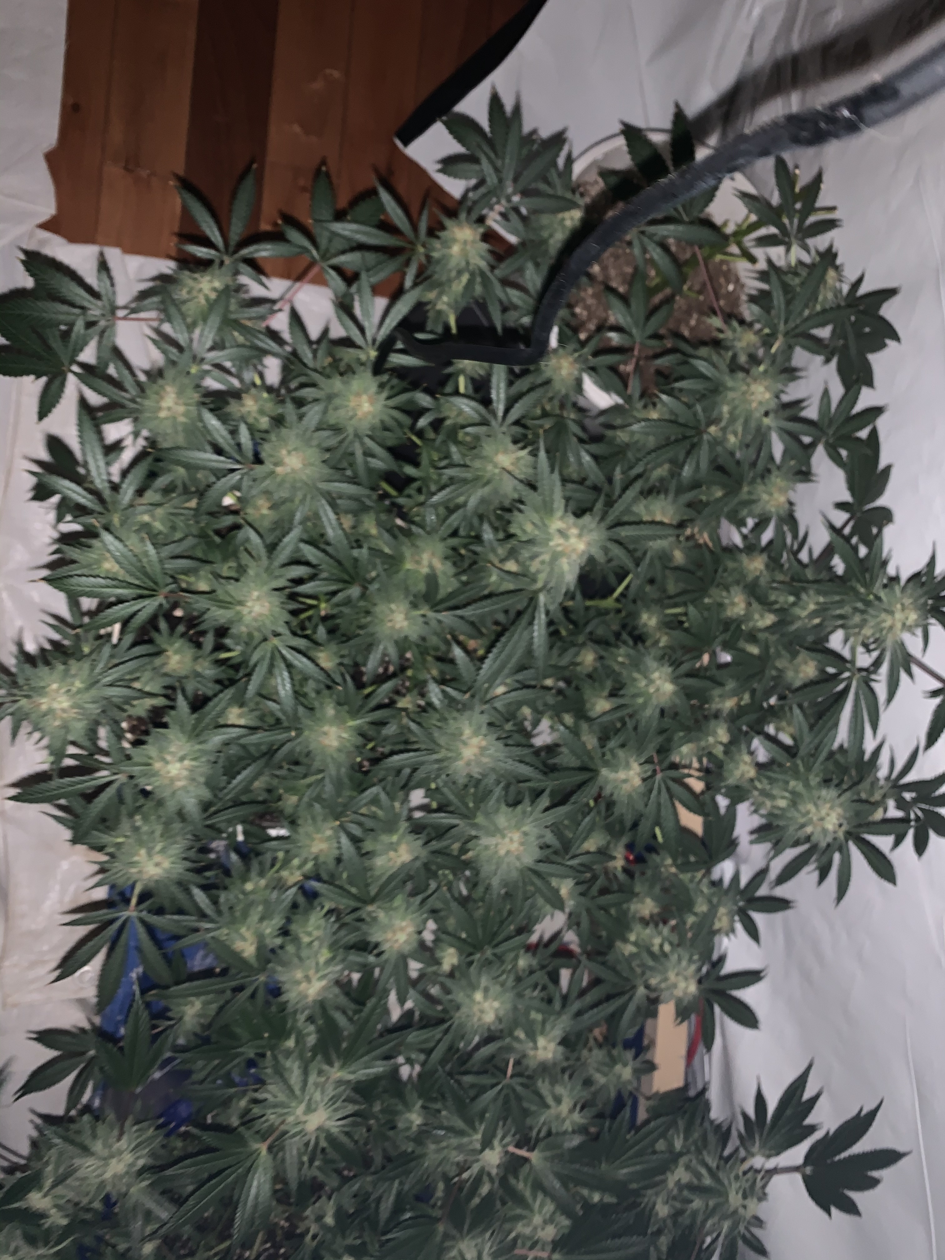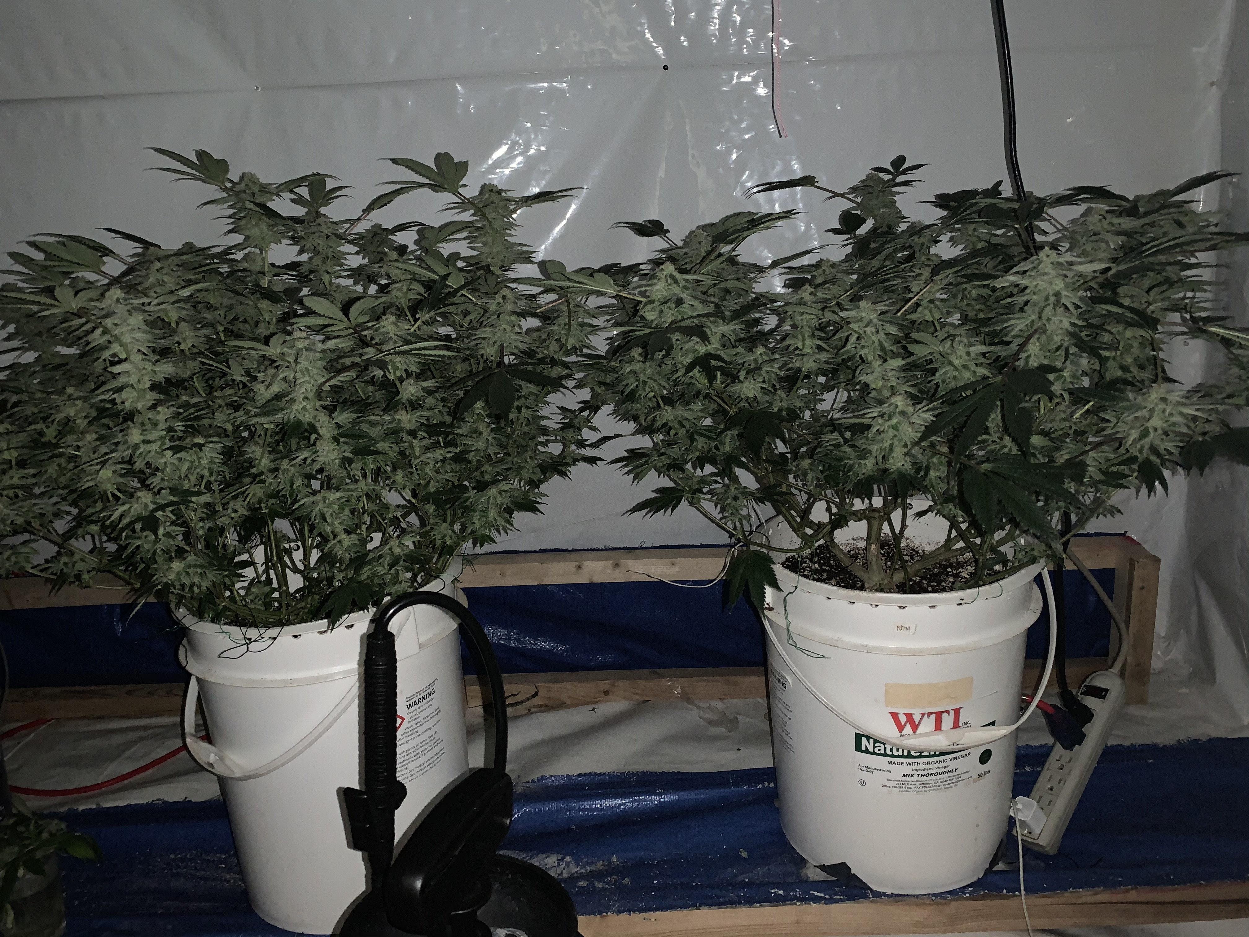 Day 22 of flower. These plants continue to amaze me. After stripping them of 85% of undergrowth they still drink water as fast as a full plant. I left as many big fan leaves as i could to feed the buds..as long as they aren't interfering with other buds i left them on and tucked them under. I havent noticed any major stretch in the last two weeks. probably 5-6 inches. Maybe their just concentrating on building buds. Dropped the lights down to 18" and cranked them back to 70% for a day or few, see if they wanna stretch anymore. If not, im gonna give them as much light as they can handle without toasting them. Oh in the last pics, i left a tie down on a little too long. Its gonna become part of the stem soon..ha10 PhotosShappel S3000 3.5x6x6' ice hut